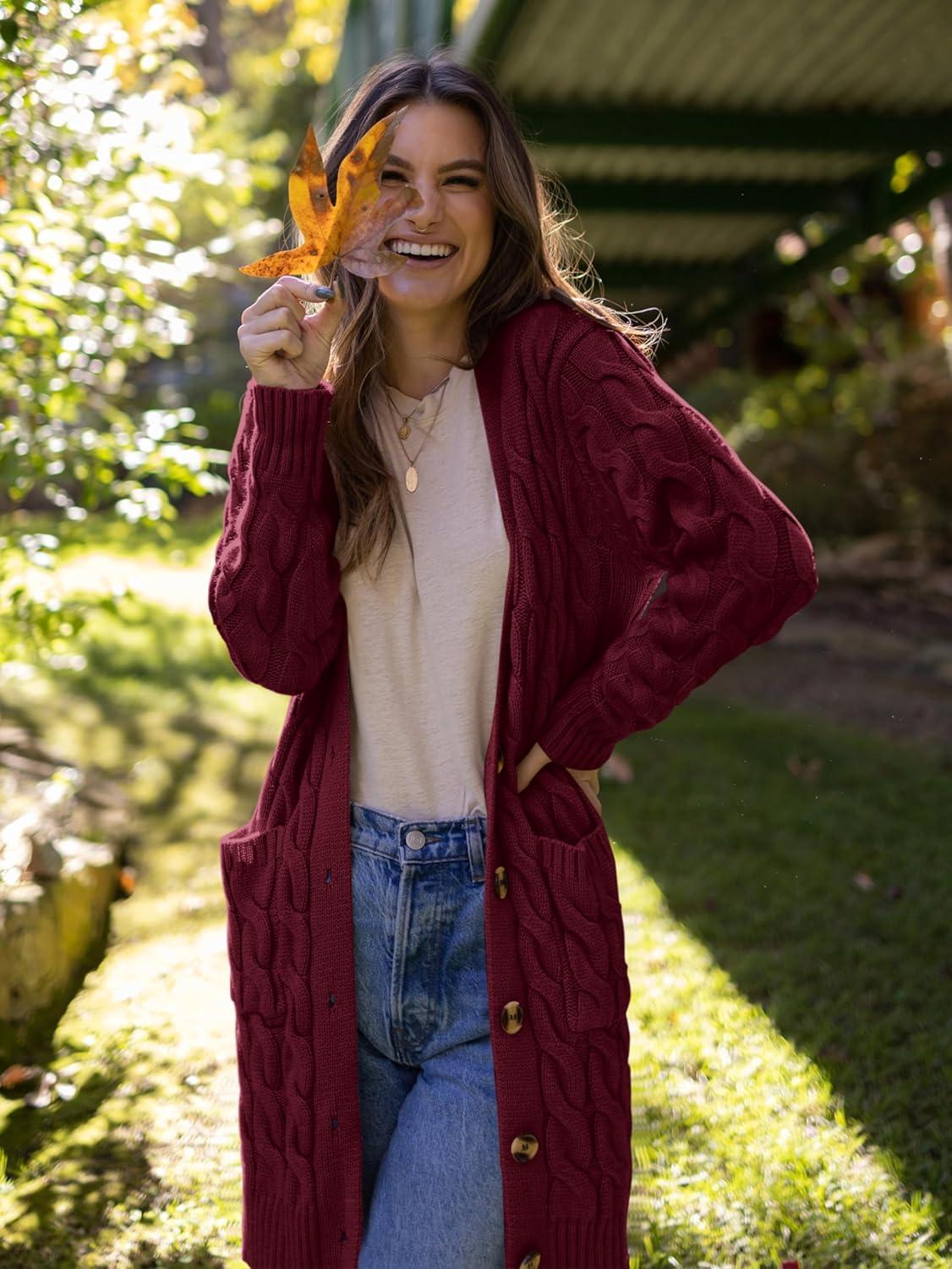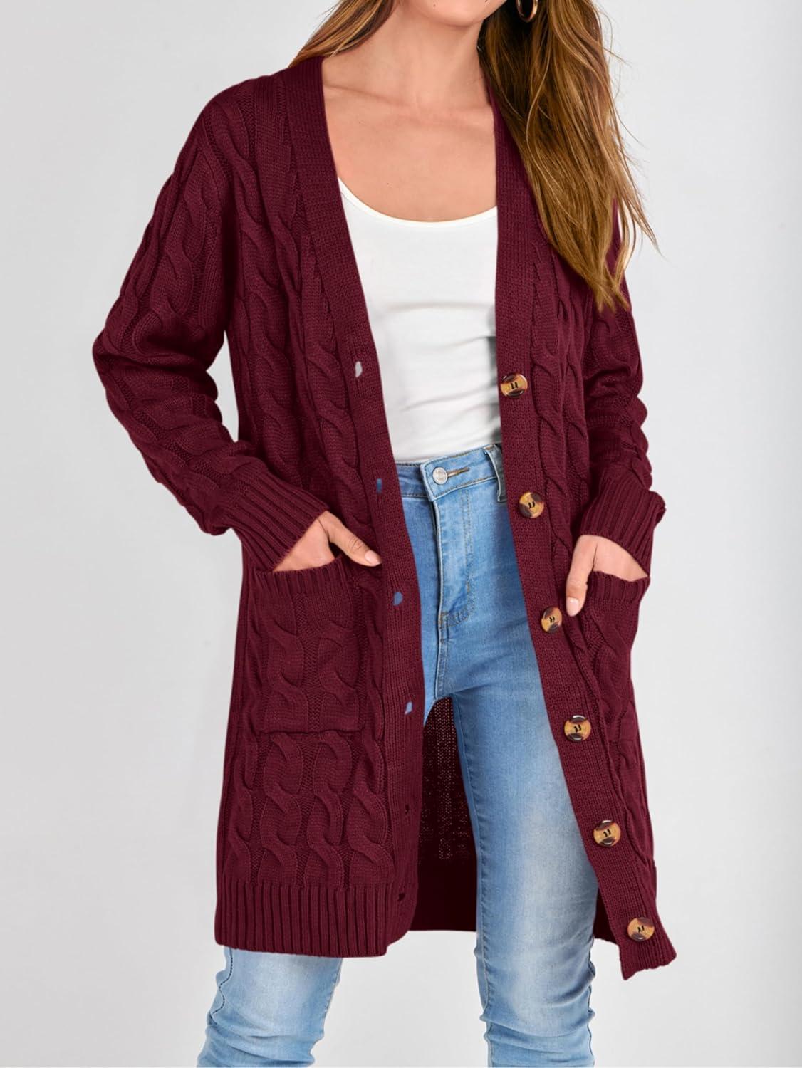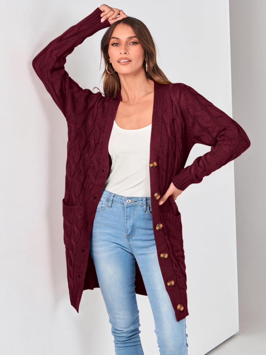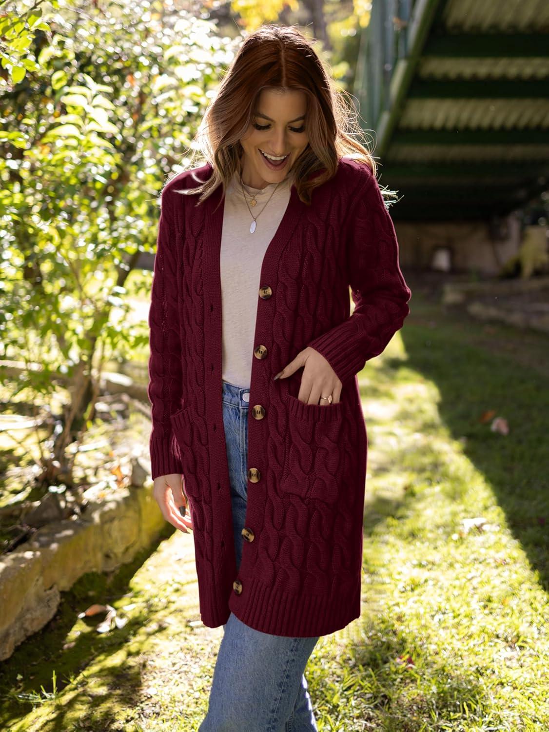 PRETTYGARDEN Long Sleeve Cable Knit Long Cardigan for Women 2025 Fall Winter Chunky Open Front Button Sweaters with Pockets(Wine Red)