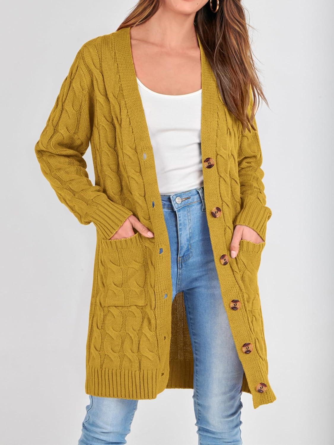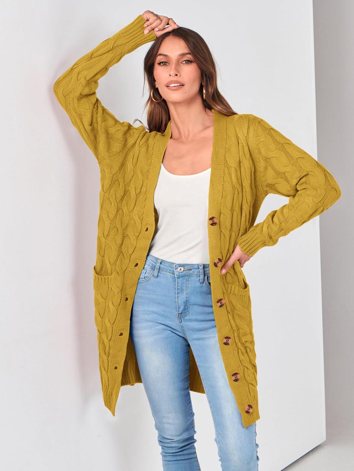 PRETTYGARDEN Long Sleeve Cable Knit Long Cardigan for Women 2025 Fall Winter Chunky Open Front Button Sweaters with Pockets(Yellow)
