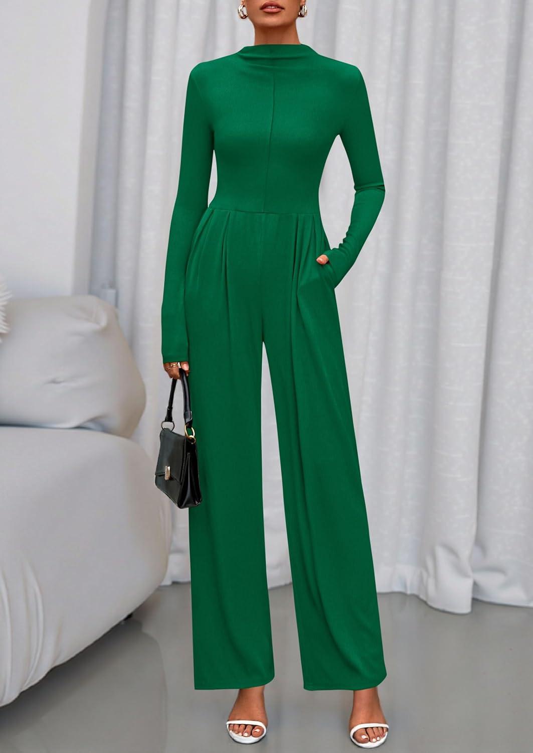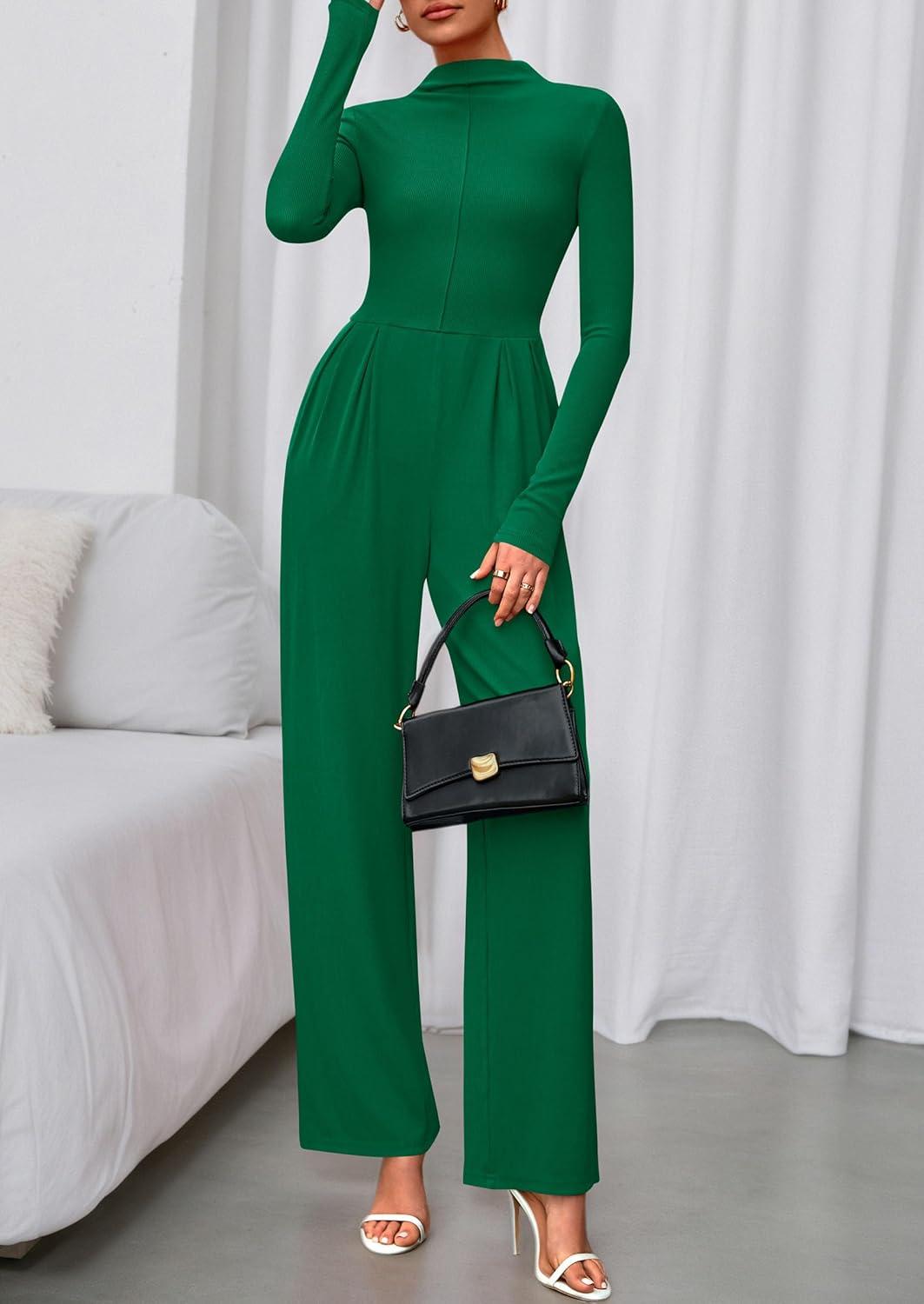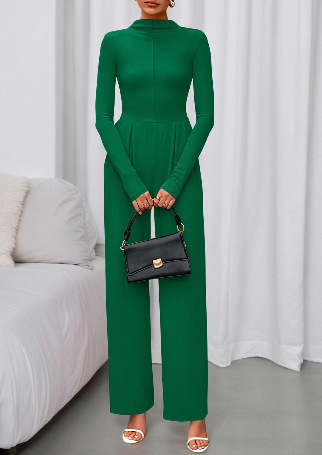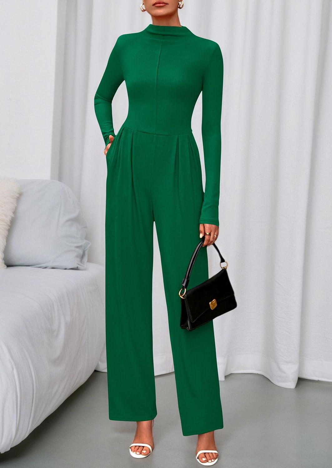 PRETTYGARDEN Long Sleeve Jumpsuit for Women 2025 Fall Date Night Rompers Dressy Casual One Piece Mock Neck Jumpsuits Pockets(Green)