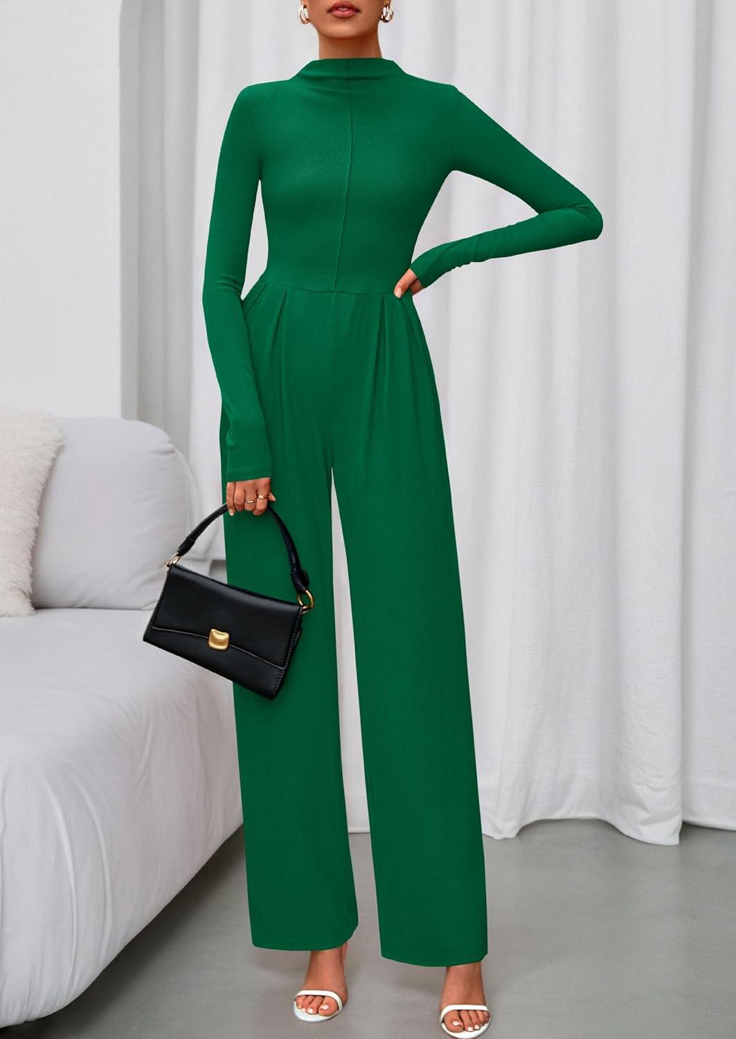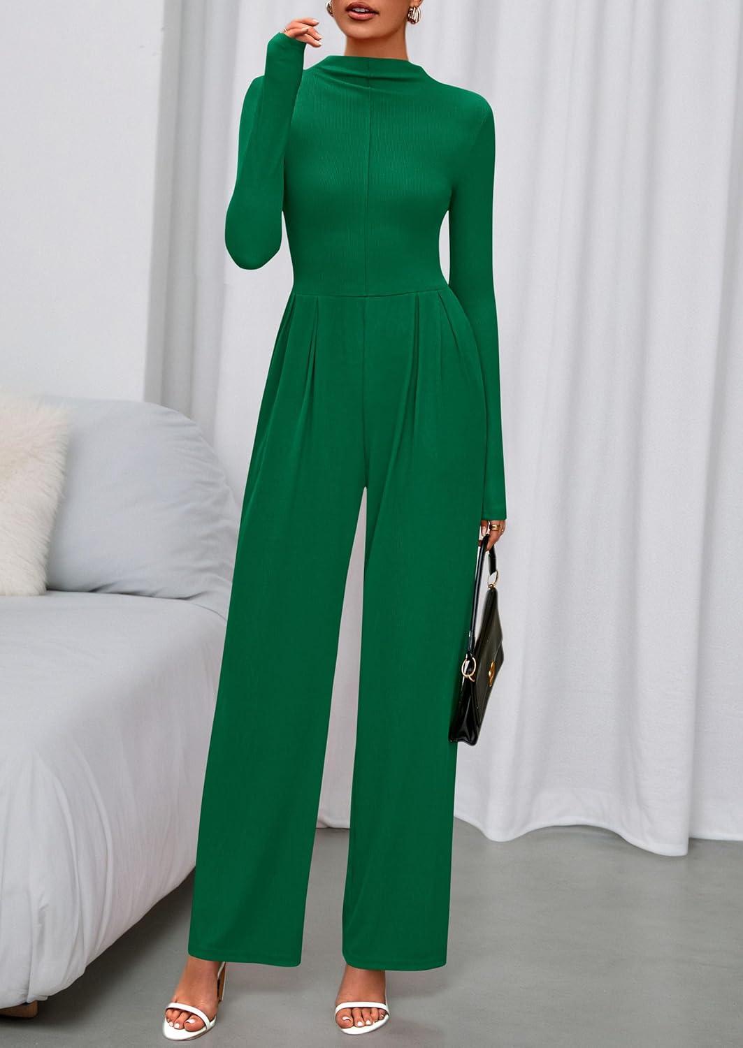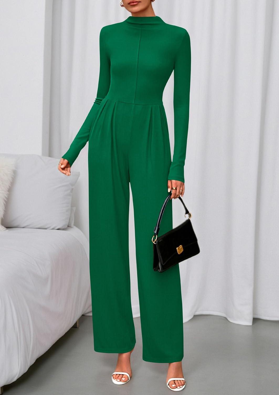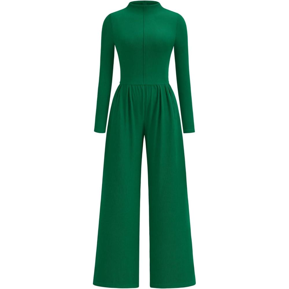 PRETTYGARDEN Long Sleeve Jumpsuit for Women 2025 Fall Date Night Rompers Dressy Casual One Piece Mock Neck Jumpsuits Pockets(Green)
