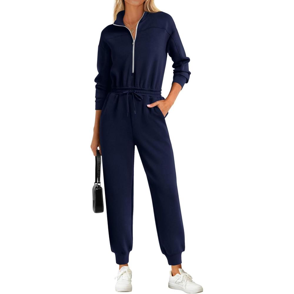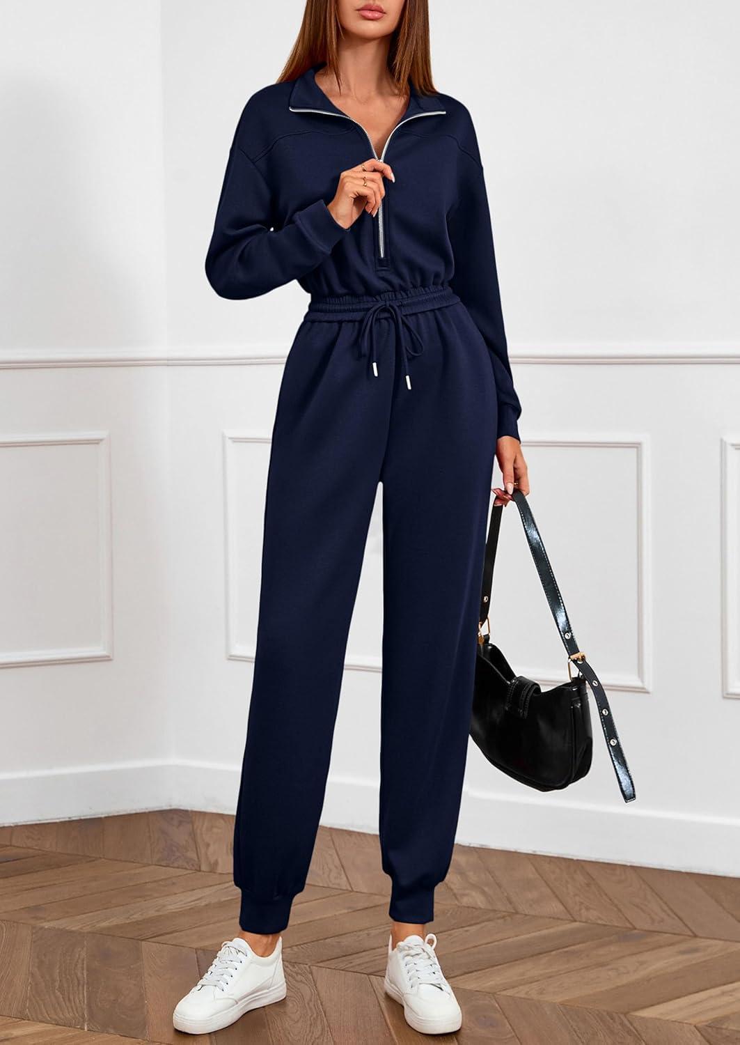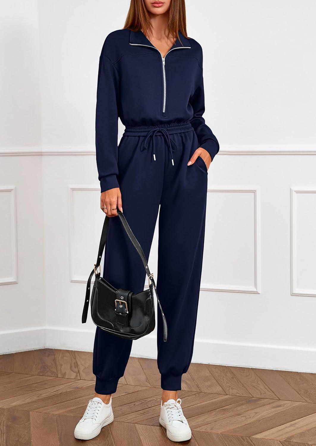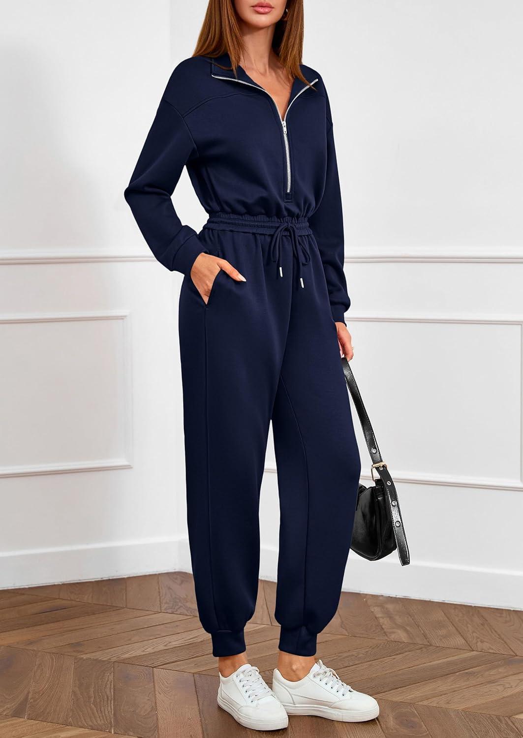 PRETTYGARDEN Long Sleeve Jumpsuits for Women Casual 2025 Fall Fashion Zip Up Pant Rompers One Piece Sweatsuits Travel Outfits(Navy Blue)