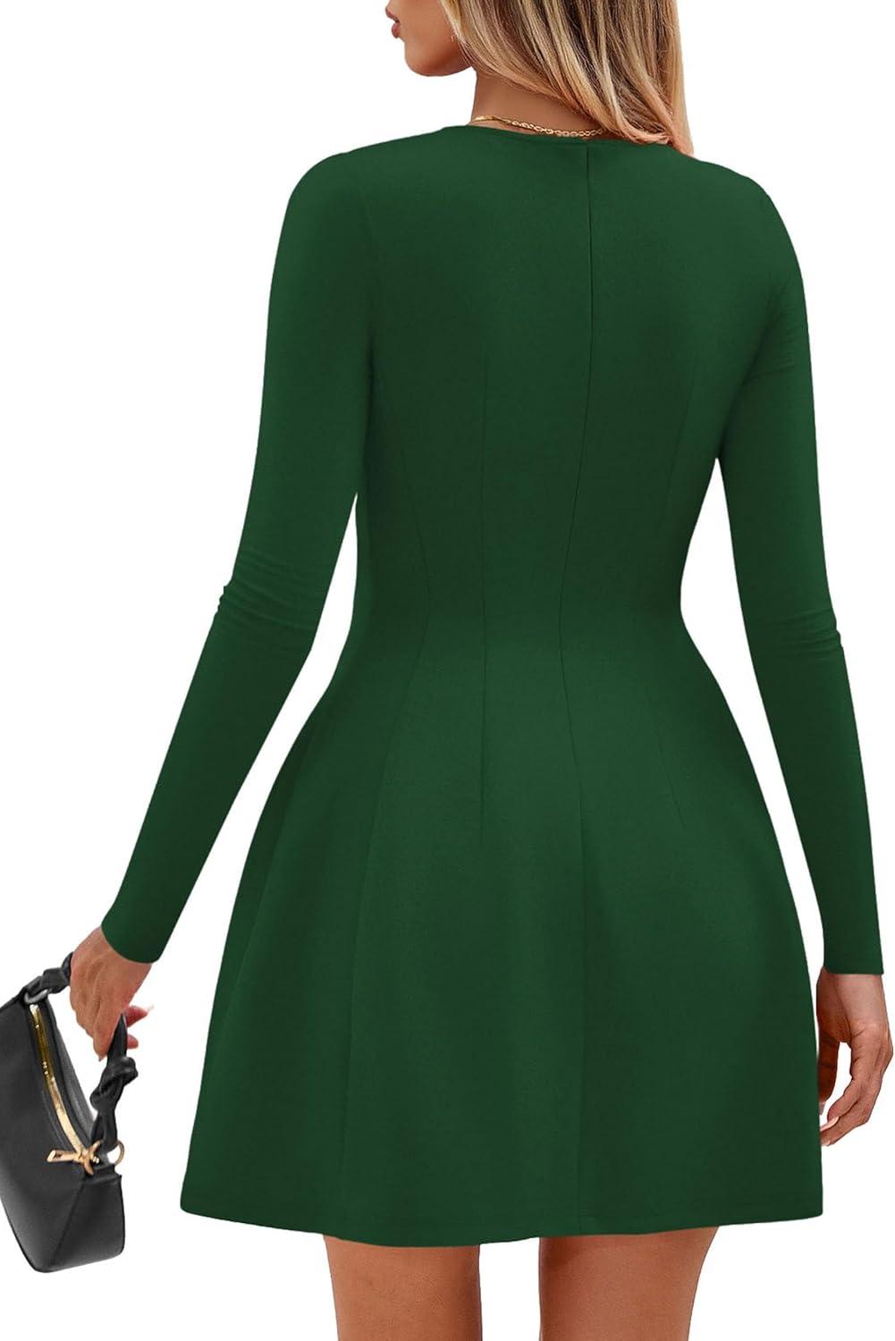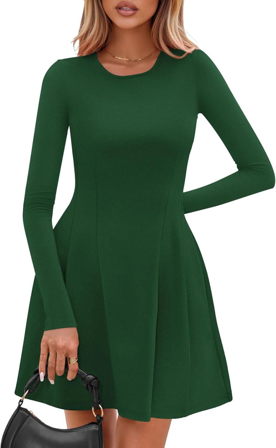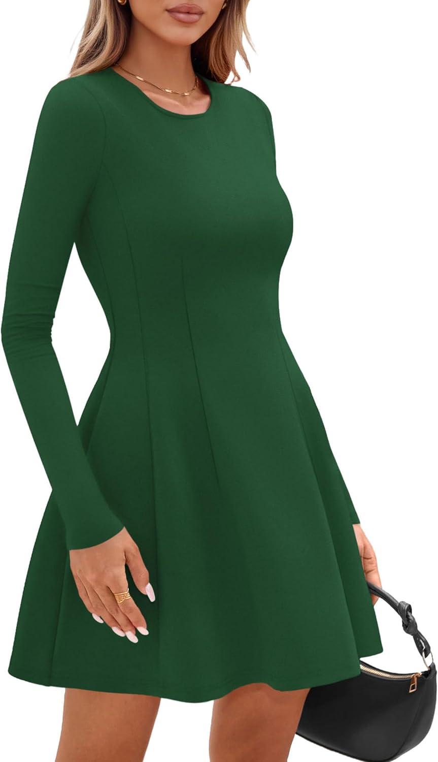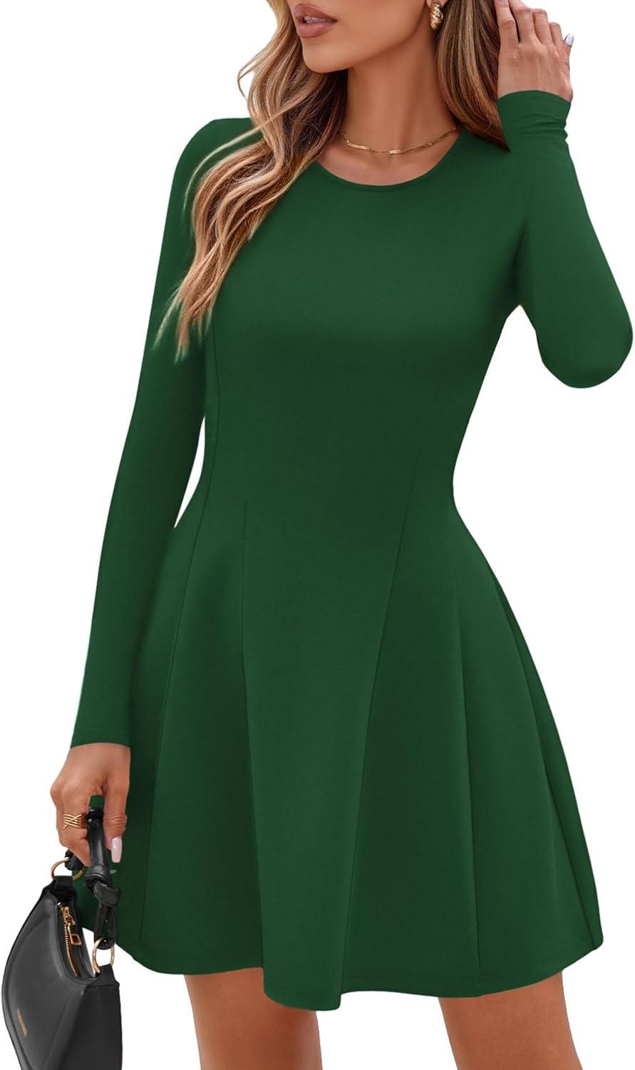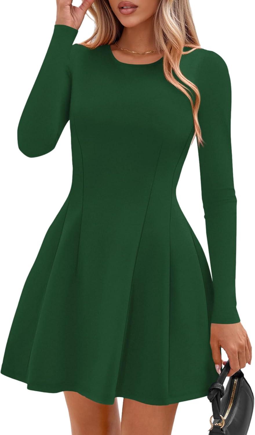 PRETTYGARDEN Long Sleeve Mini Dress for Women 2025 Fall Crewneck Knit Pleated Babydoll A Line Soft Casual Short Party Dresses(Green)