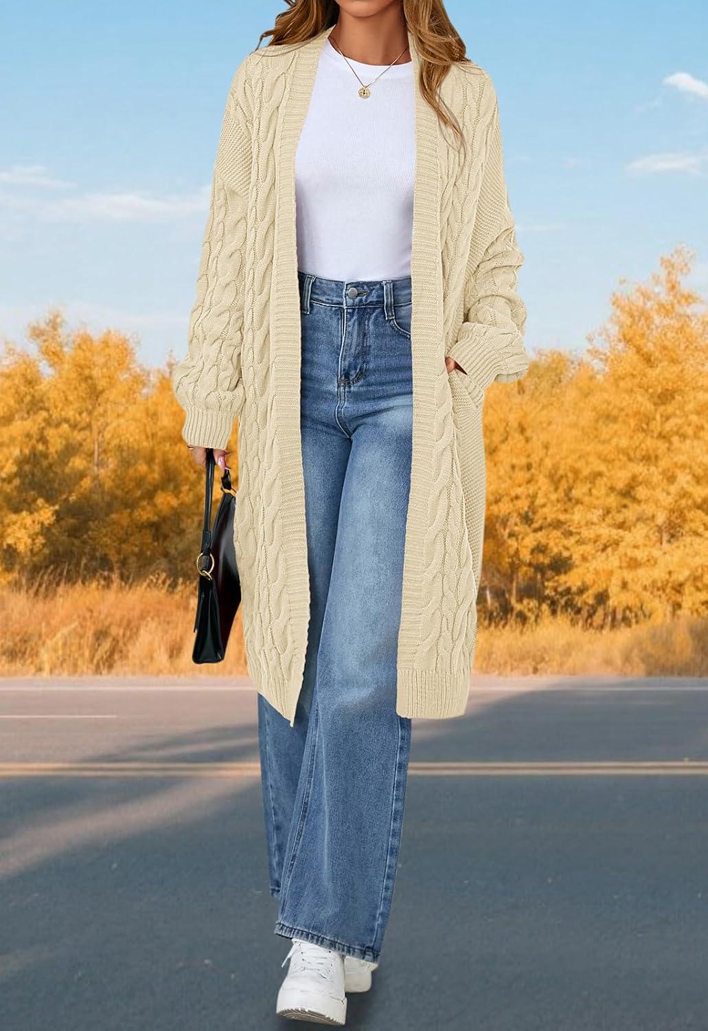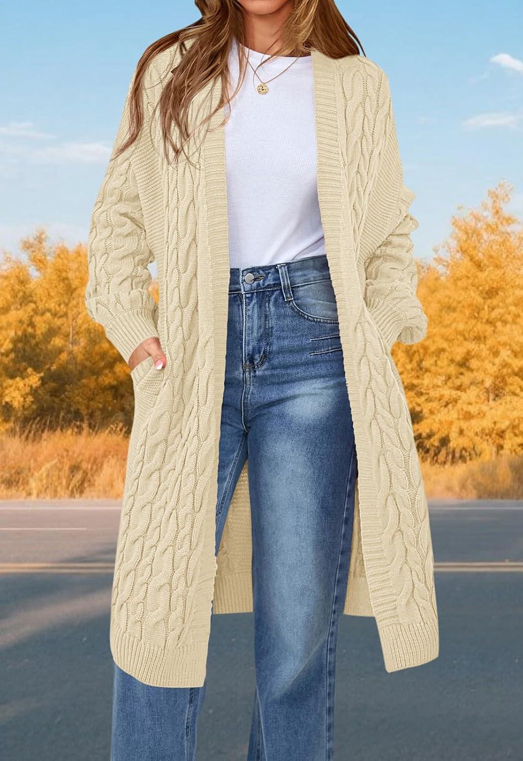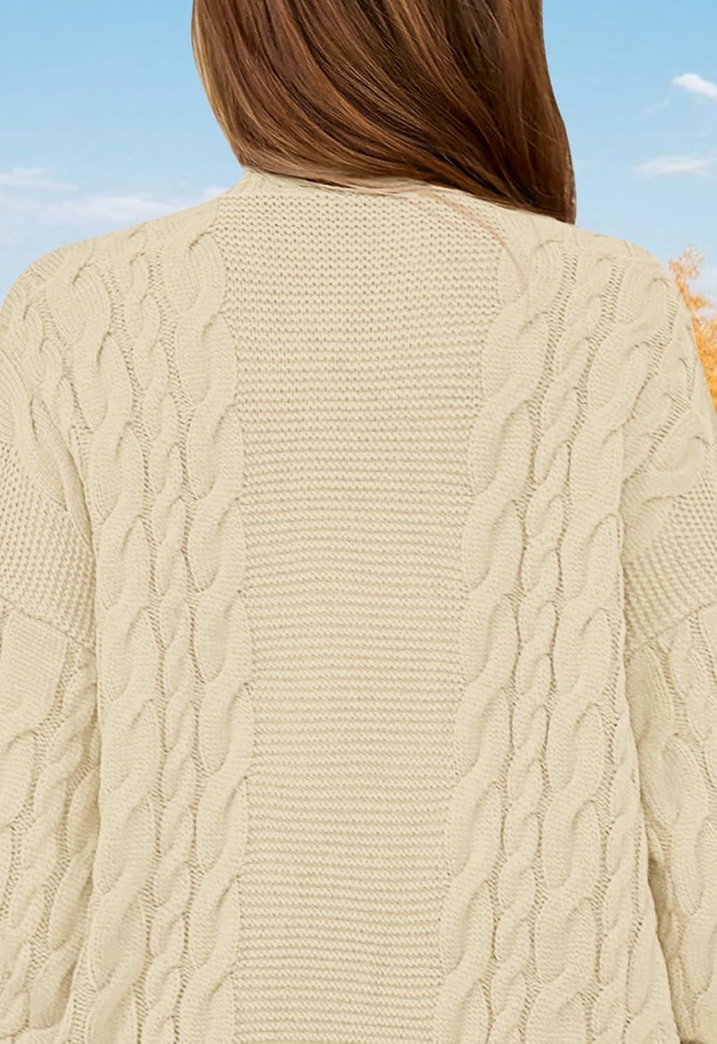 PRETTYGARDEN Long Sleeve Open Front Chunky Cardigan Sweaters for Women Cable Knit Long Cardigans Fall Outfits with Pockets(Apricot)