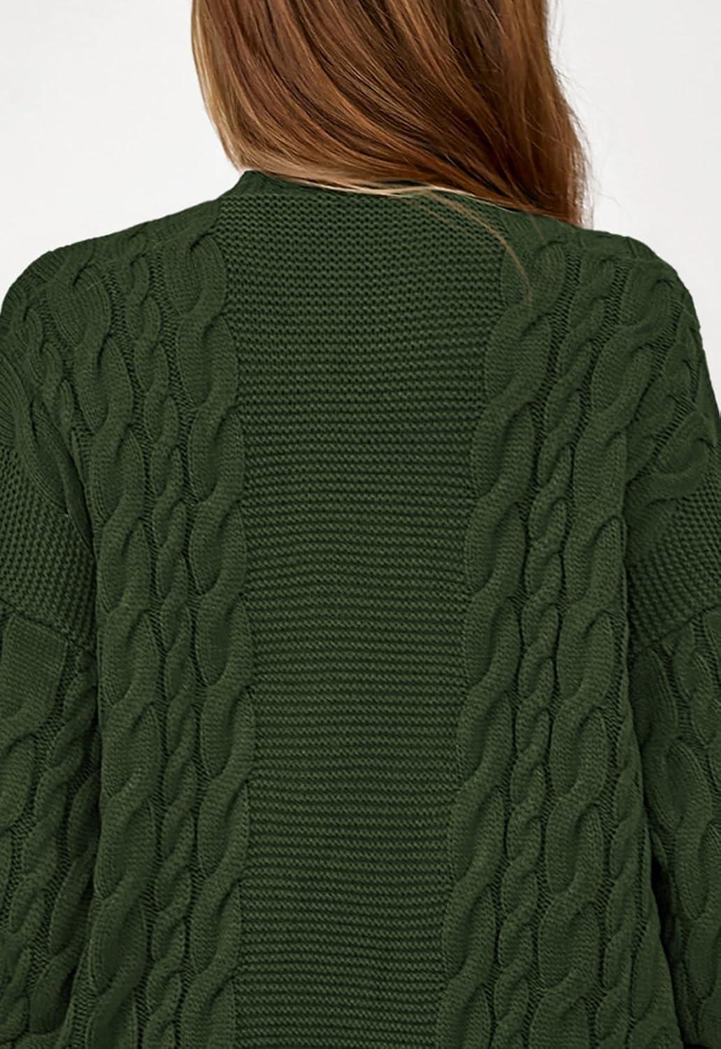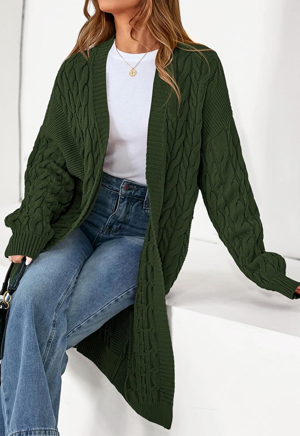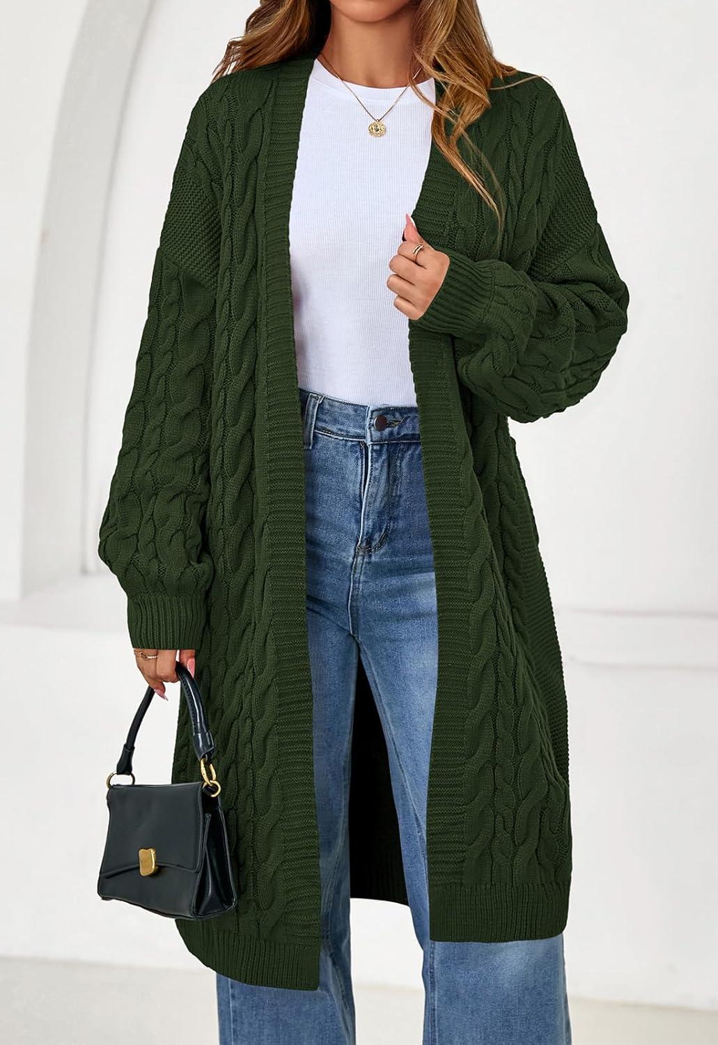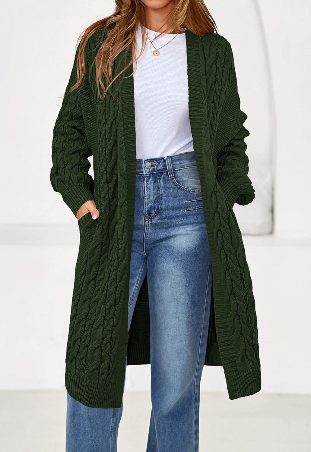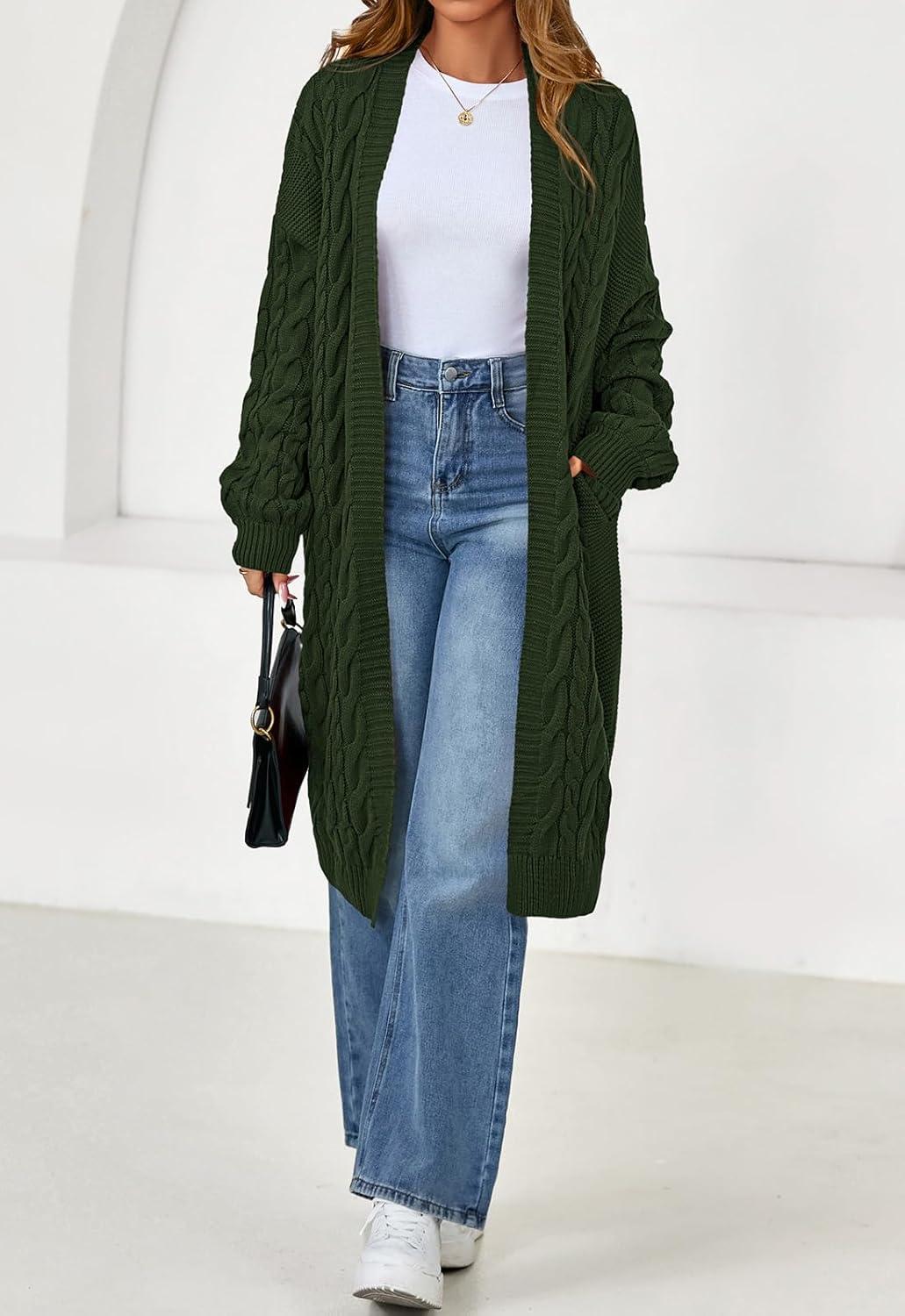 PRETTYGARDEN Long Sleeve Open Front Chunky Cardigan Sweaters for Women Cable Knit Long Cardigans Fall Outfits with Pockets(Army Green)