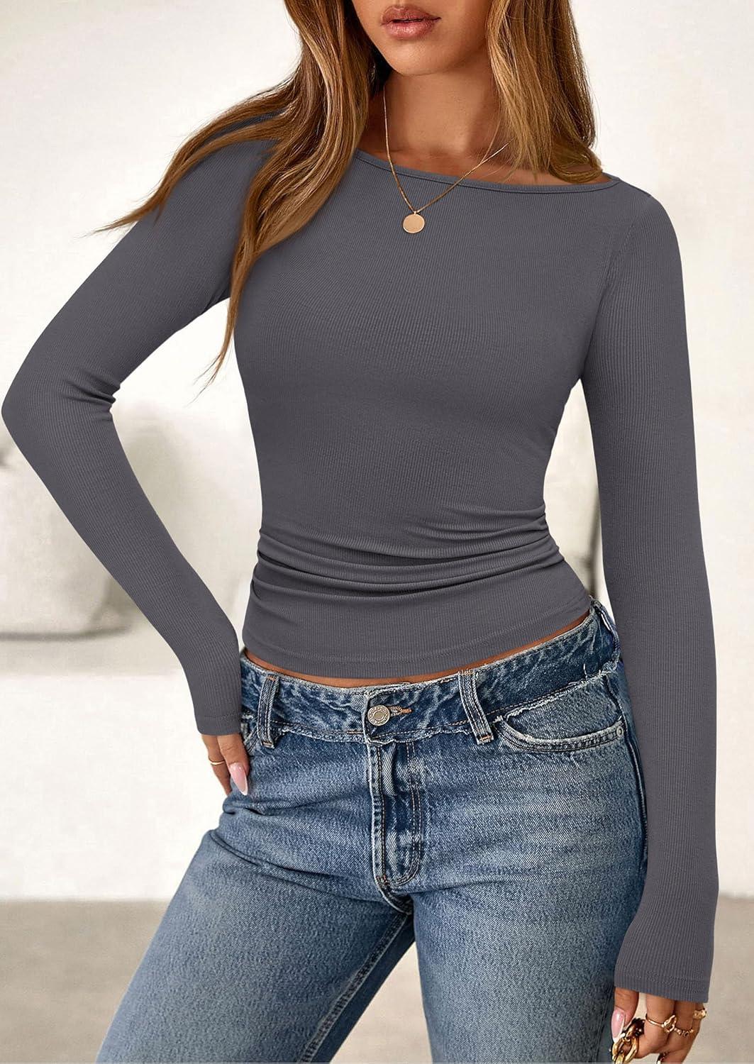 PRETTYGARDEN Long Sleeve Shirts for Women 2025 Fall Boat Neck Ribbed Knit Ruched Fitted Going Out Tops Casual Basic Tees(Dark Grey)