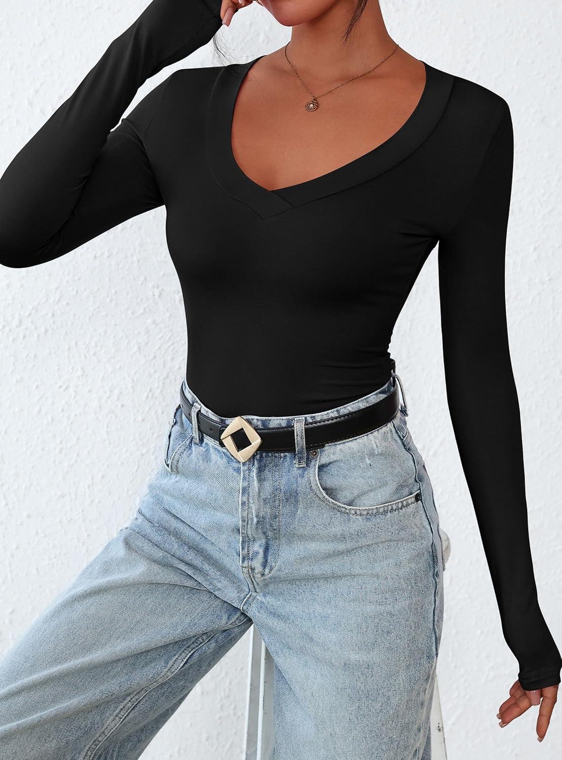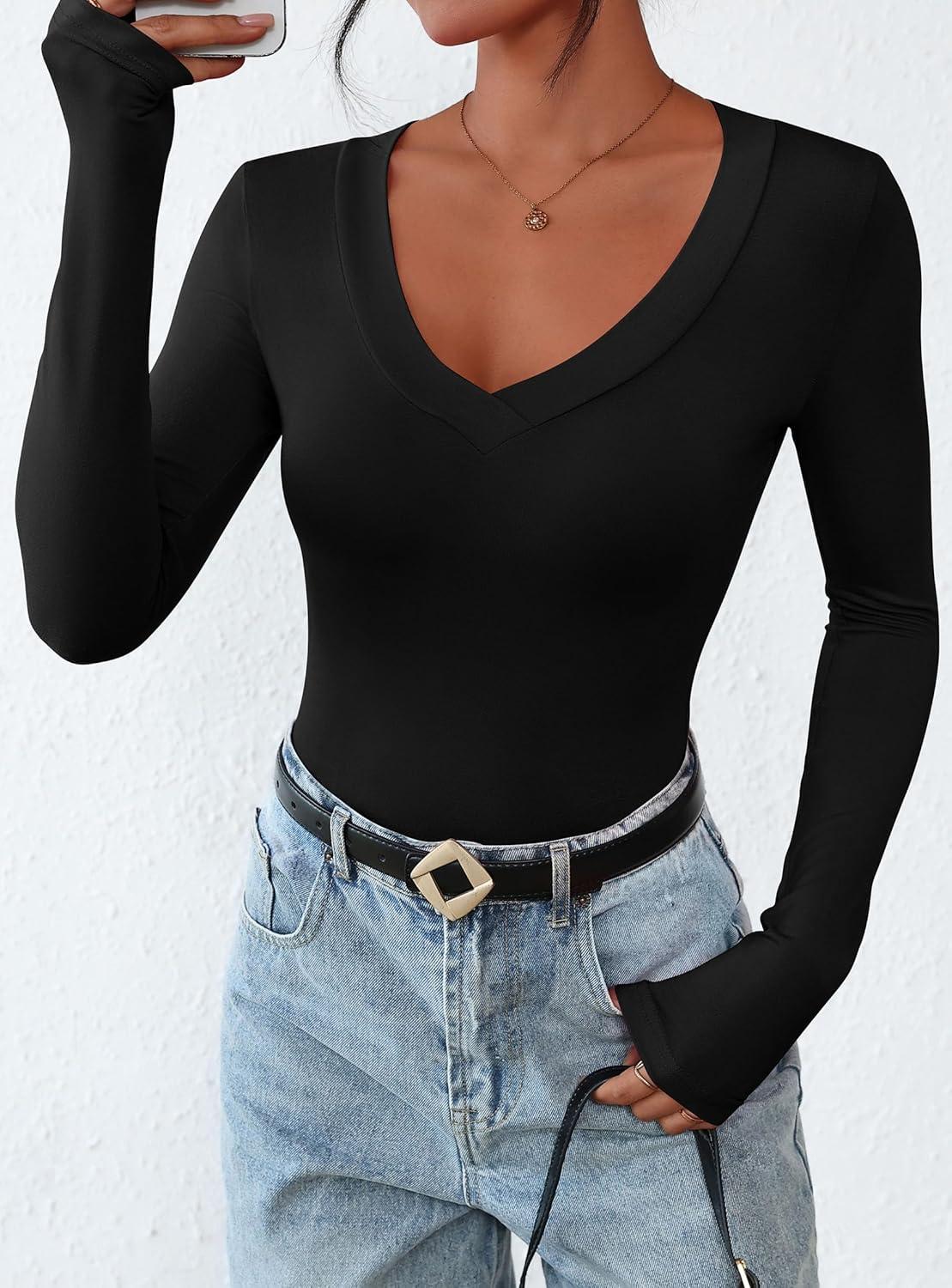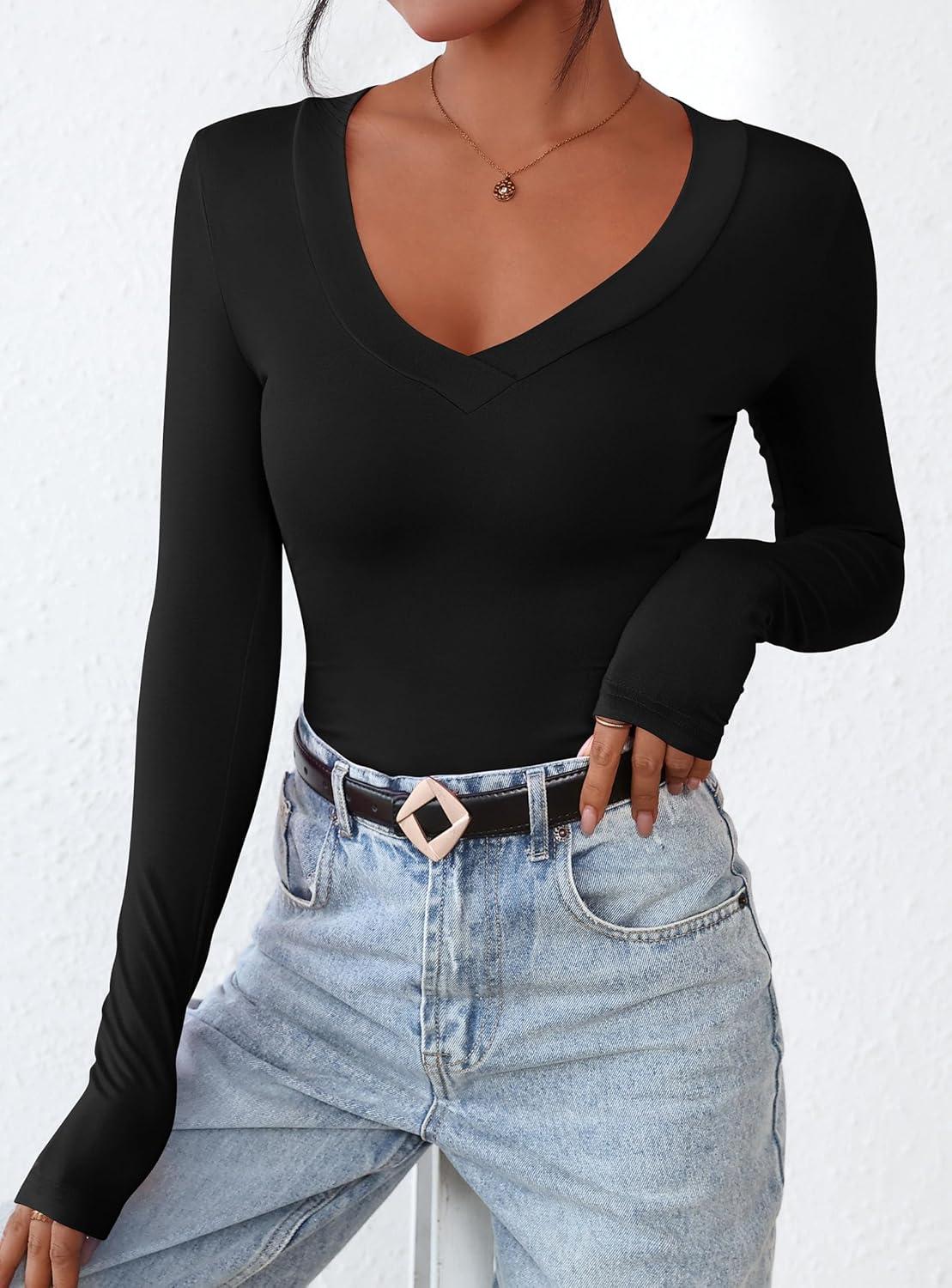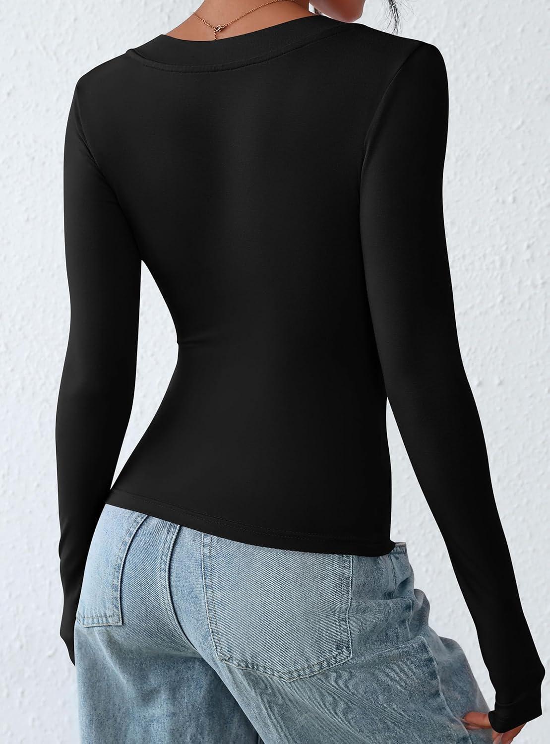 PRETTYGARDEN Long Sleeve Shirts for Women 2025 Fall Fashion V Neck Going Out Tops Slim Fit Basic Tees Y2K Clothes(Black)