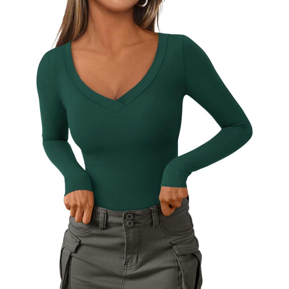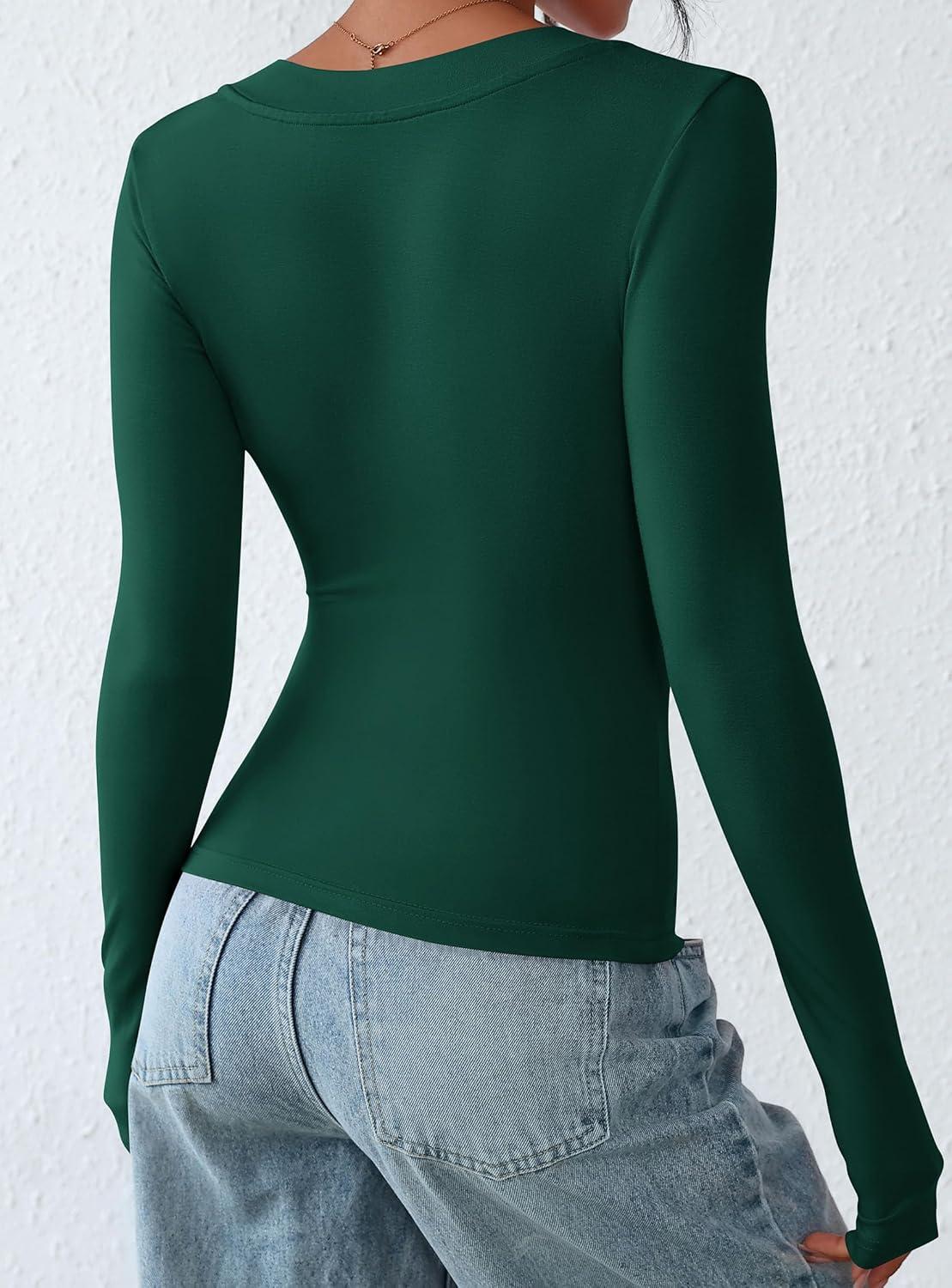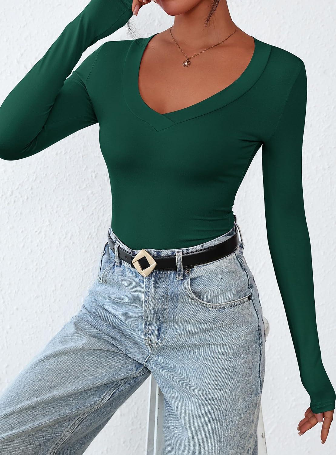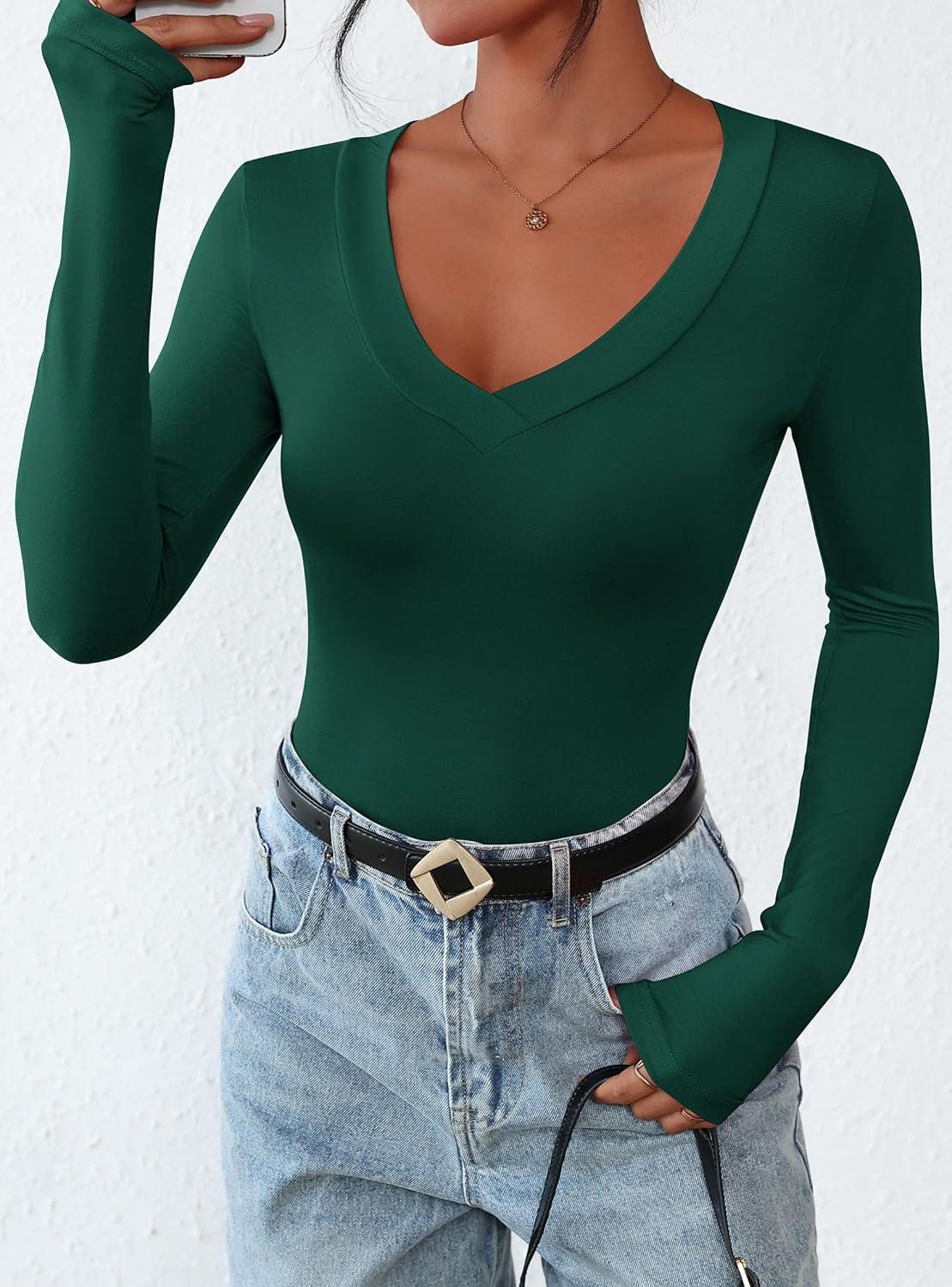 PRETTYGARDEN Long Sleeve Shirts for Women 2025 Fall Fashion V Neck Going Out Tops Slim Fit Basic Tees Y2K Clothes(Dark Green)