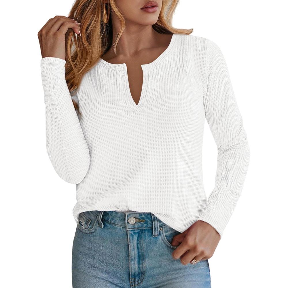 PRETTYGARDEN Long Sleeve Shirts for Women 2025 Fall V Neck Waffle Basic Tee Dressy Casual Winter Blouses Knit Tunic Tops(White)