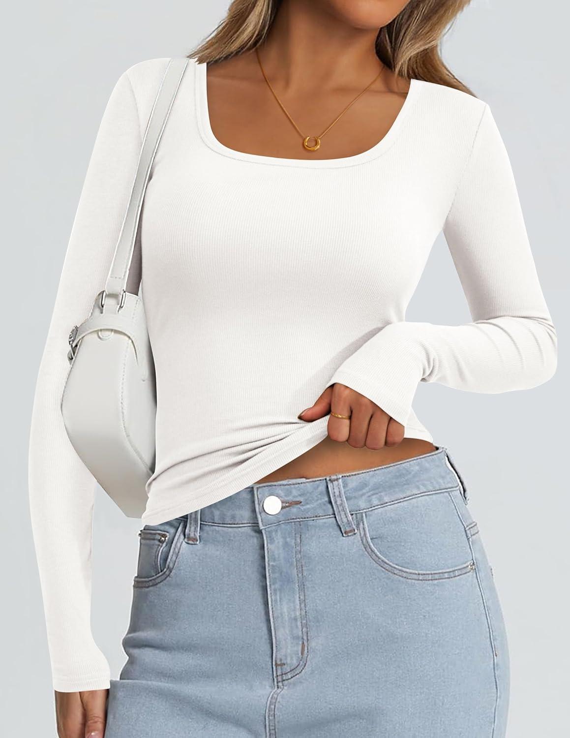 PRETTYGARDEN Long Sleeve Shirts for Women Fall Outfits 2025 Ribbed Basic Tees Scoop Neck Going Out Tops Fashion Clothing(White)