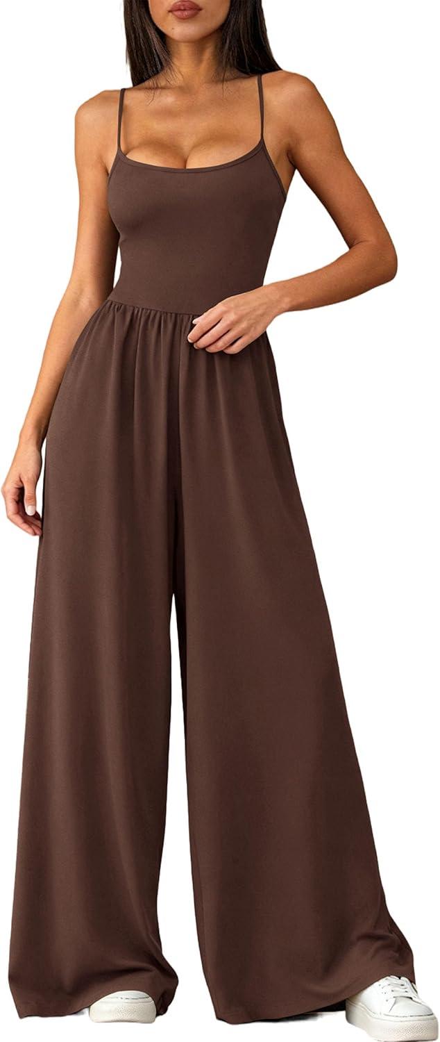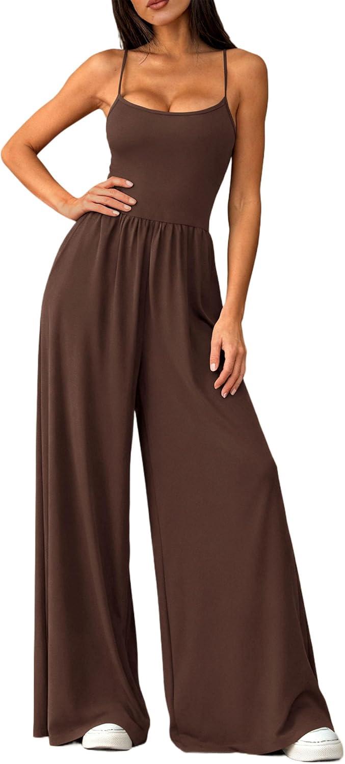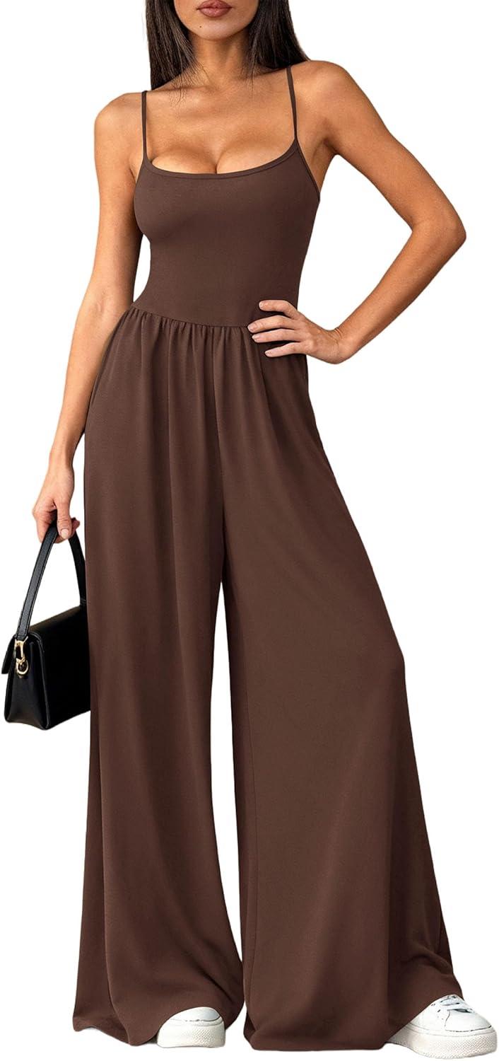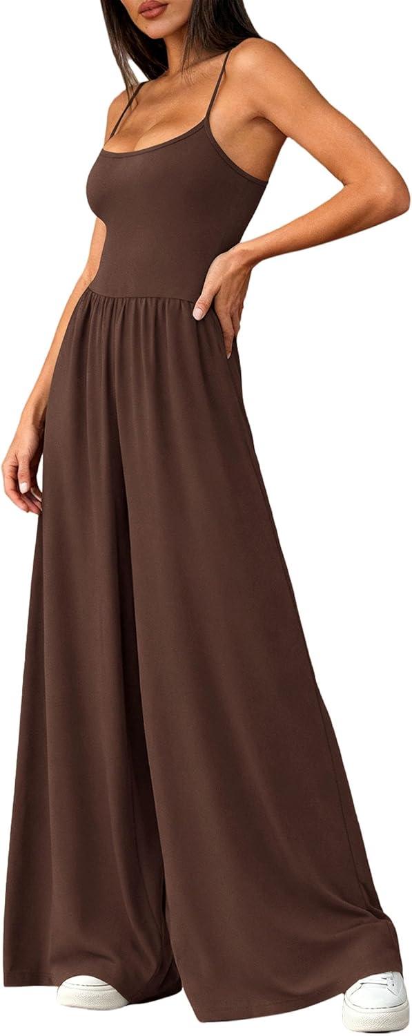 PRETTYGARDEN Summer Jumpsuits for Women Casual 2026 Wide Leg Date Night Rompers Sleeveless Beach Vacation One Piece Outfits(Brown)
