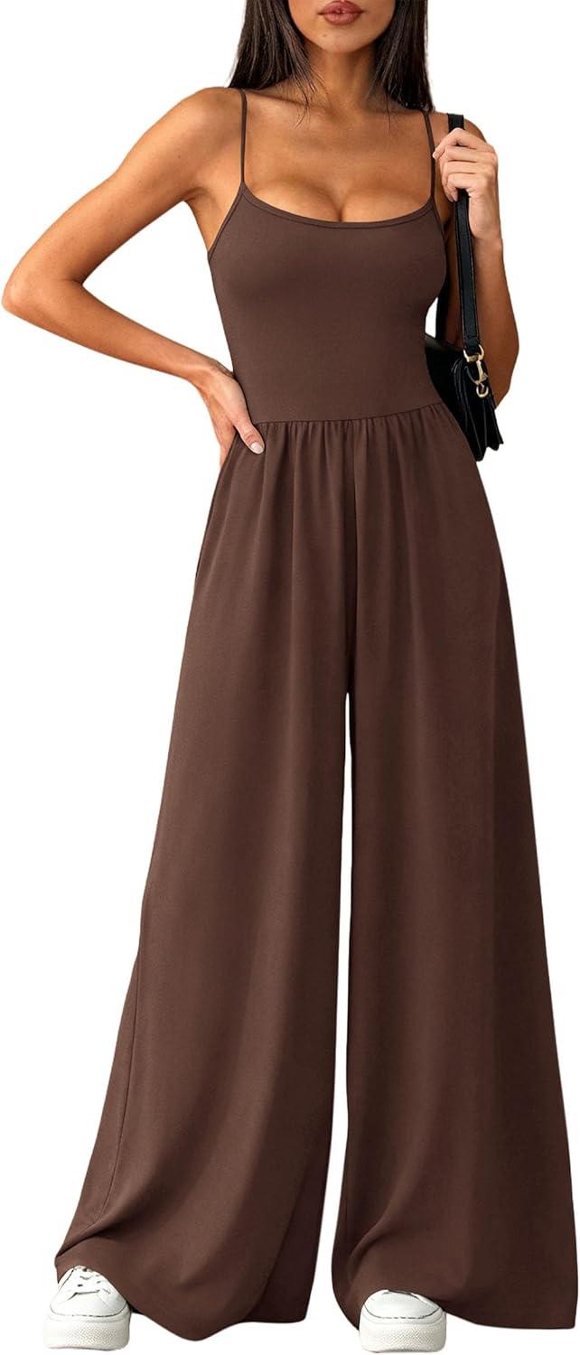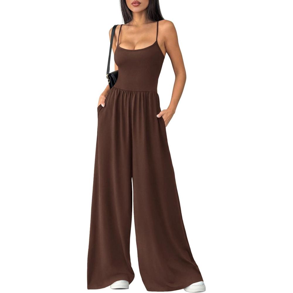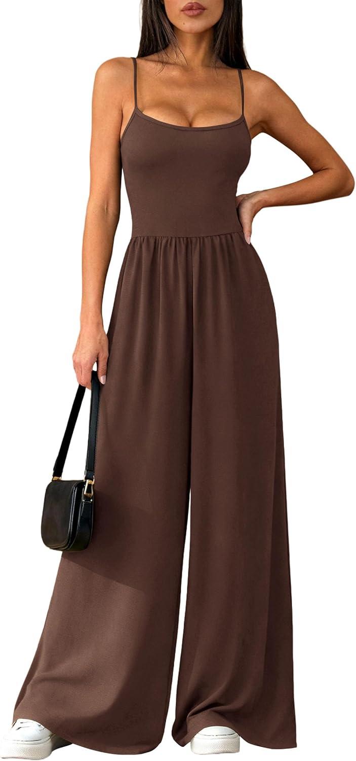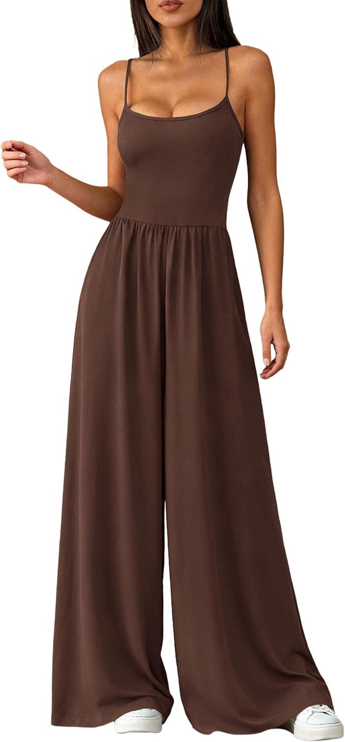 PRETTYGARDEN Summer Jumpsuits for Women Casual 2026 Wide Leg Date Night Rompers Sleeveless Beach Vacation One Piece Outfits(Brown)