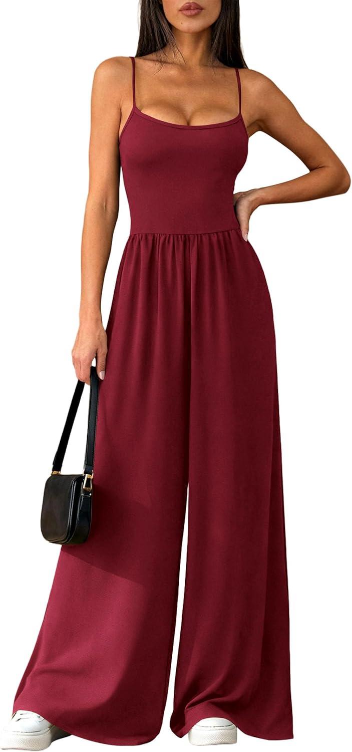 PRETTYGARDEN Summer Jumpsuits for Women Casual 2026 Wide Leg Date Night Rompers Sleeveless Beach Vacation One Piece Outfits(Wine Red)