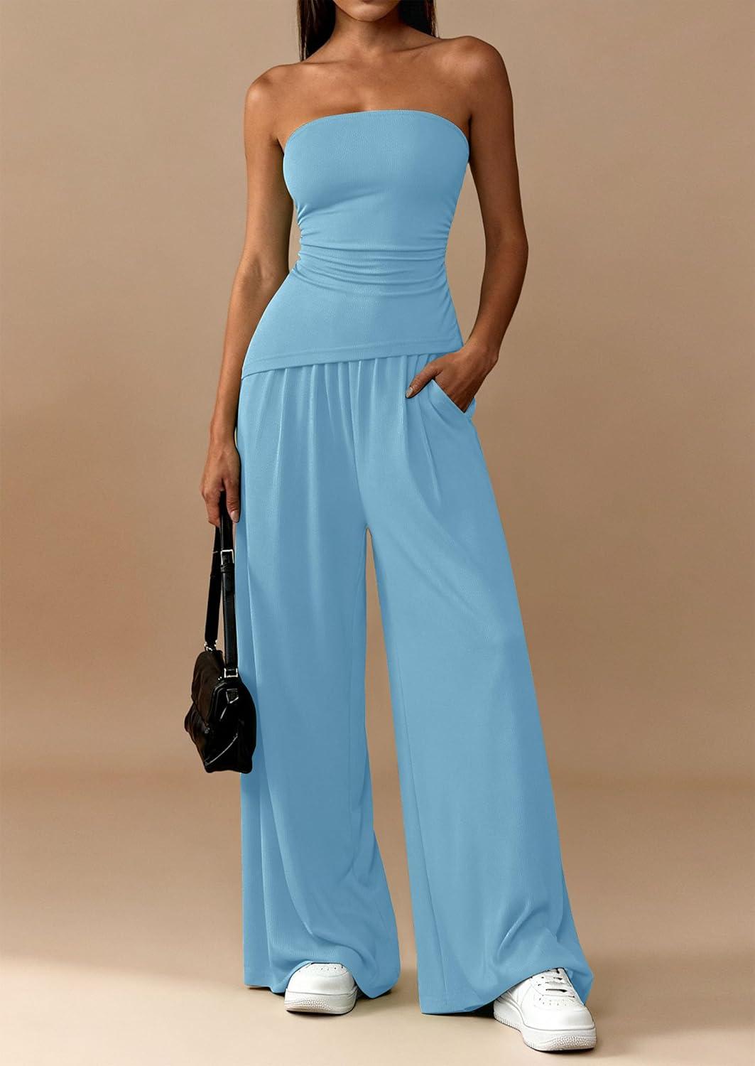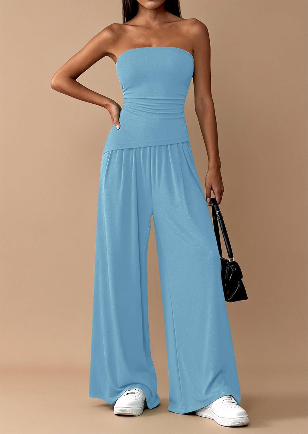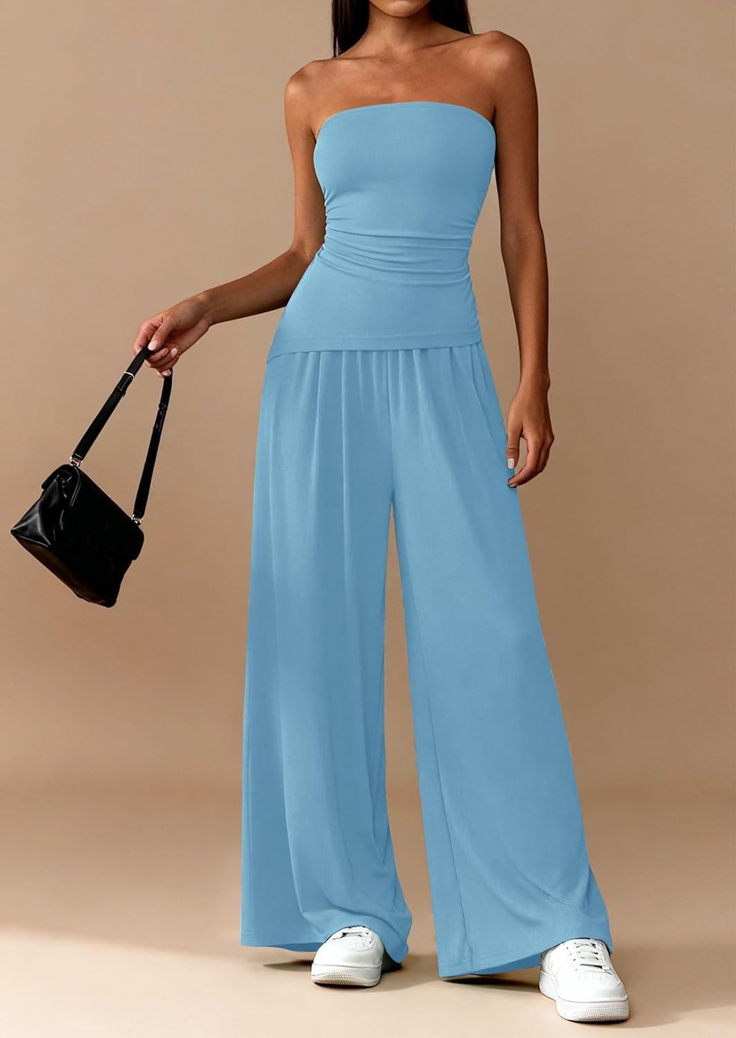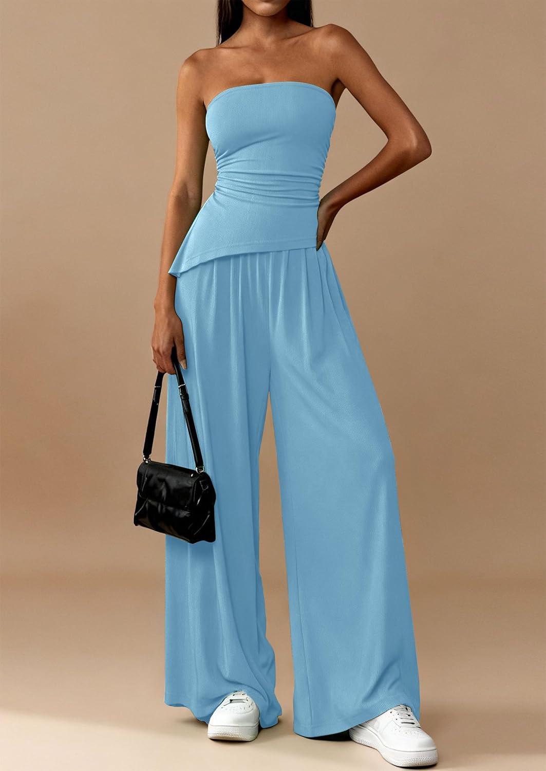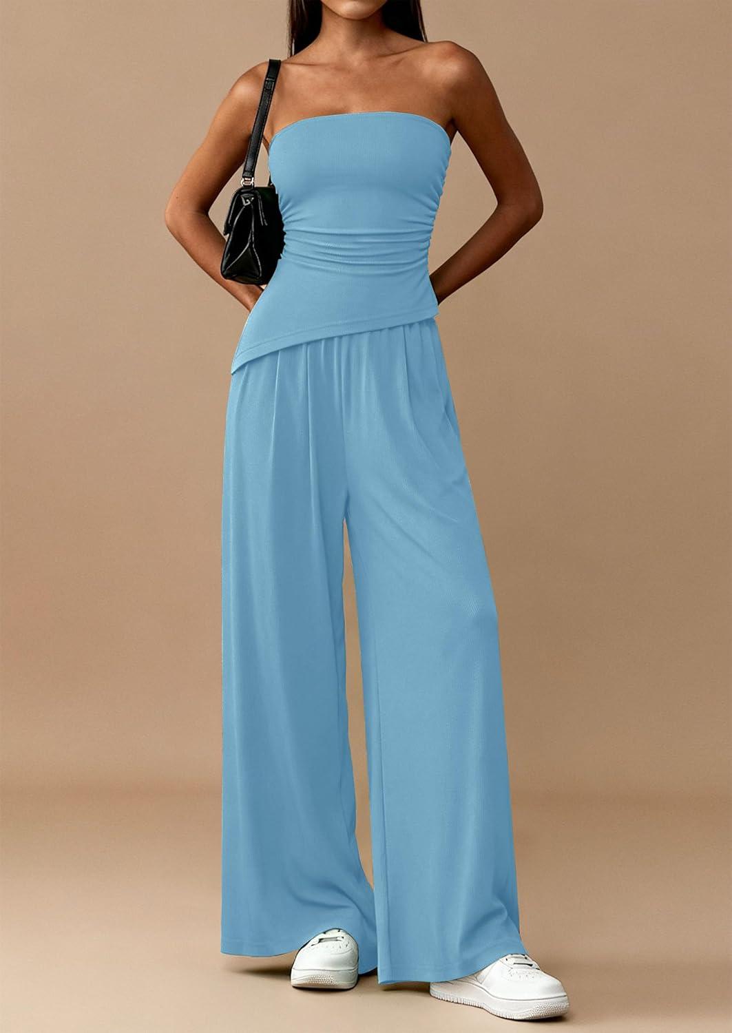 PRETTYGARDEN Summer Sets Women 2 Piece Outfits Asymmetrical Tube Tops and Pants Beach Vacation Airport Matching Lounge Set(Light Blue)