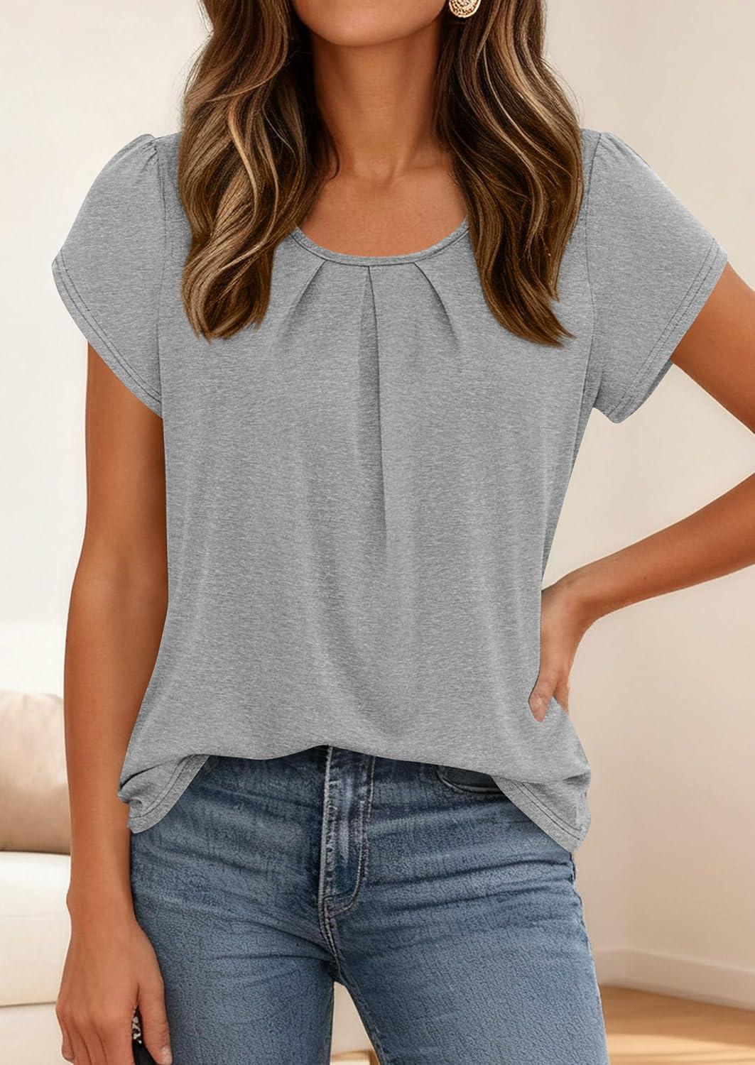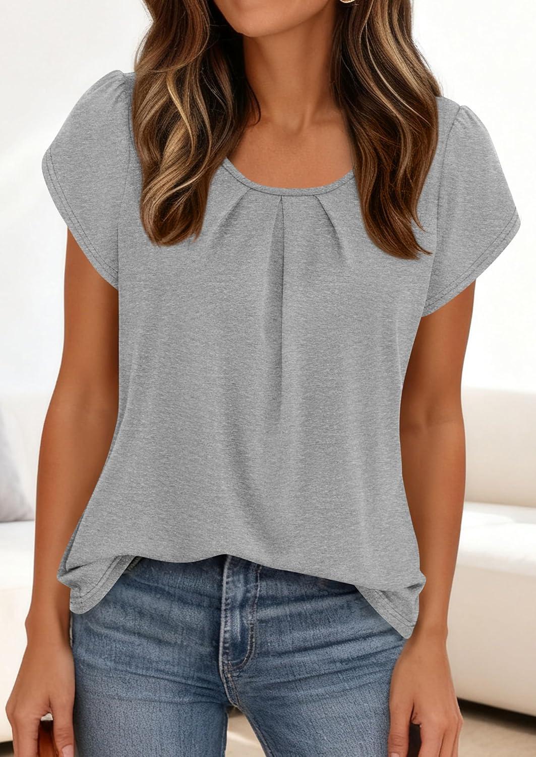 PRETTYGARDEN Summer Tops for Women 2026 Short Sleeve Crew Neck Pleated T Shirts Dressy Casual Blouses Spring Fashion Clothes(Grey)