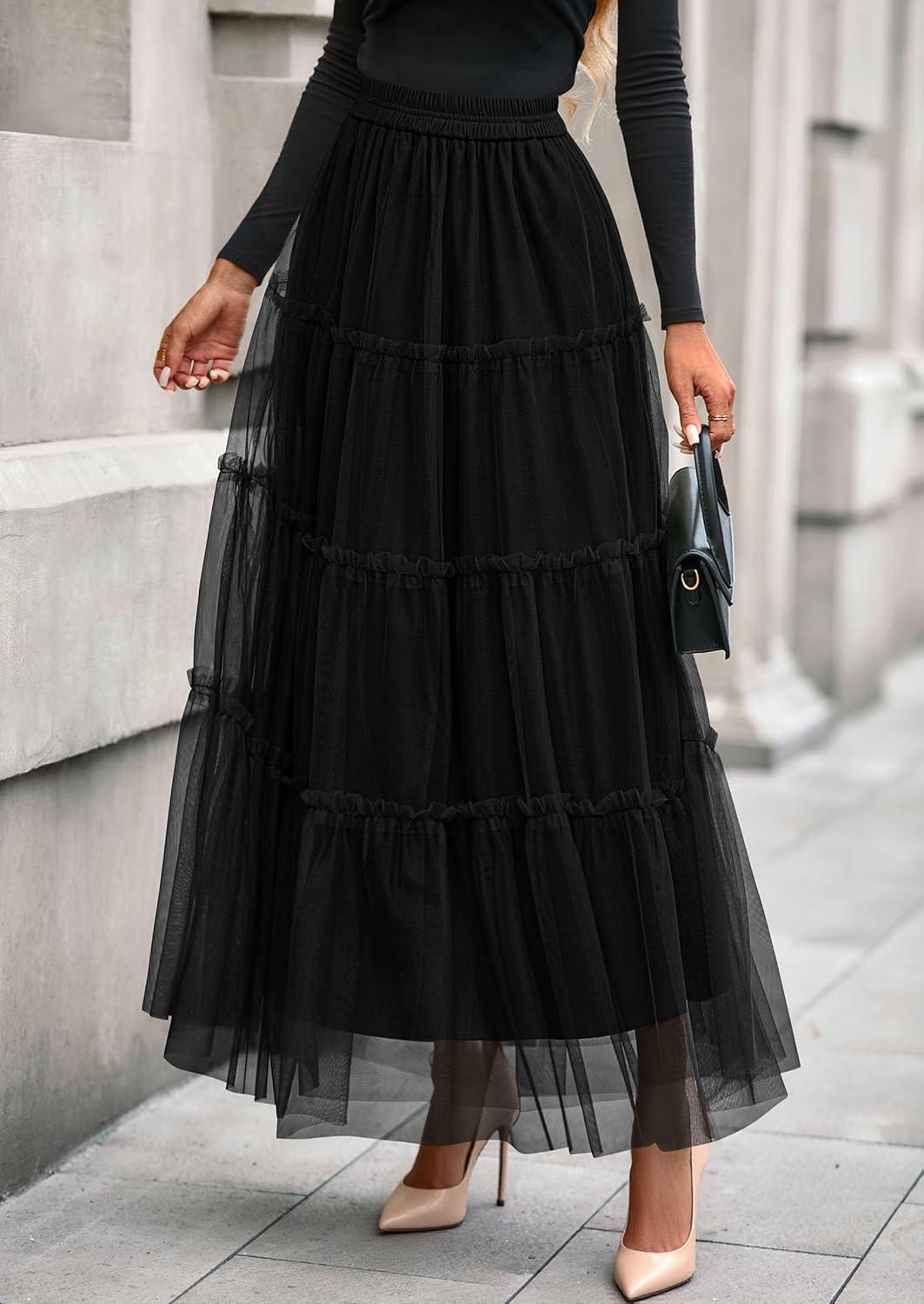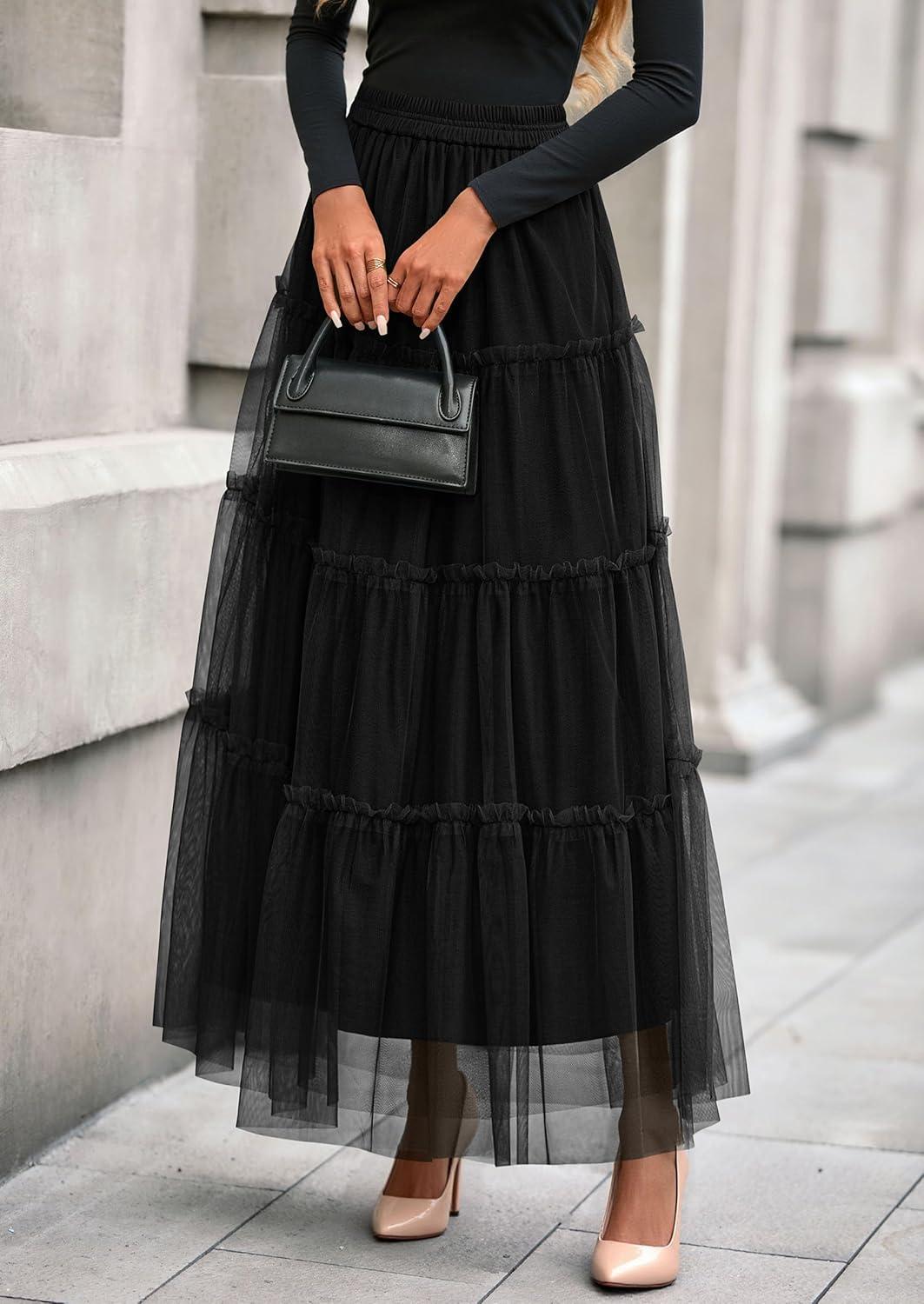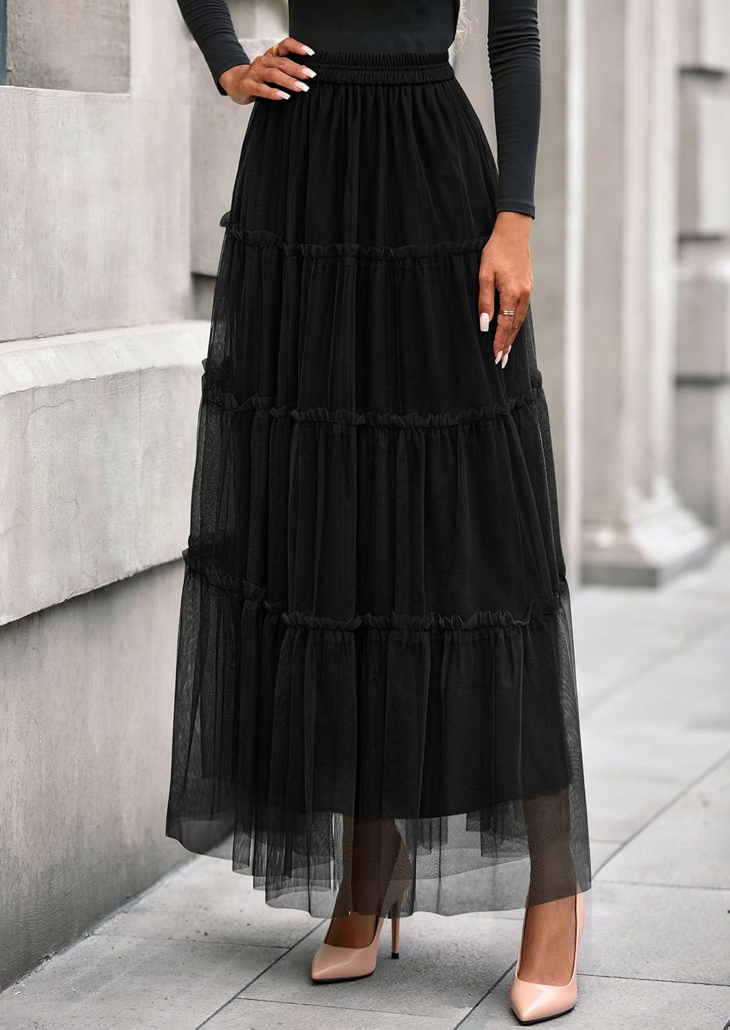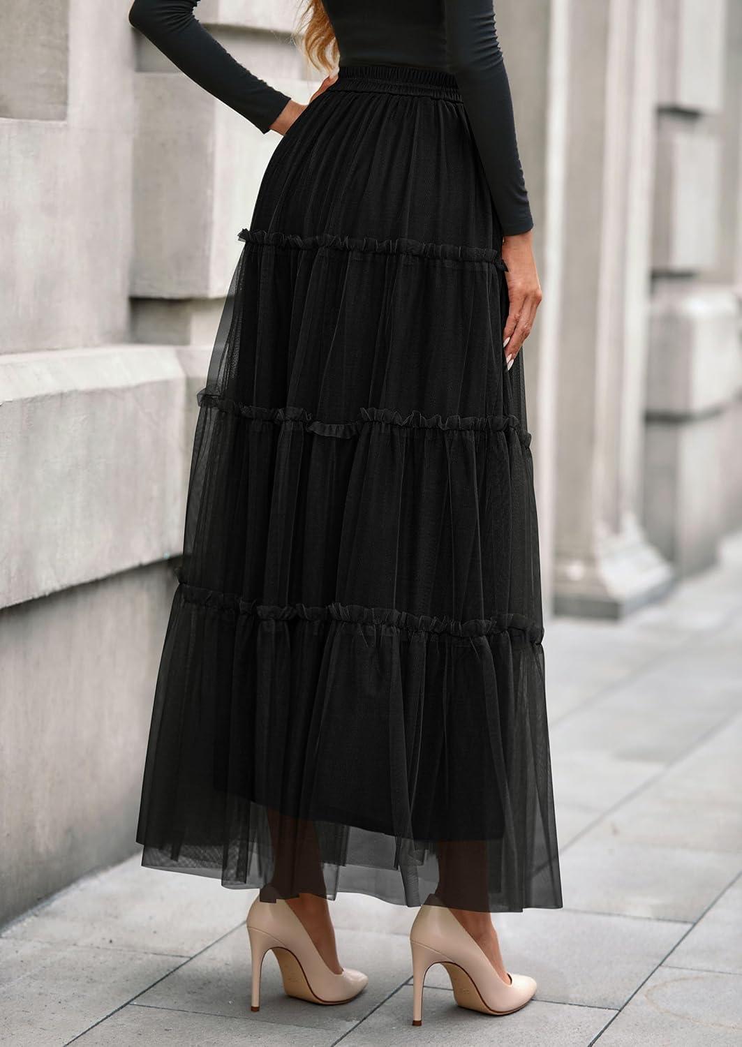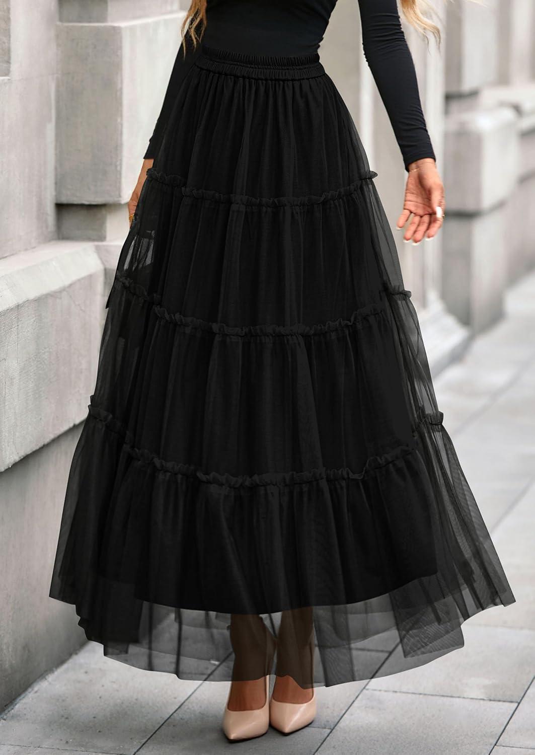 PRETTYGARDEN Tulle Skirts for Women 2025 Fall Fashion Elastic High Waisted Fairy Tiered Flowy A-Line Casual Maxi Long Skirt(Black)