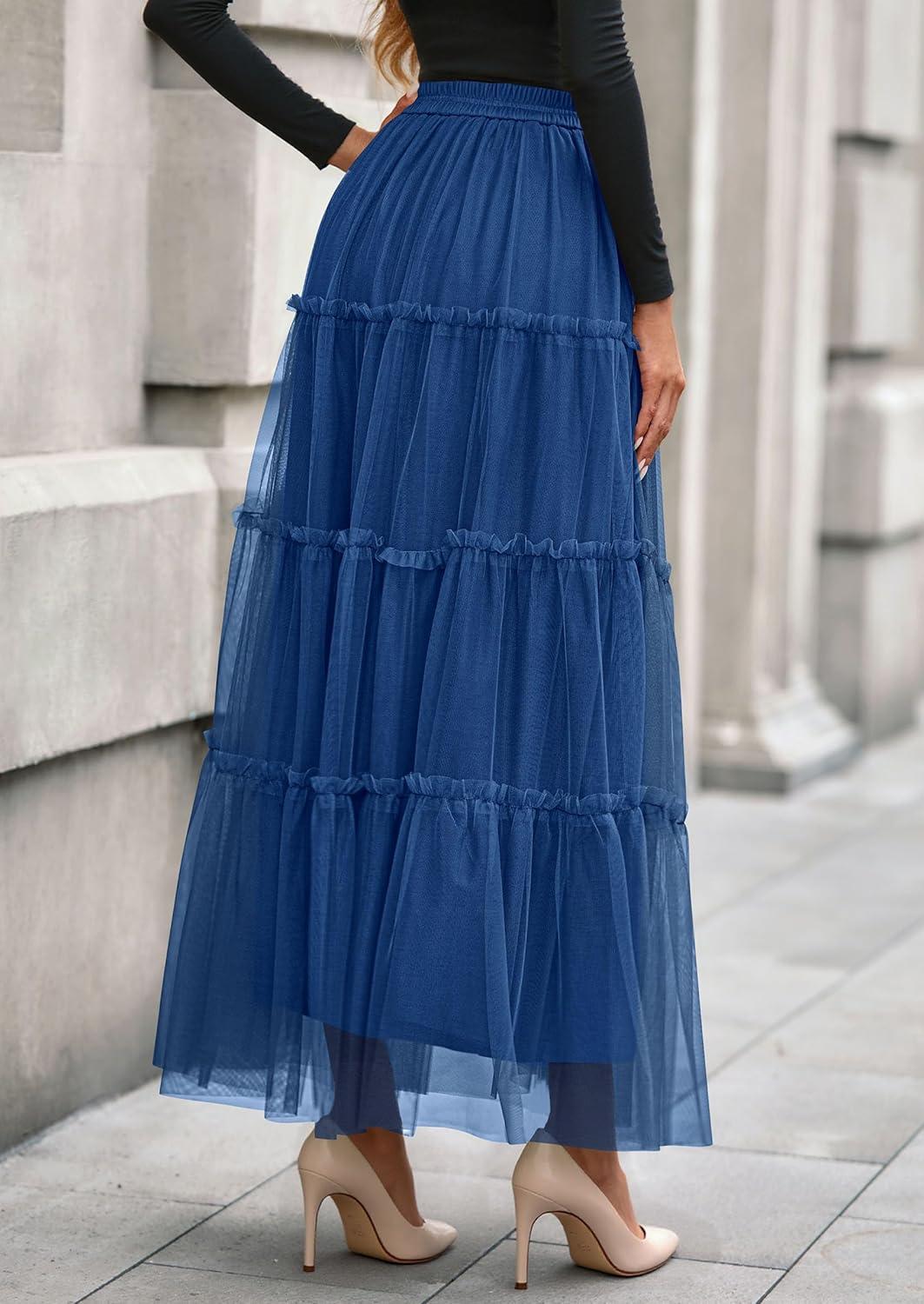 PRETTYGARDEN Tulle Skirts for Women 2025 Fall Fashion Elastic High Waisted Fairy Tiered Flowy A-Line Casual Maxi Long Skirt(Blue)