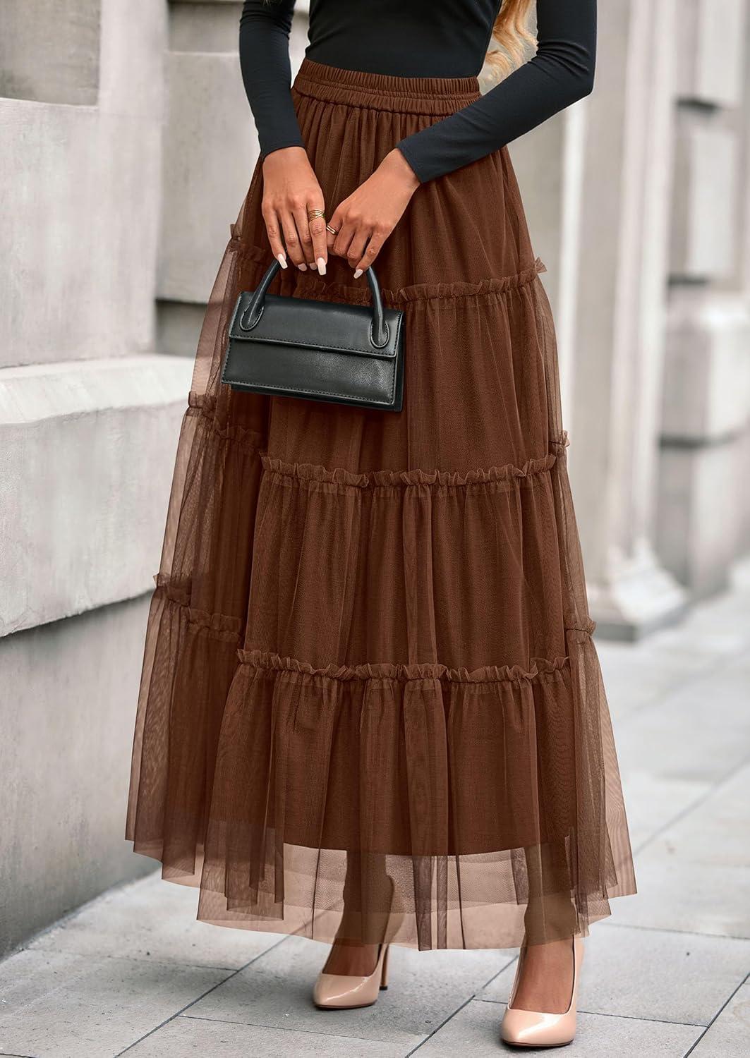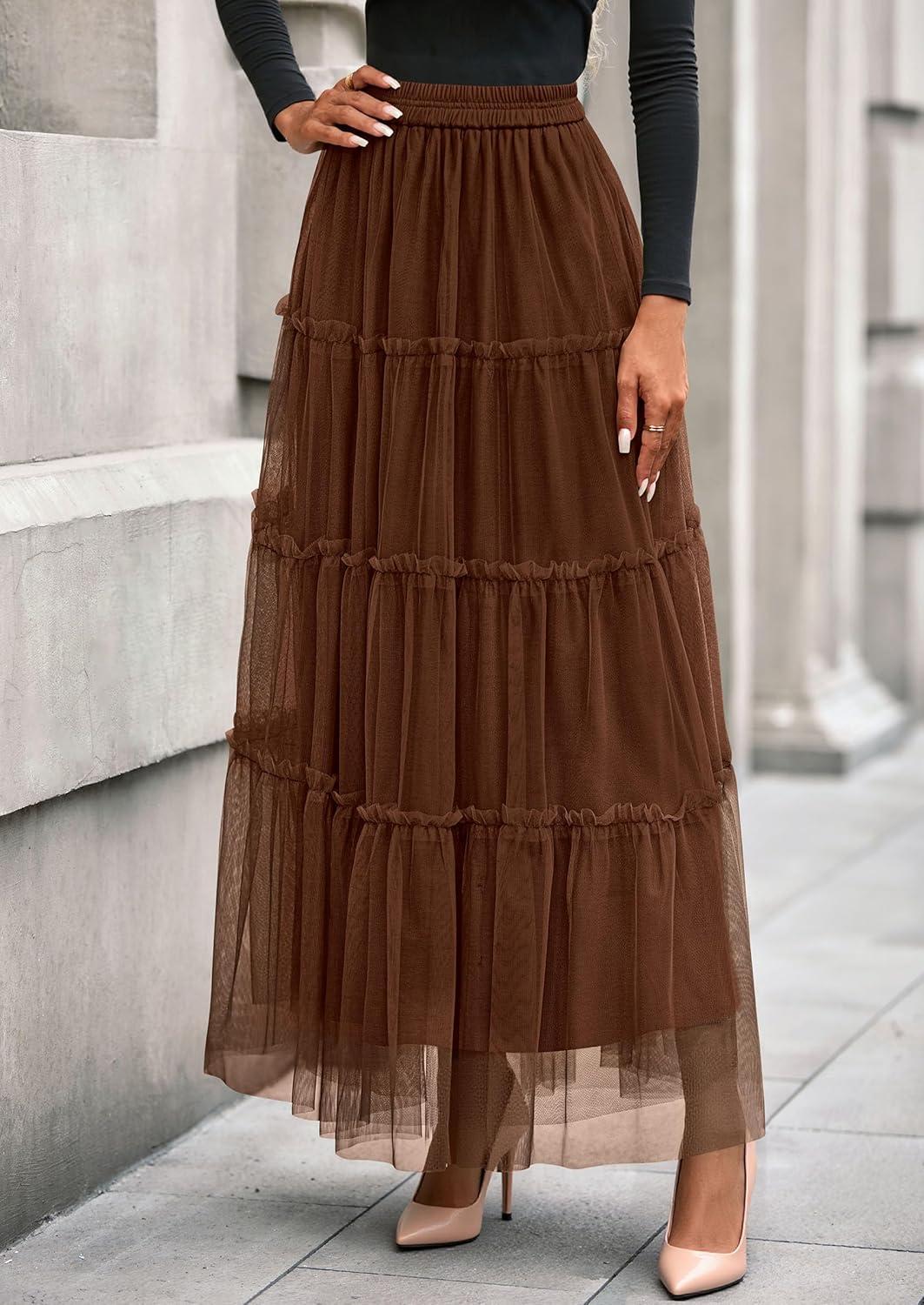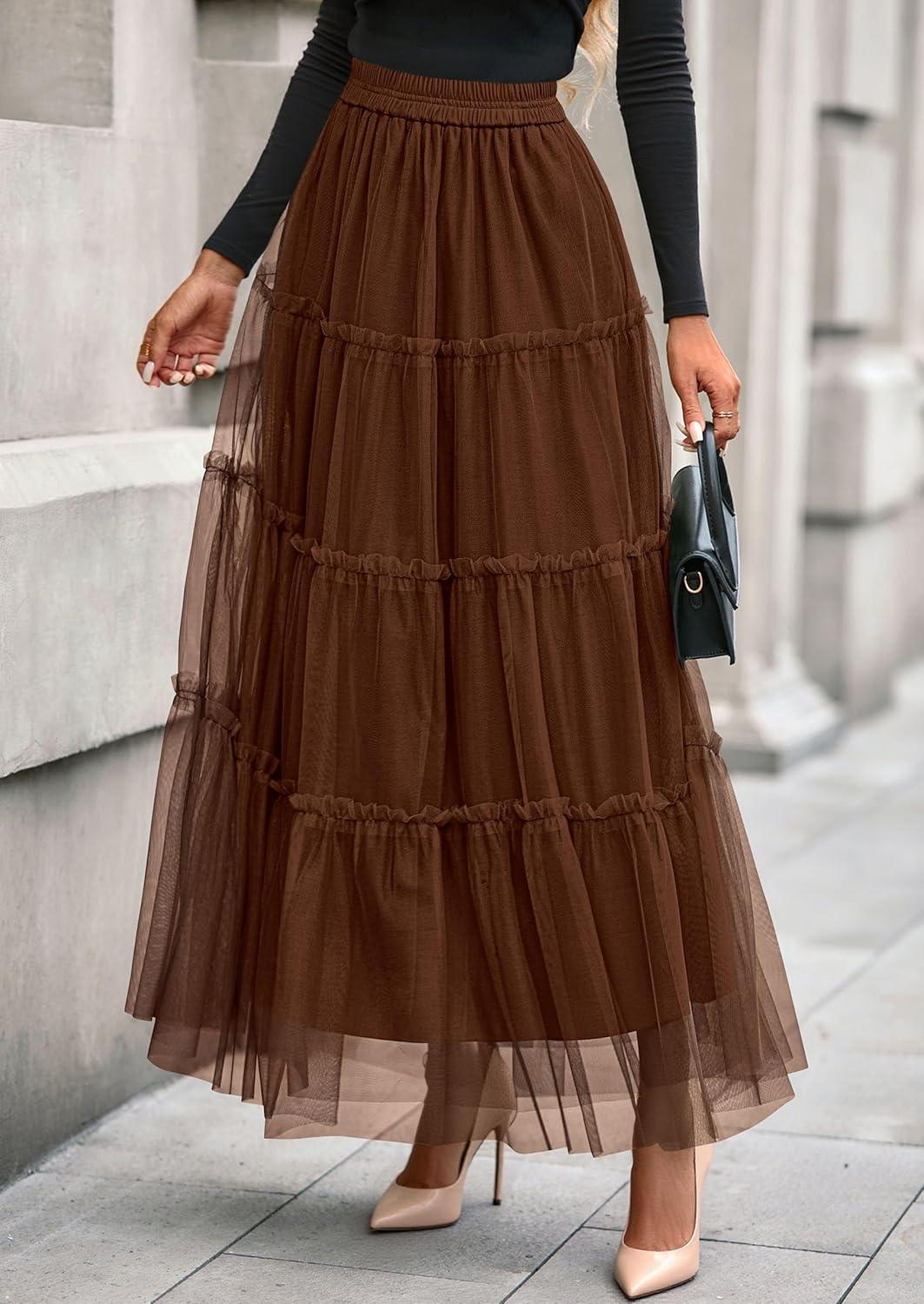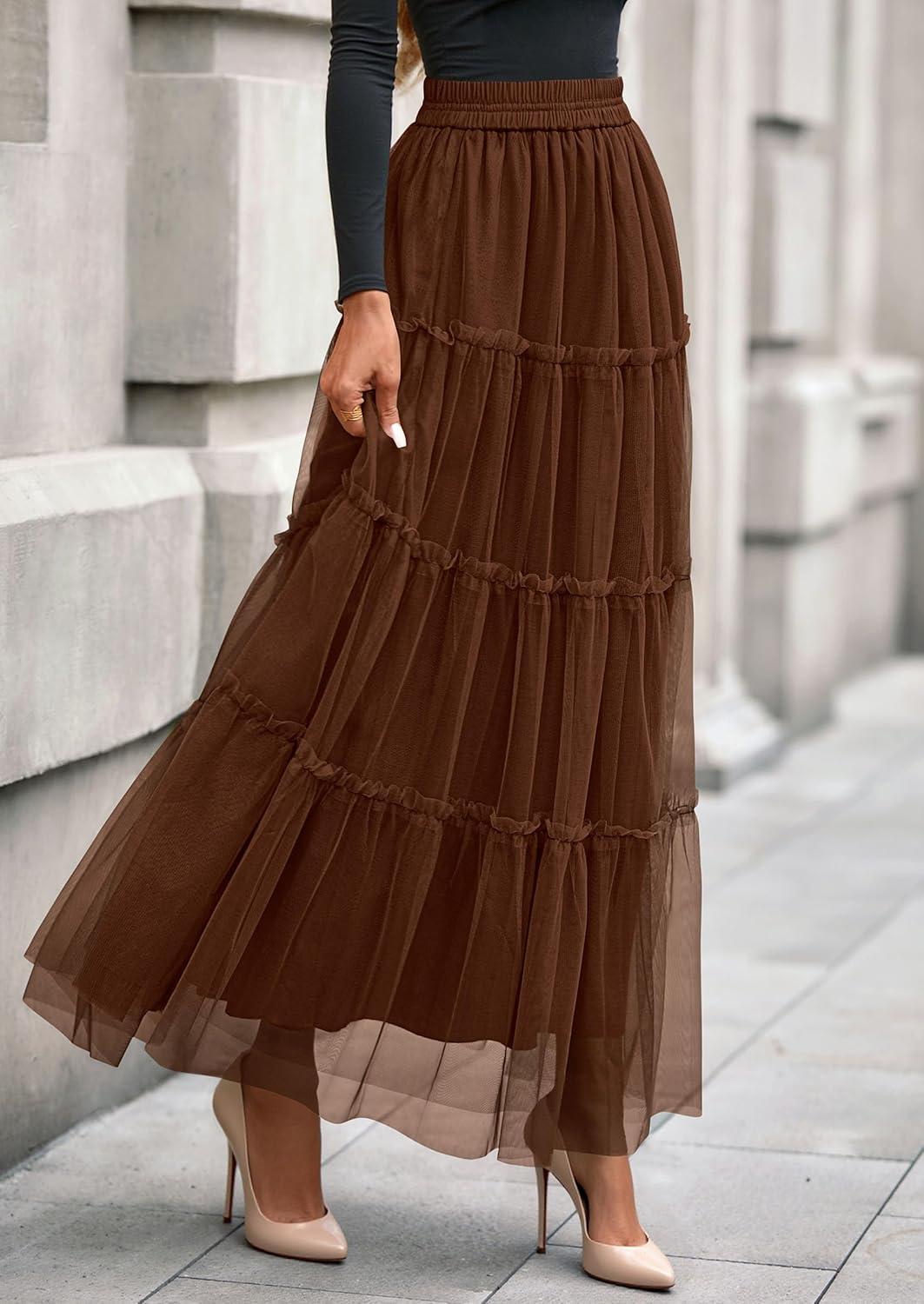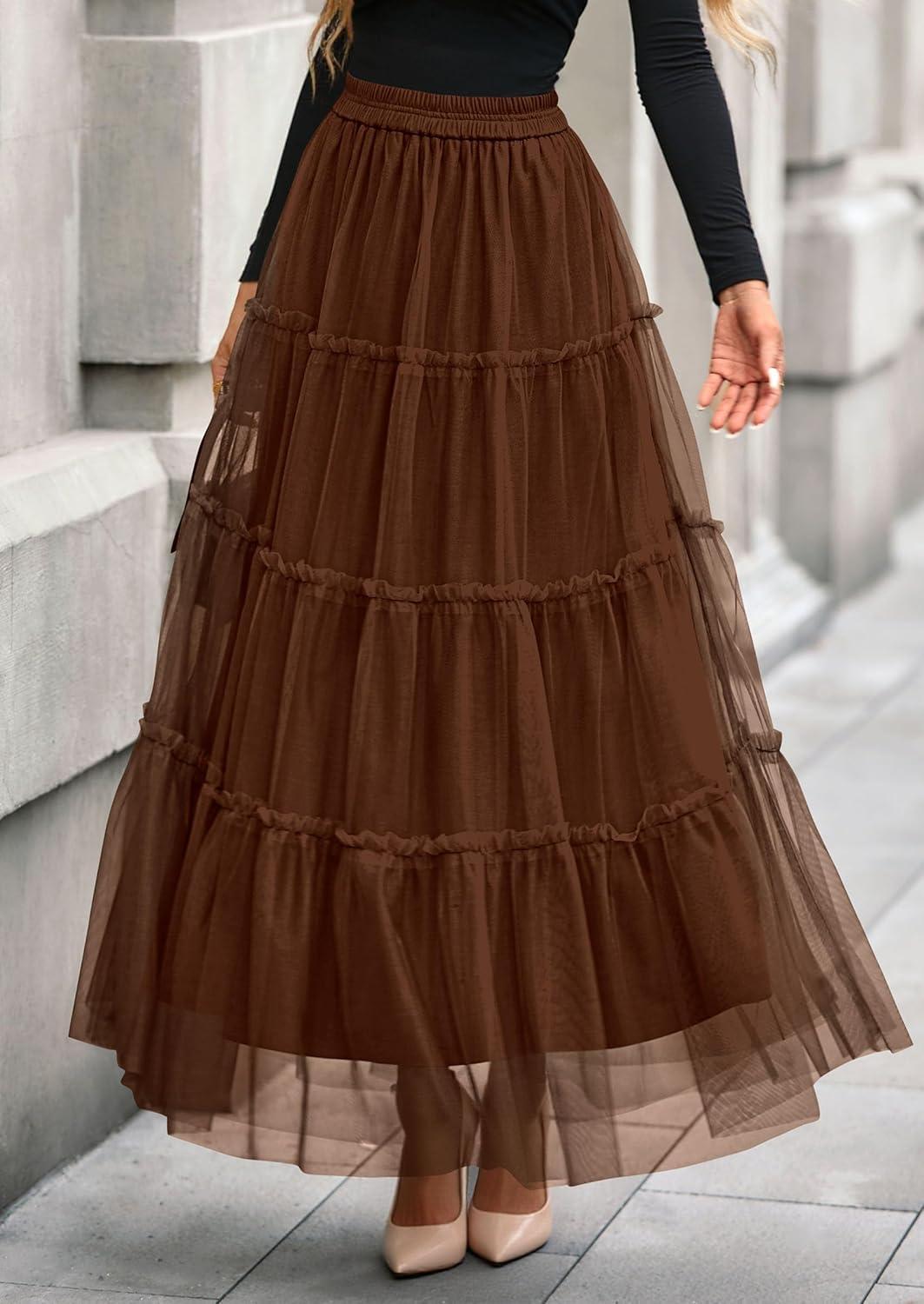 PRETTYGARDEN Tulle Skirts for Women 2025 Fall Fashion Elastic High Waisted Fairy Tiered Flowy A-Line Casual Maxi Long Skirt(Brown)