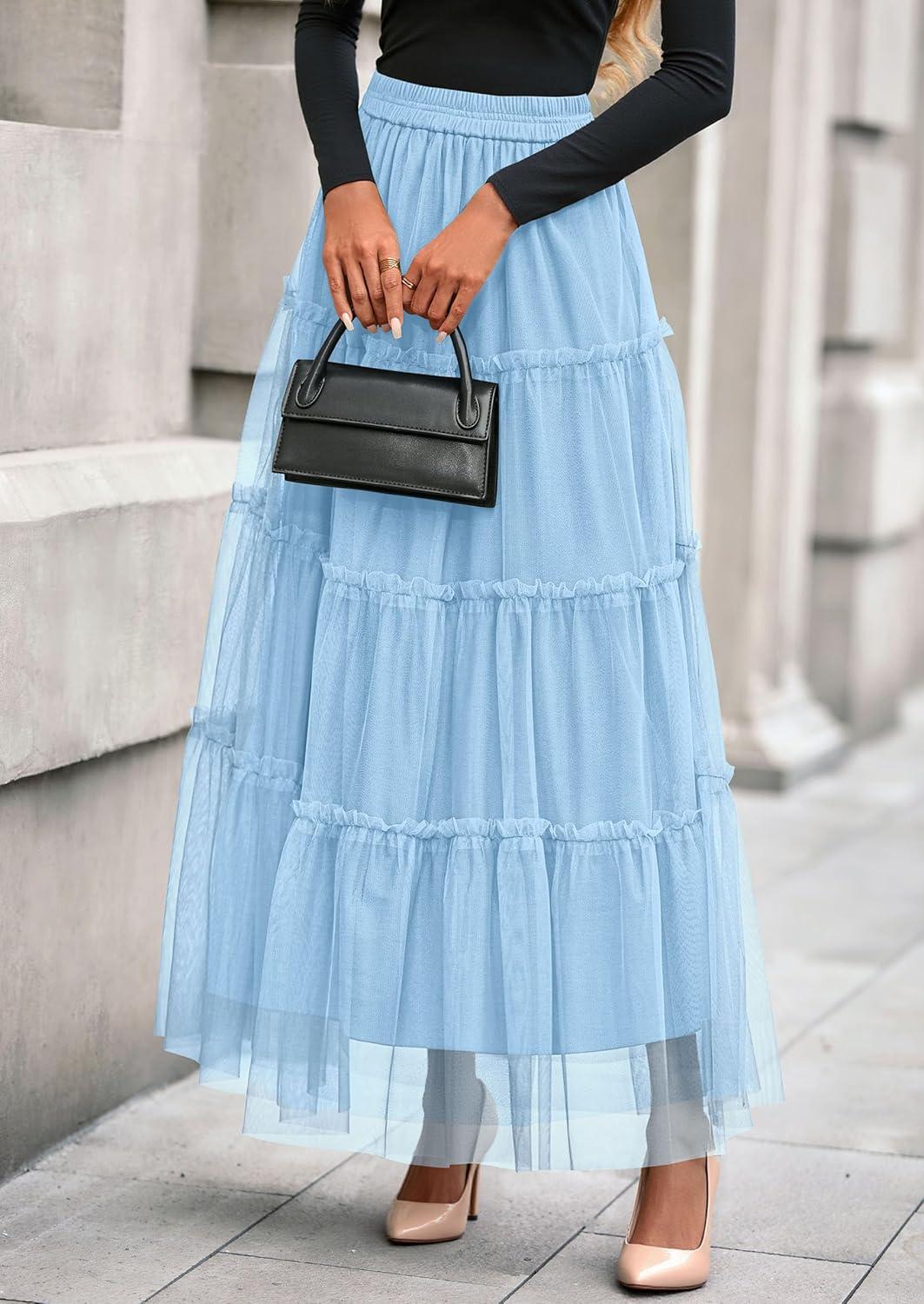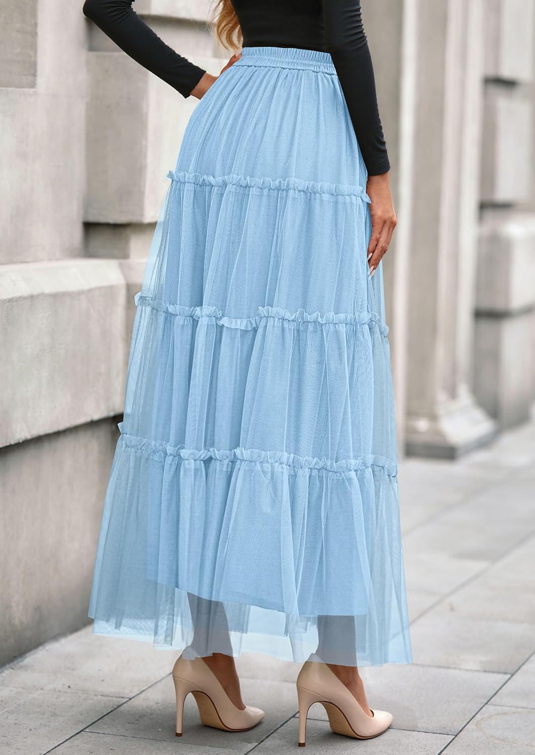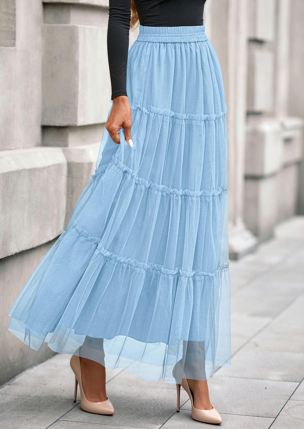 PRETTYGARDEN Tulle Skirts for Women 2025 Fall Fashion Elastic High Waisted Fairy Tiered Flowy A-Line Casual Maxi Long Skirt(Light Blue)