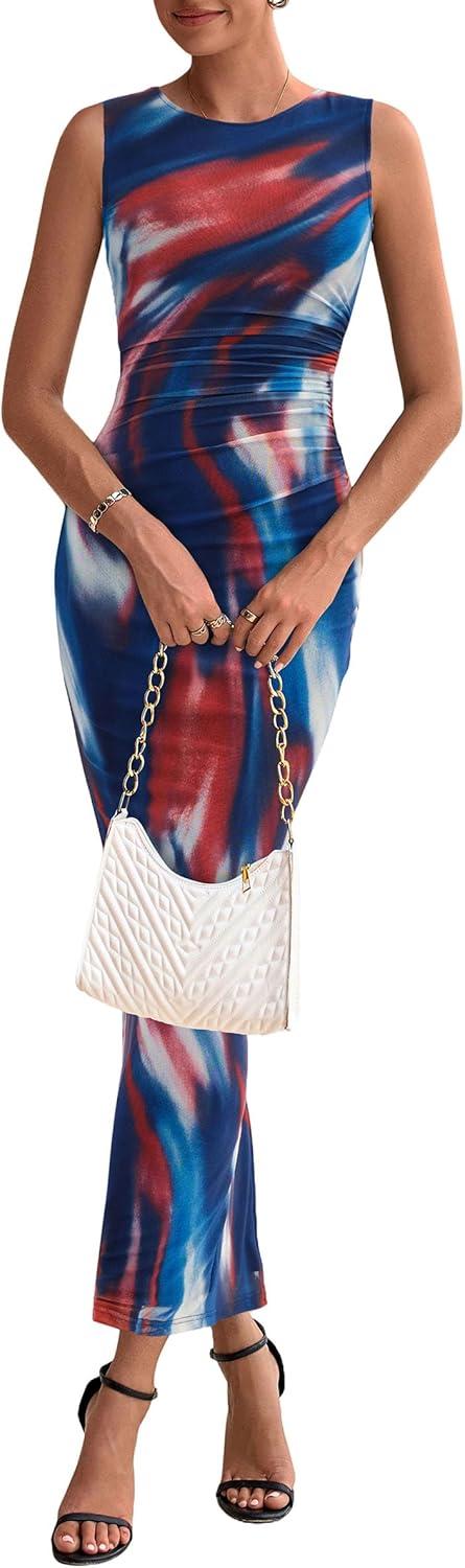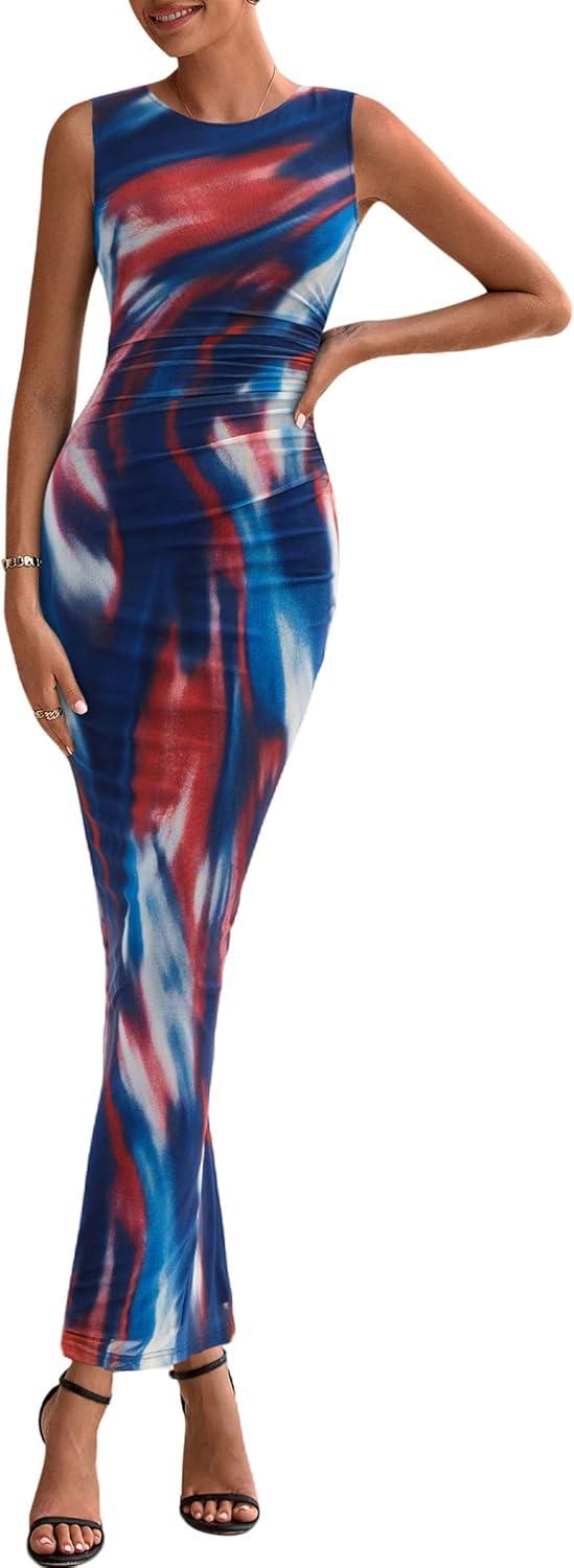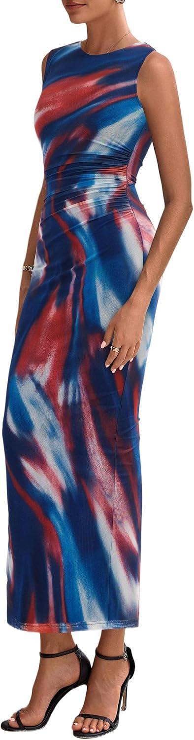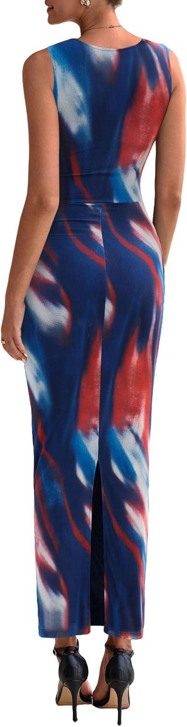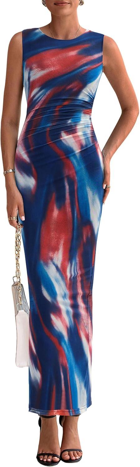 PRETTYGARDEN Wedding Guest Dresses for Women 2025 Summer Spring Floral Bodycon Sleeveless Mesh Maxi Long Dress(Floral Blue)
