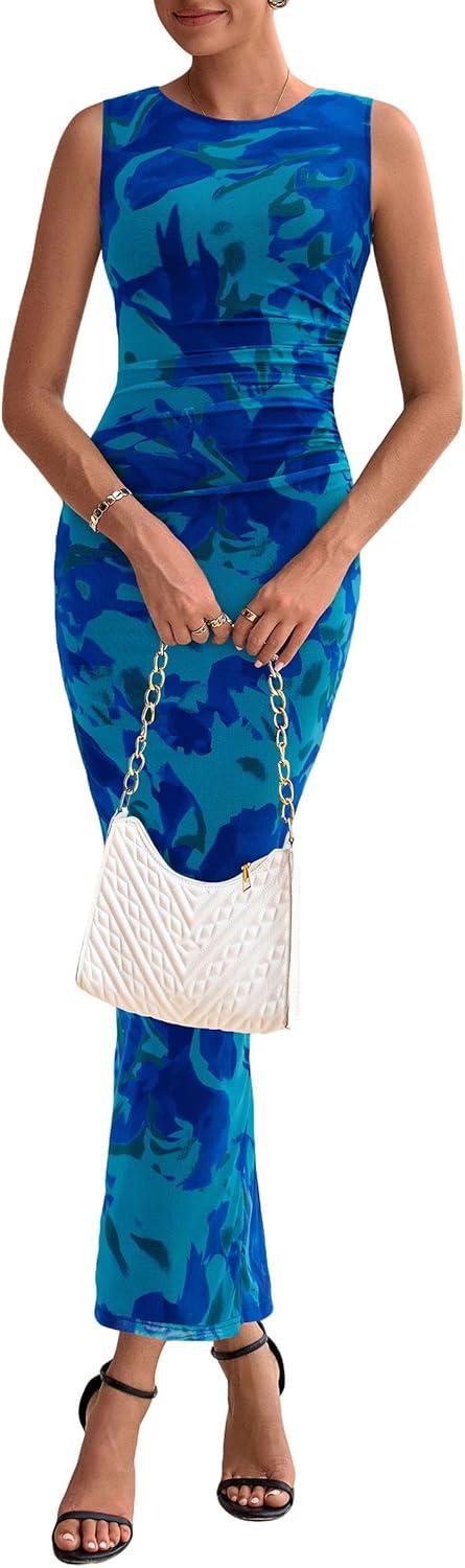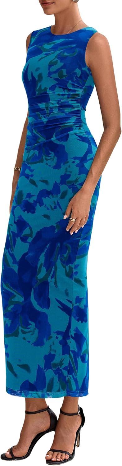 PRETTYGARDEN Wedding Guest Dresses for Women 2025 Summer Spring Floral Bodycon Sleeveless Mesh Maxi Long Dress(Green Blue Flower)