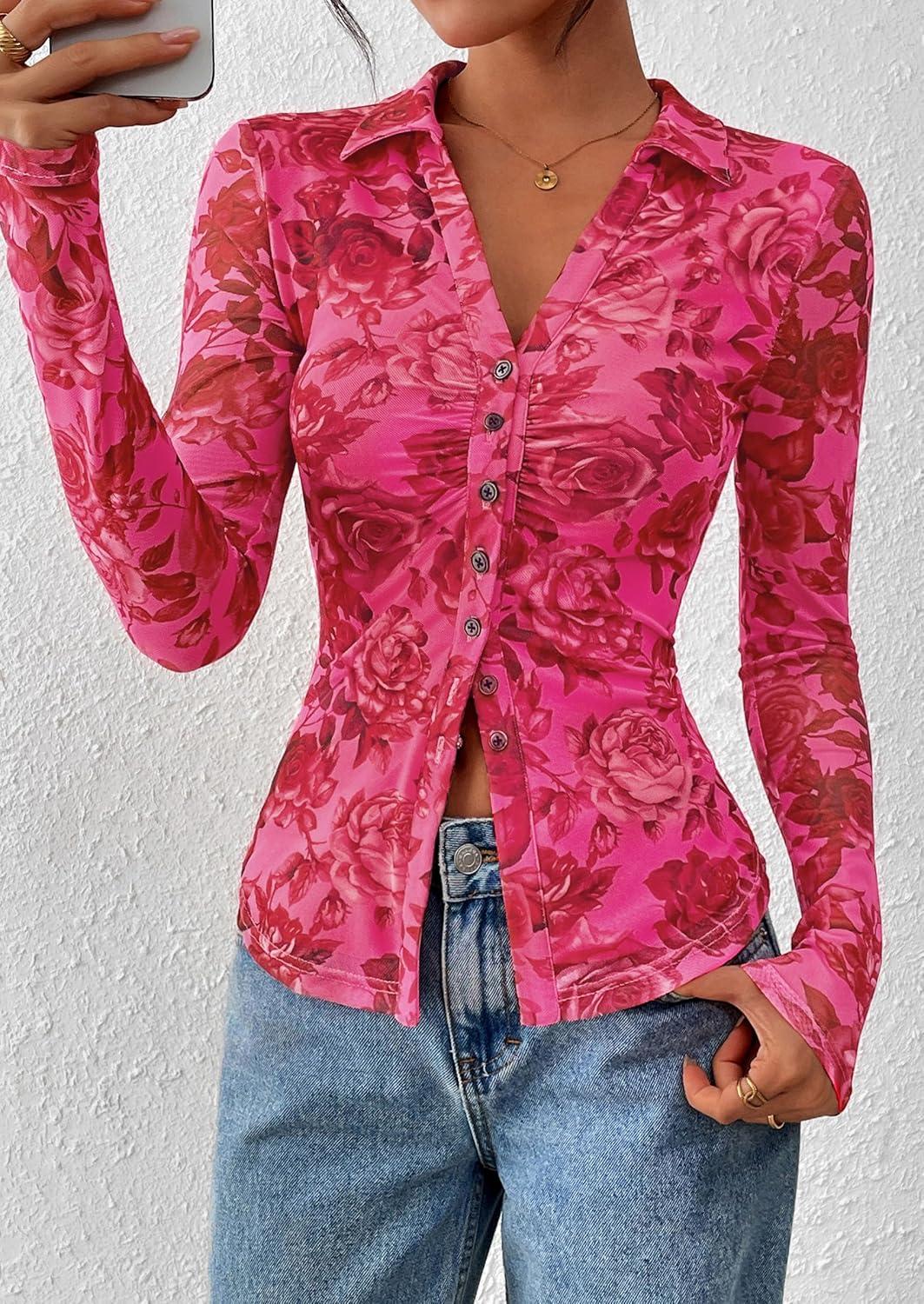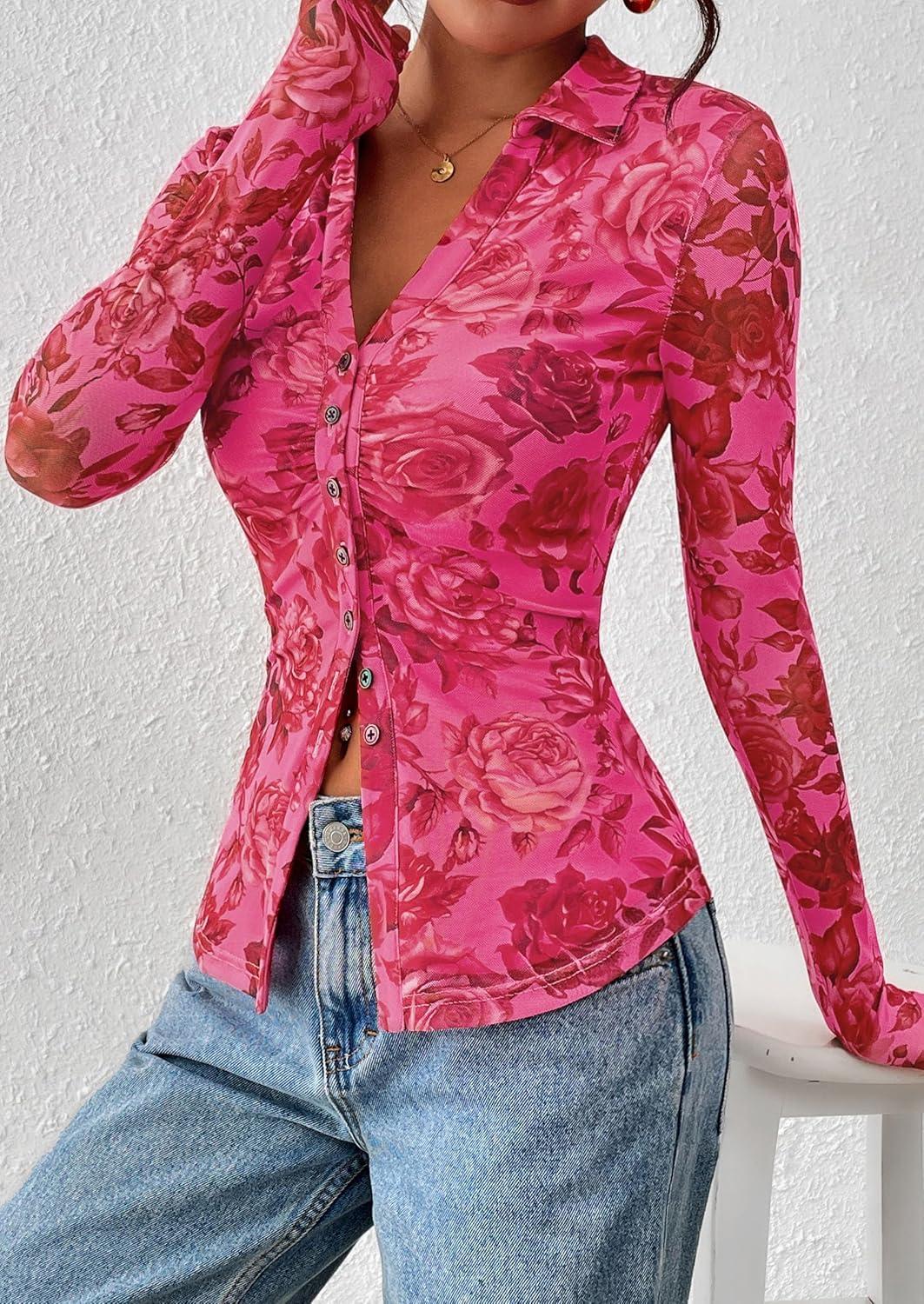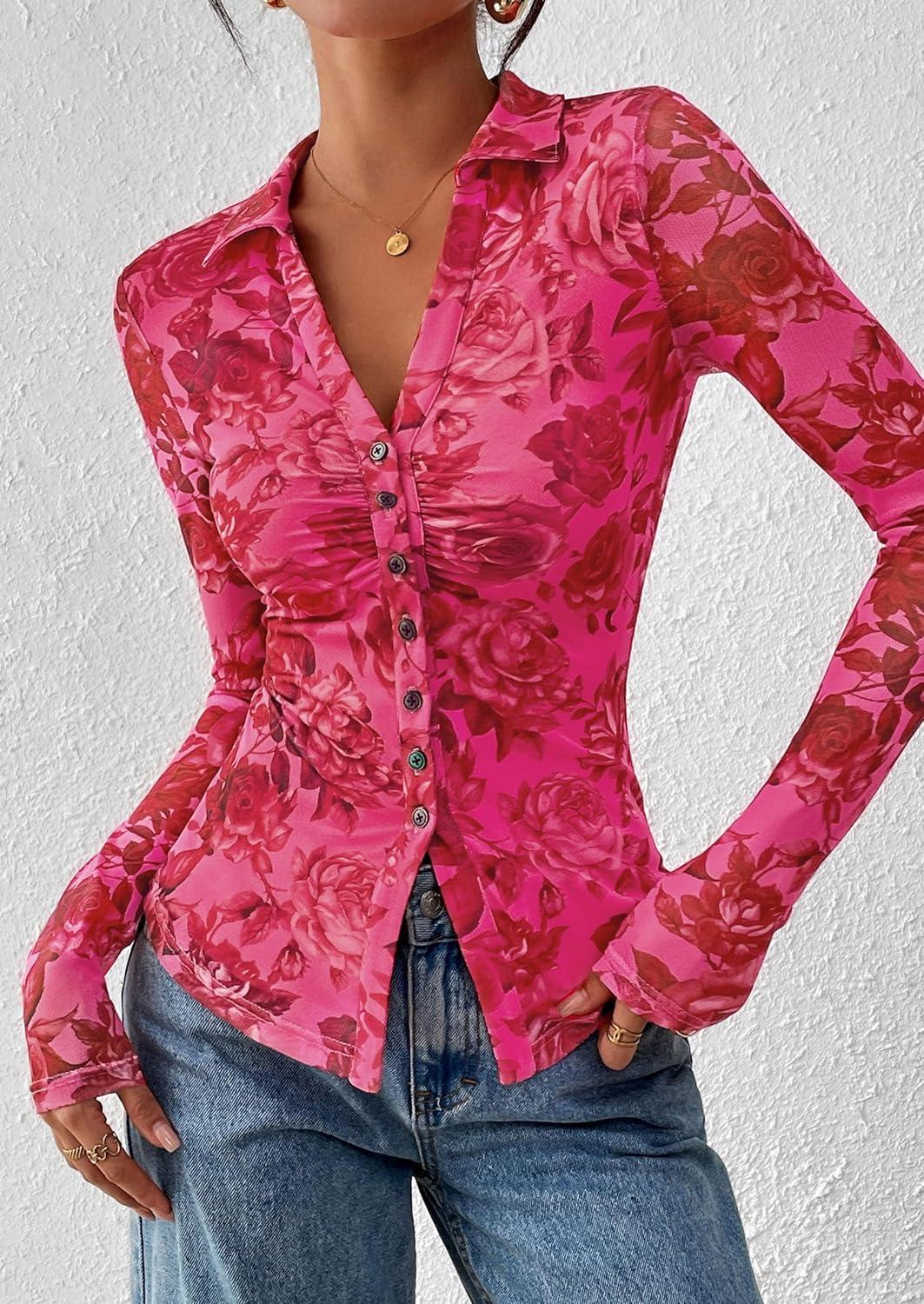 PRETTYGARDEN Women Button Down Floral Shirts 2025 Fall Trendy Long Sleeve V Neck Ruched Mesh Boho Blouse Tops Date Outfits(Pink Red Floral)