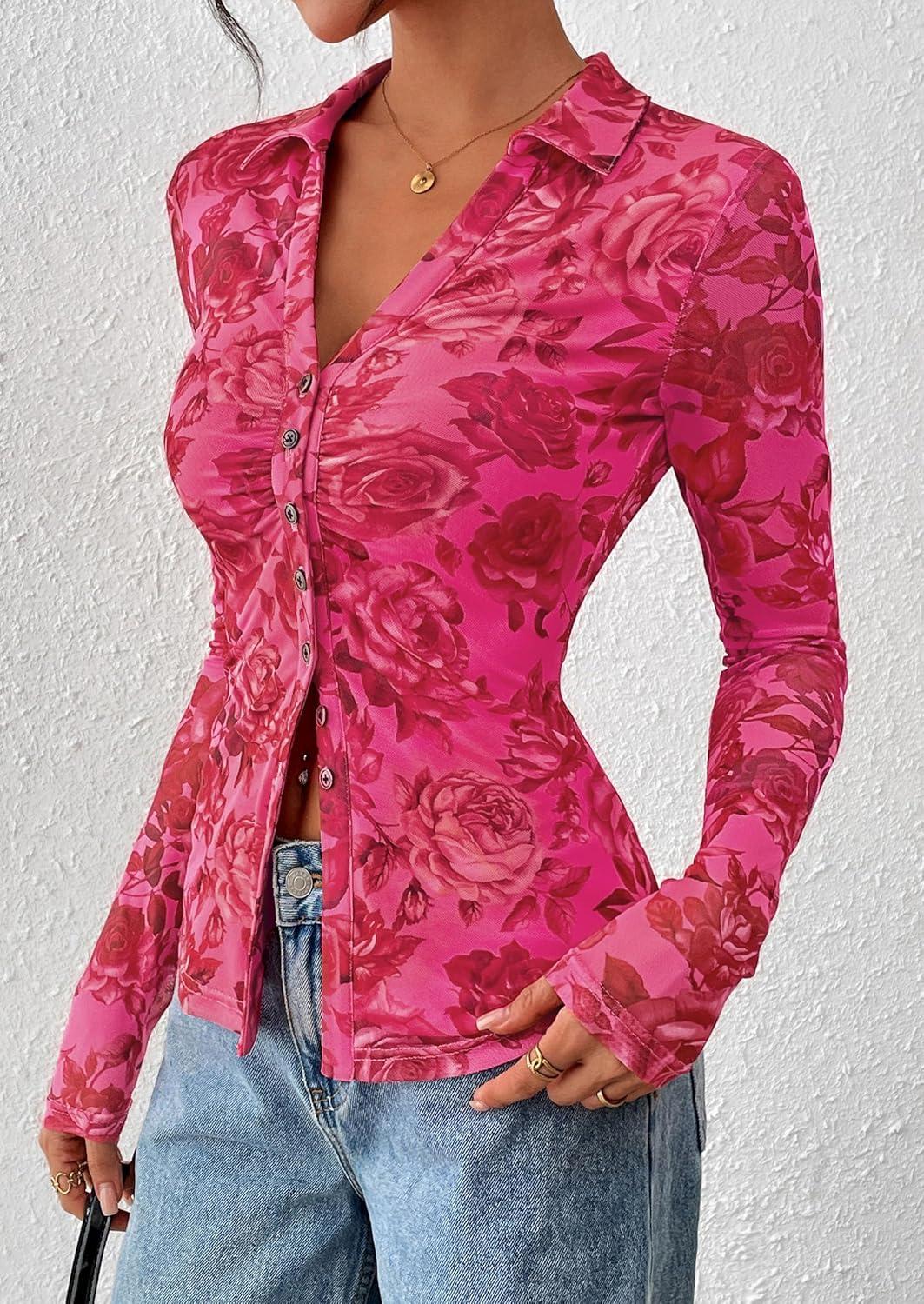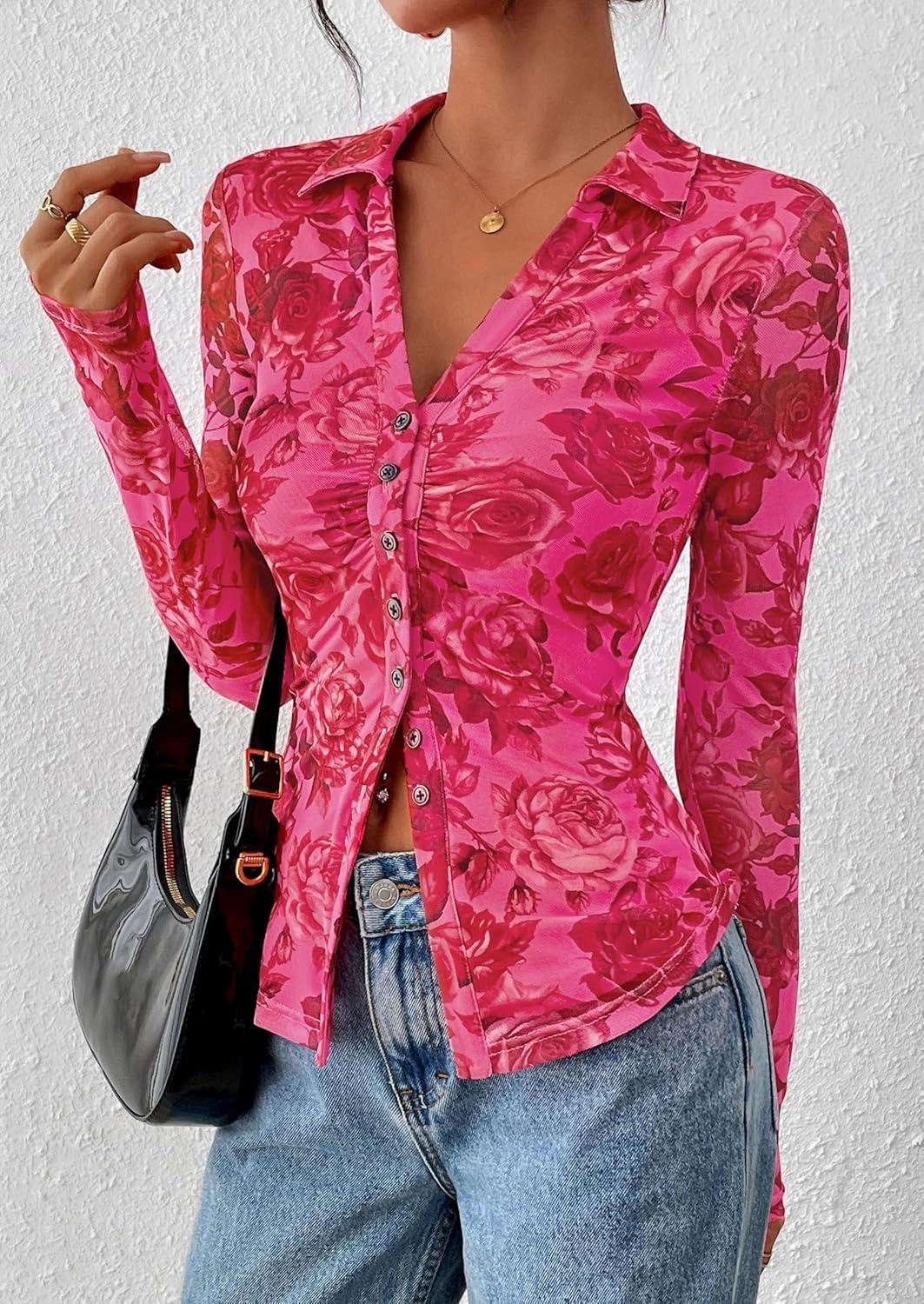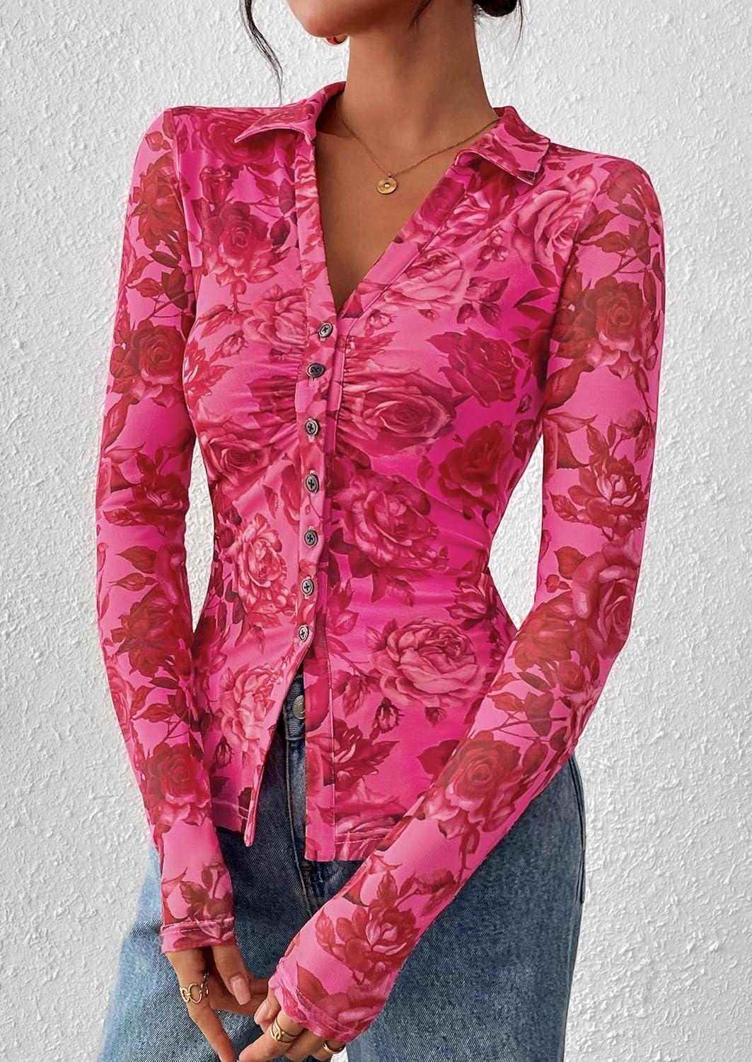 PRETTYGARDEN Women Button Down Floral Shirts 2025 Fall Trendy Long Sleeve V Neck Ruched Mesh Boho Blouse Tops Date Outfits(Pink Red Floral)