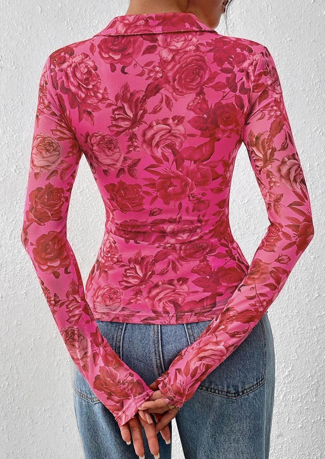 PRETTYGARDEN Women Button Down Floral Shirts 2025 Fall Trendy Long Sleeve V Neck Ruched Mesh Boho Blouse Tops Date Outfits(Pink)