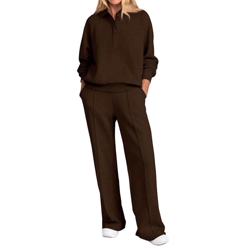 PRETTYGARDEN Women Fall 2 Piece Outfits Sweatsuits Quarter Button Long Sleeve Sweatshirt Wide Leg Pants Tracksuit Lounge Sets(Dark Brown)