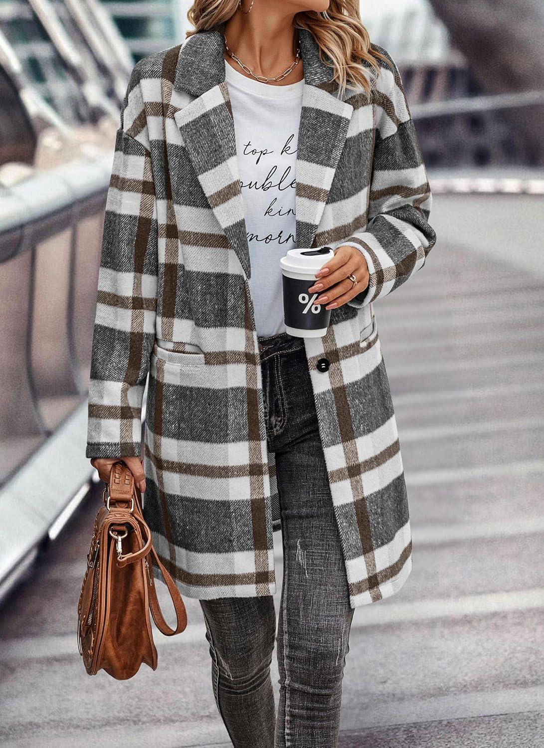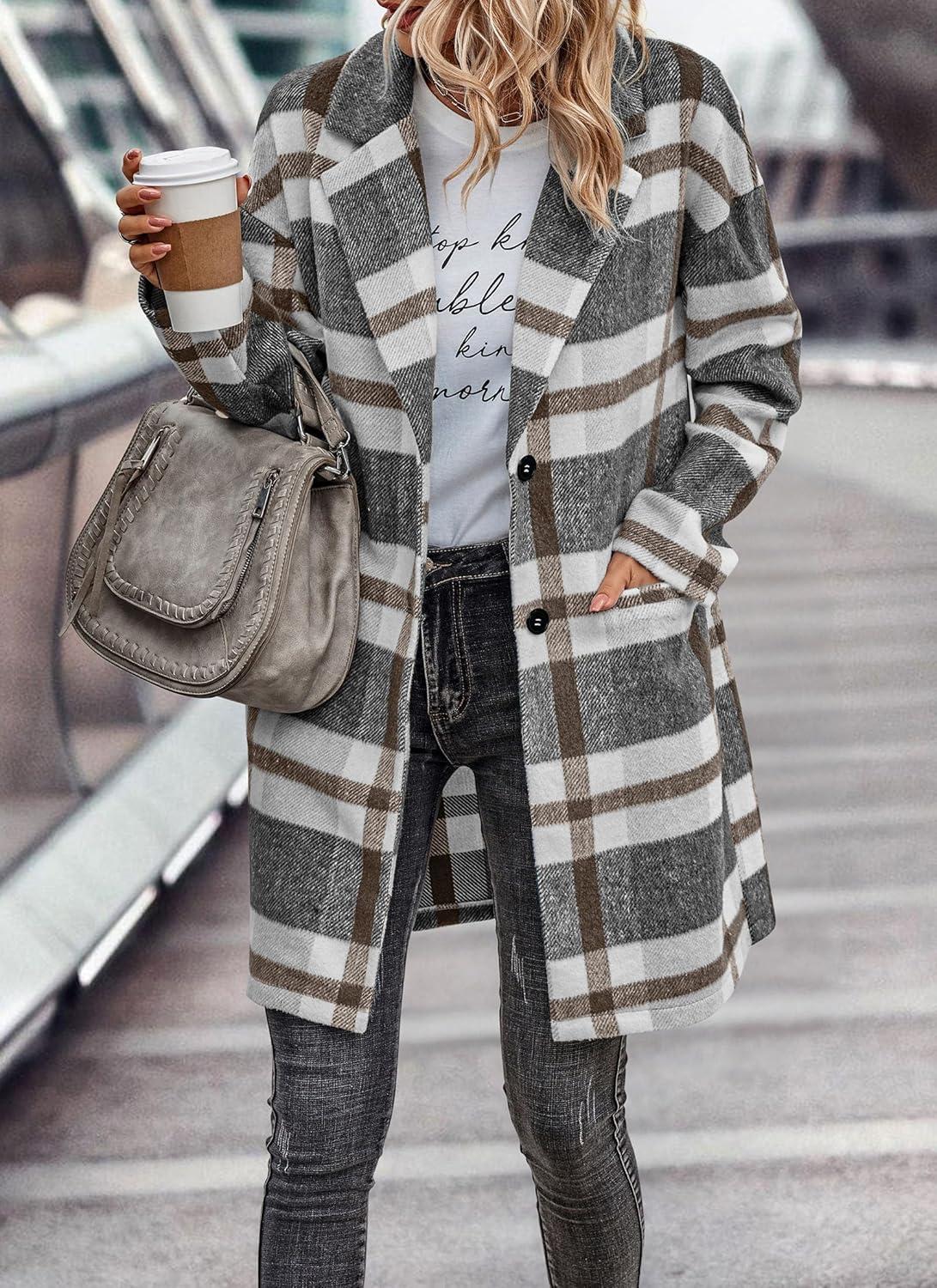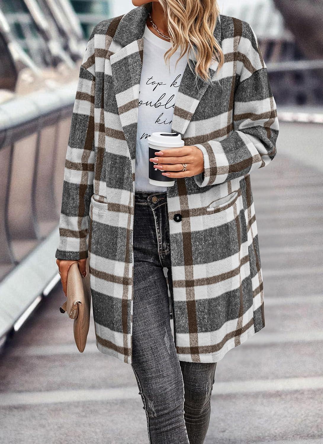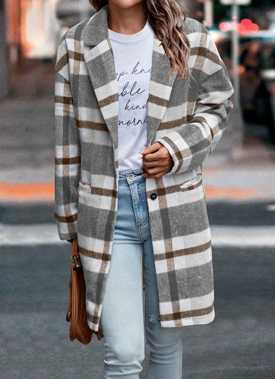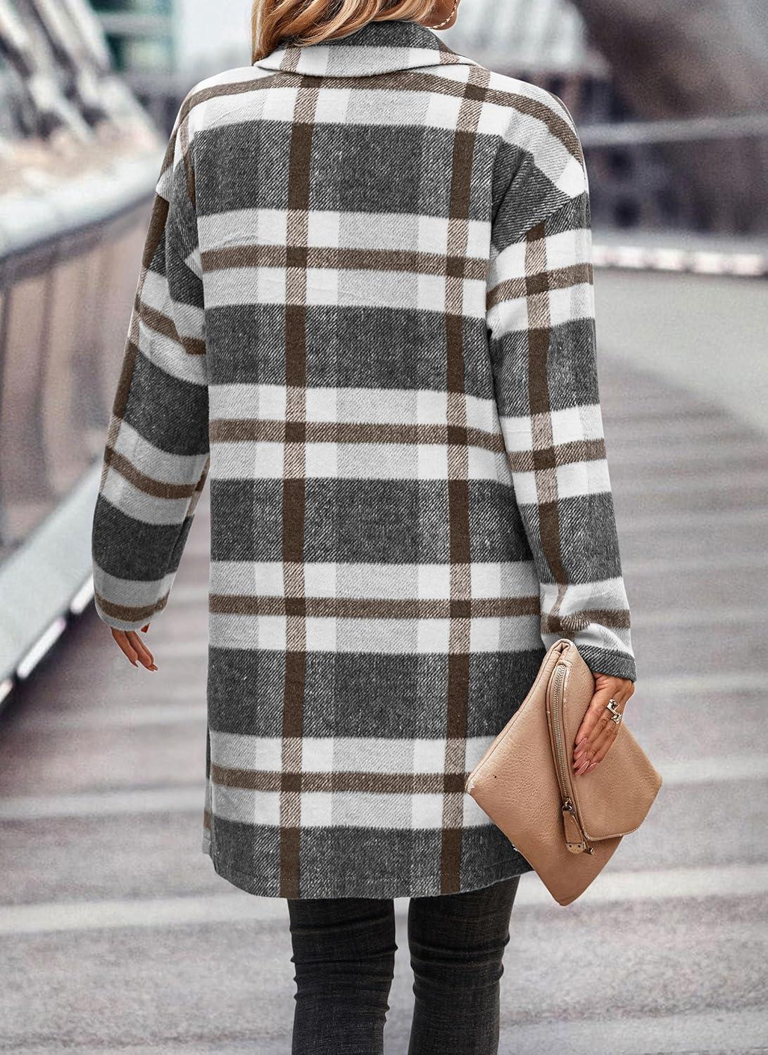 PRETTYGARDEN Women Plaid Shacket Jacket Trendy Fall Casual Button Wool Blend Tartan Trench Coat Winter Clothing with Pockets(Grey White)