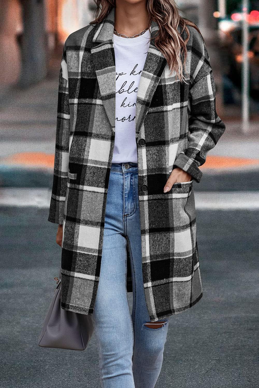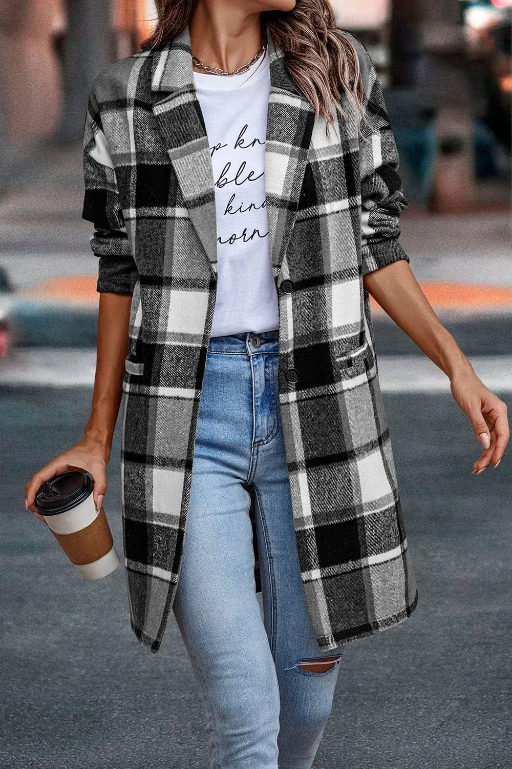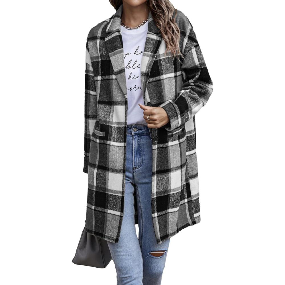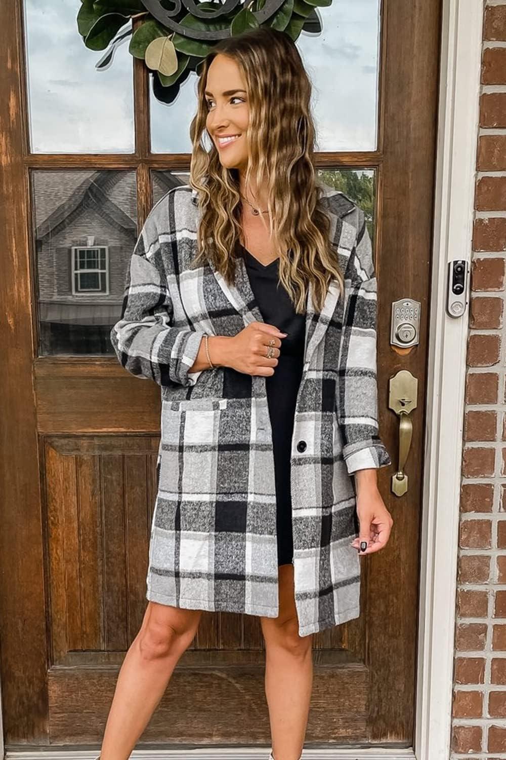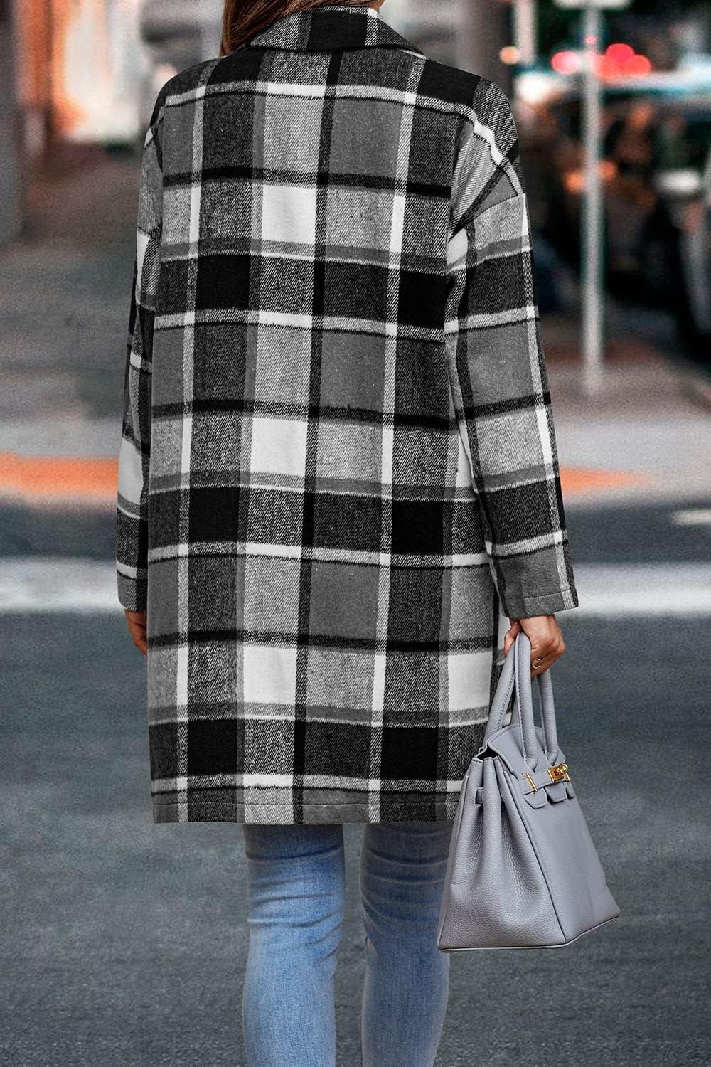 PRETTYGARDEN Women Plaid Shacket Jacket Trendy Fall Casual Button Wool Blend Tartan Trench Coat Winter Clothing with Pockets(Grey)