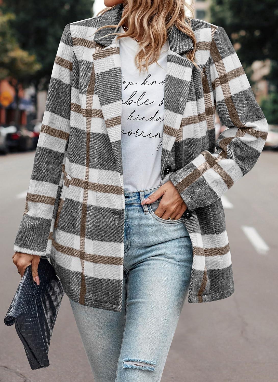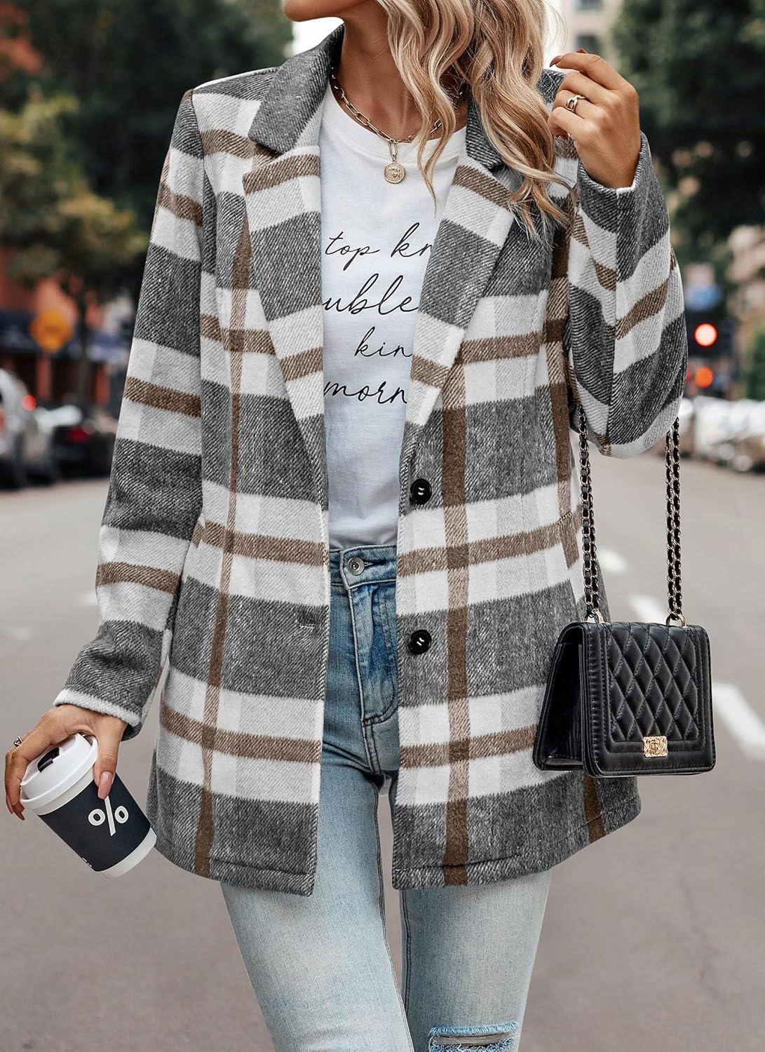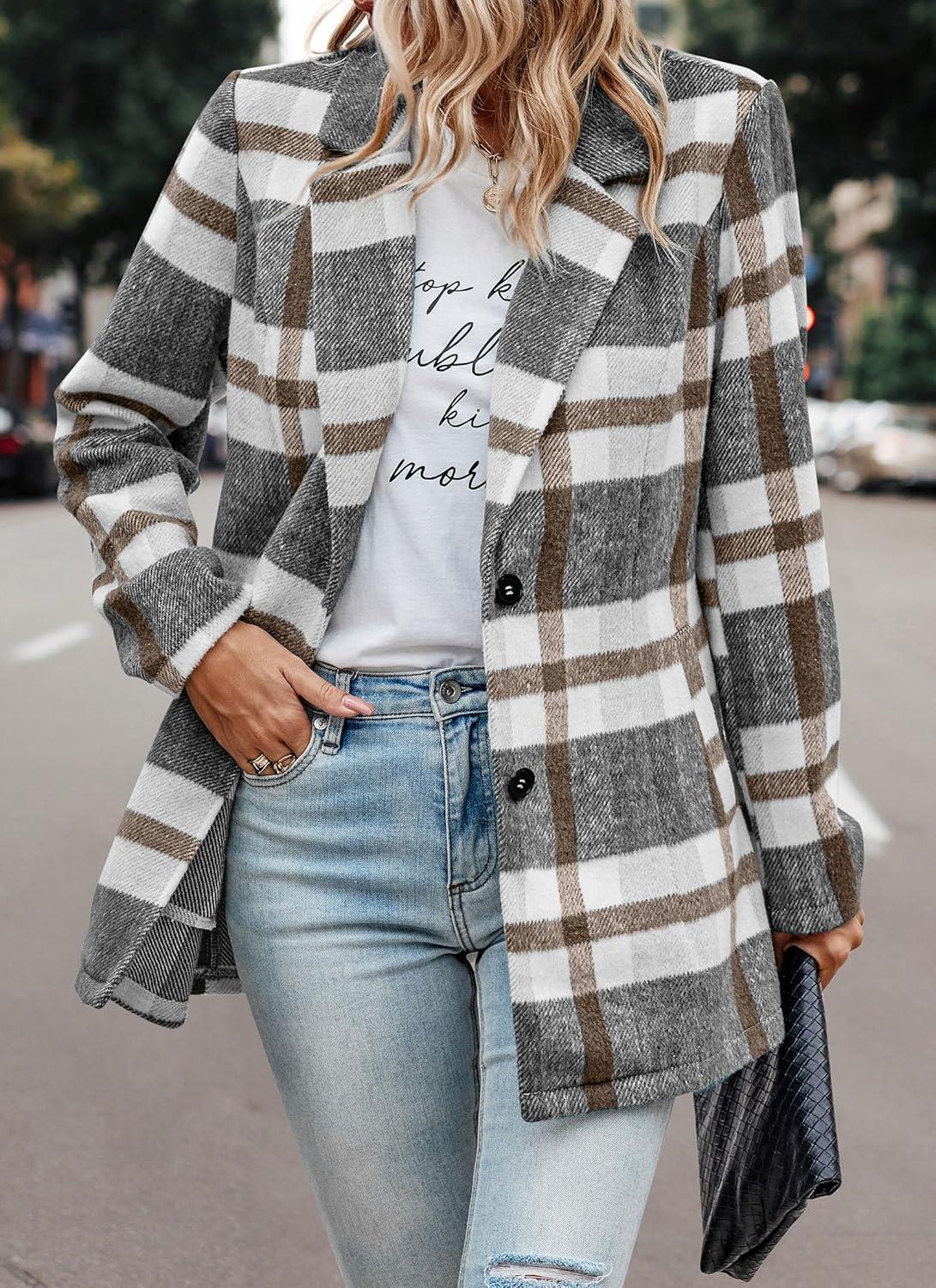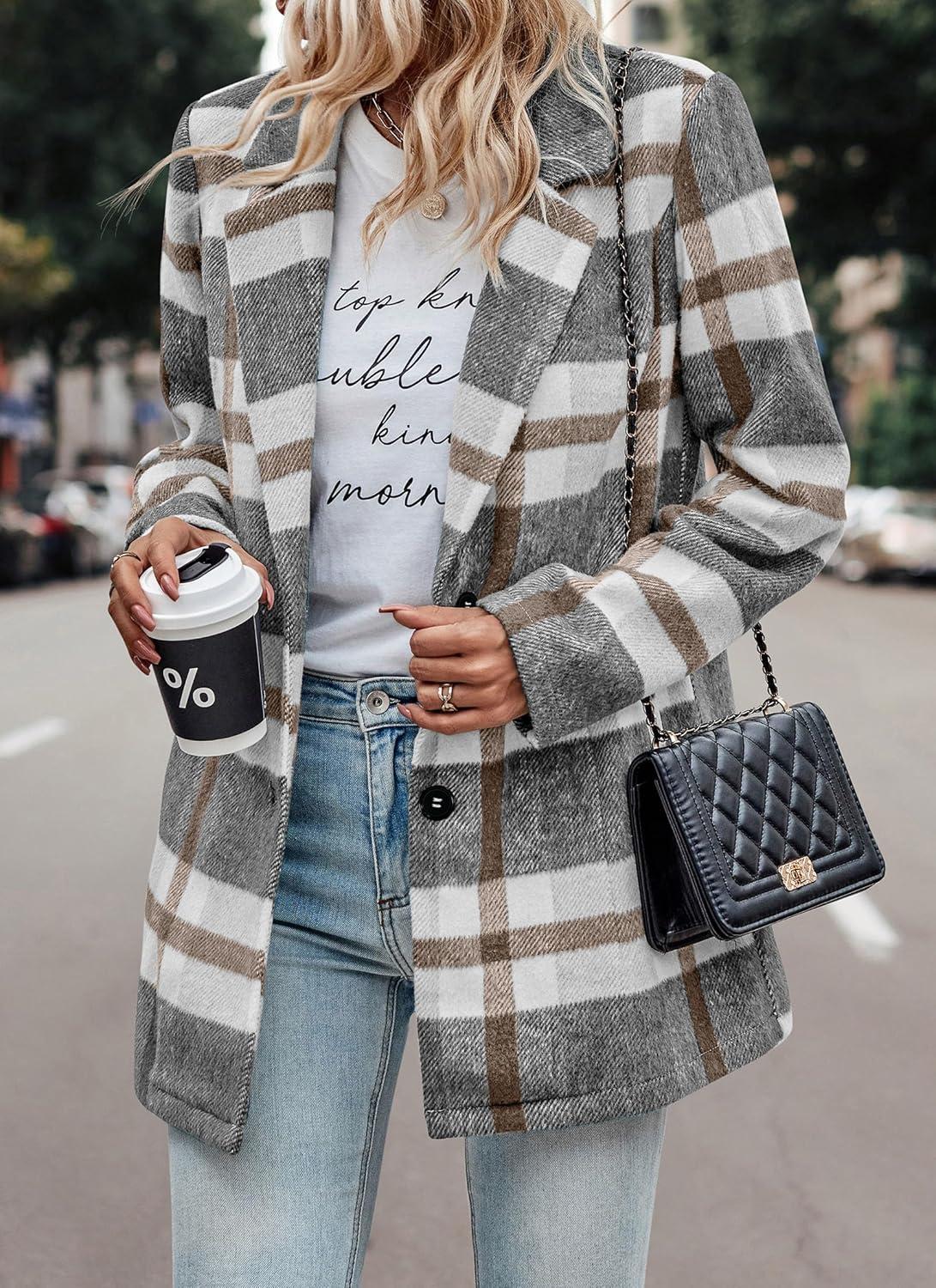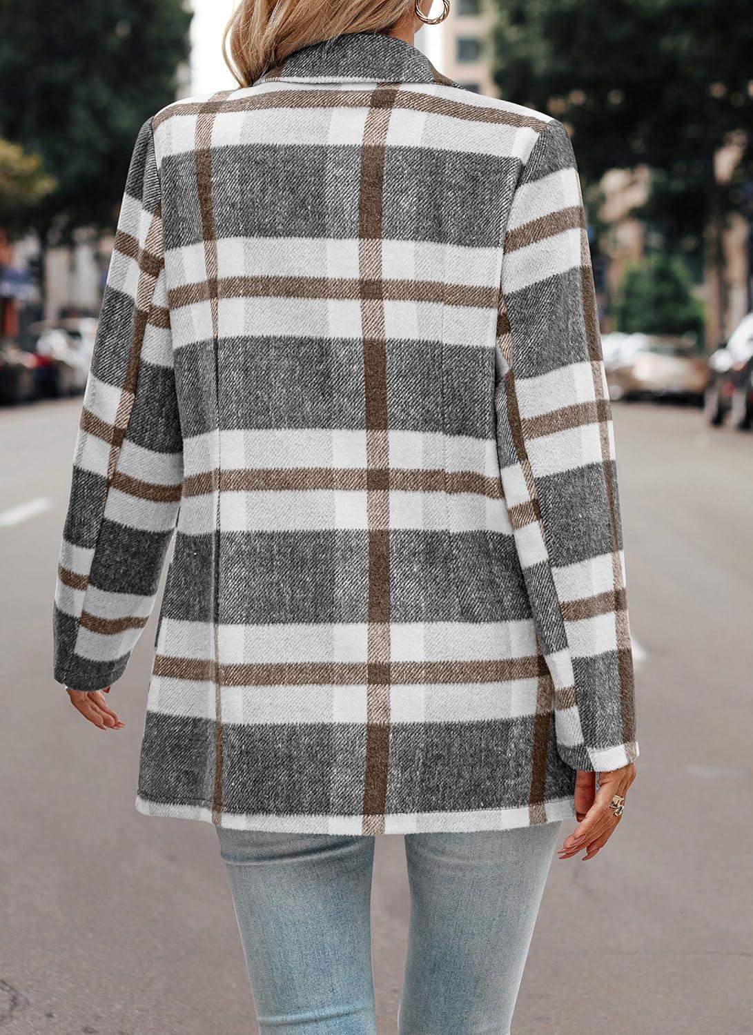 PRETTYGARDEN Women Plaid Shacket Jacket Trendy Fall Casual Button Wool Blend Tartan Trench Coat Winter Clothing with Pockets(Short Style Grey White)