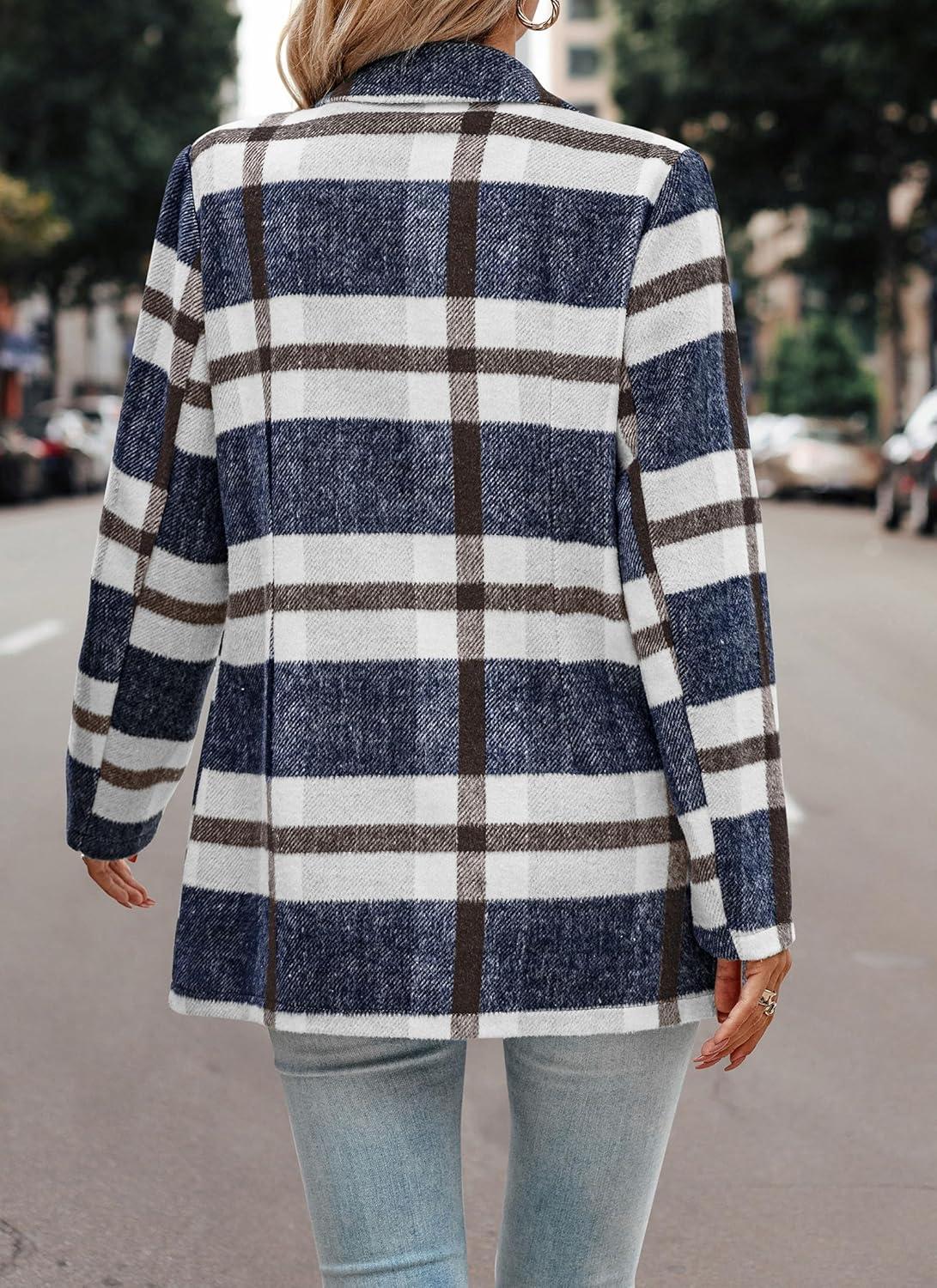 imagePRETTYGARDEN Women Plaid Shacket Jacket Trendy Fall Casual Button Wool Blend Tartan Trench Coat Winter Clothing with PocketsShort Style Navy Plaid