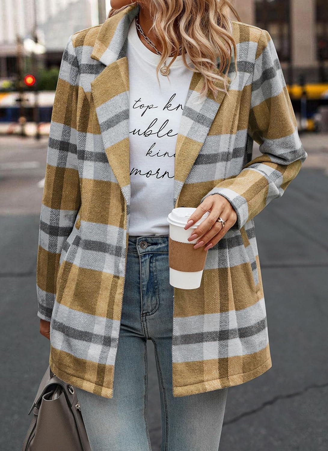 imagePRETTYGARDEN Women Plaid Shacket Jacket Trendy Fall Casual Button Wool Blend Tartan Trench Coat Winter Clothing with PocketsShort Style Yellow Plaid