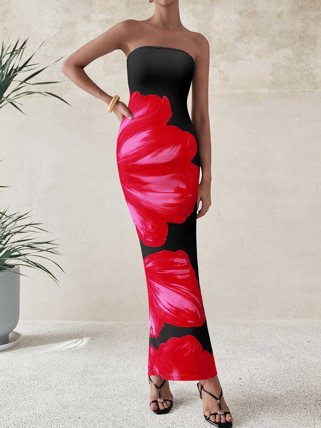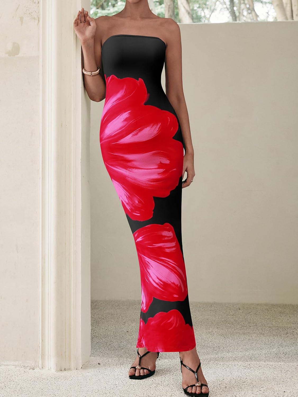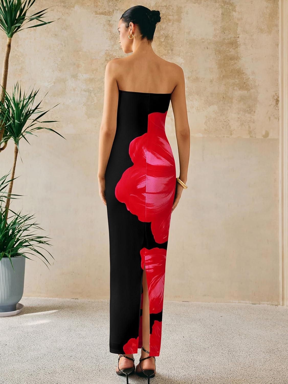 PRETTYGARDEN Women Summer Strapless Maxi Dress Bodycon Floral Sexy Long Wedding Guest Dress Formal Tube Mesh Cocktail Dresses(Black Red Flower)