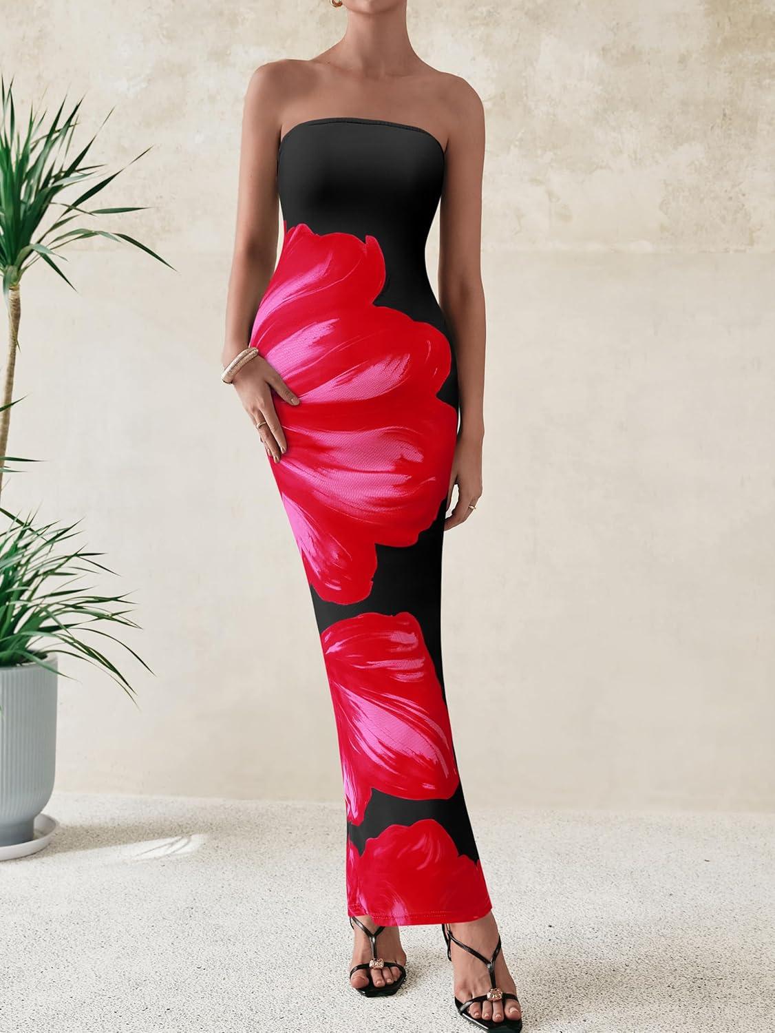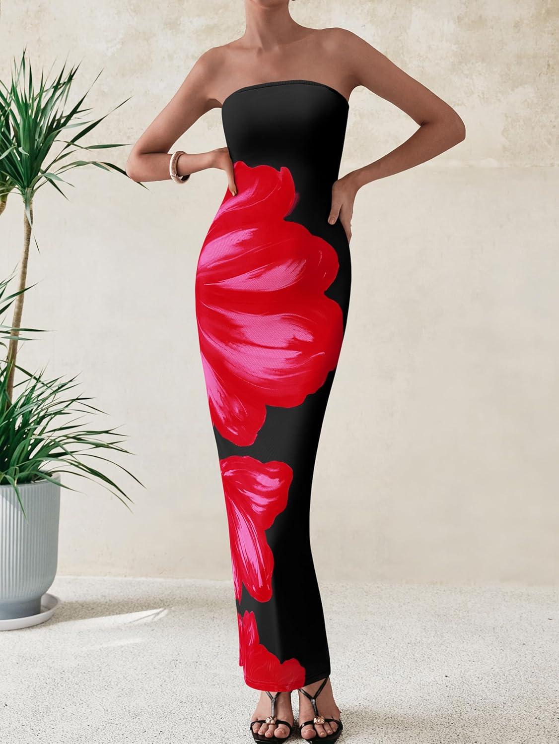 imagePRETTYGARDEN Women Summer Strapless Maxi Dress Bodycon Floral Sexy Long Wedding Guest Dress Formal Tube Mesh Cocktail DressesBlack Red Flower