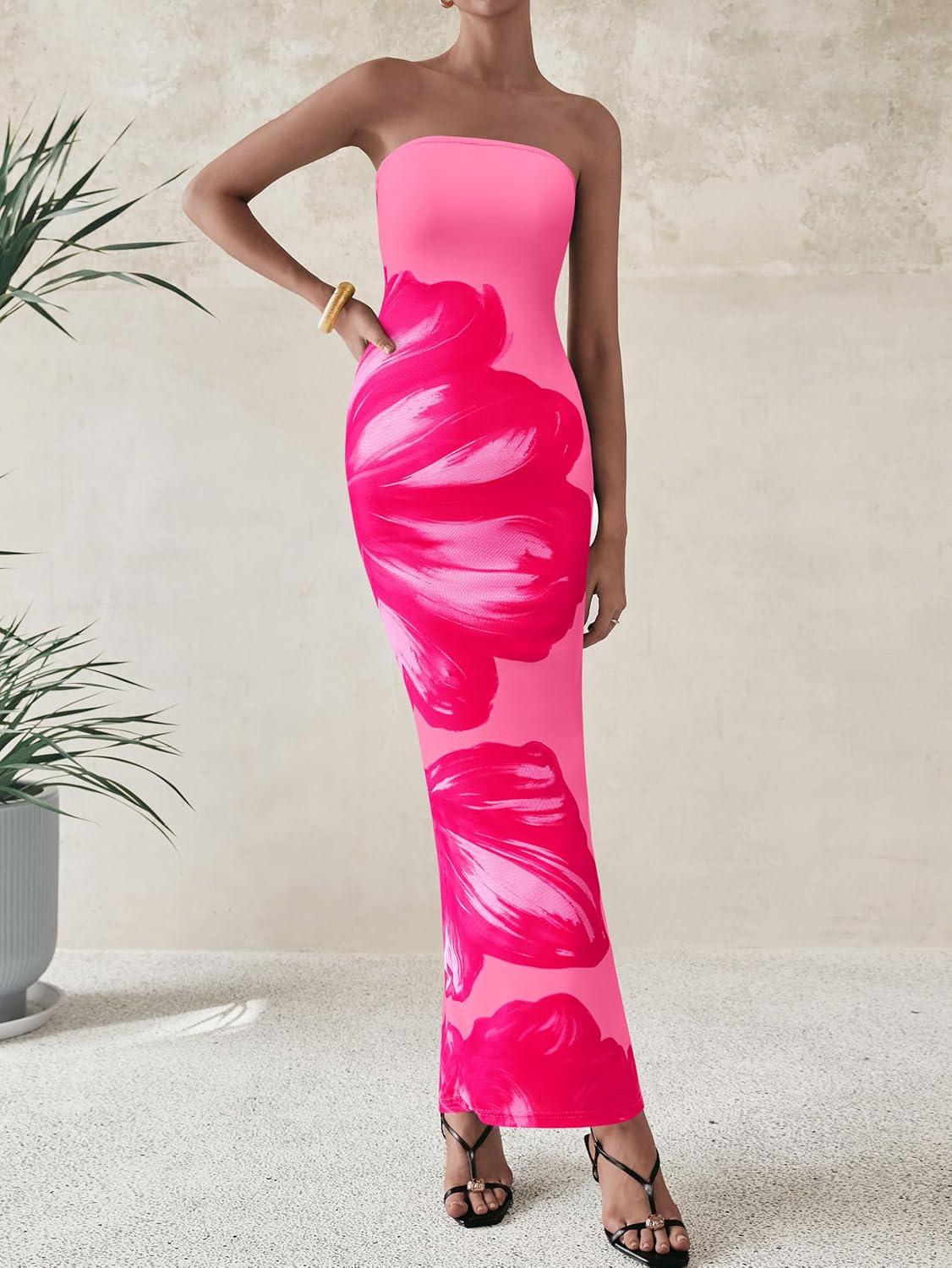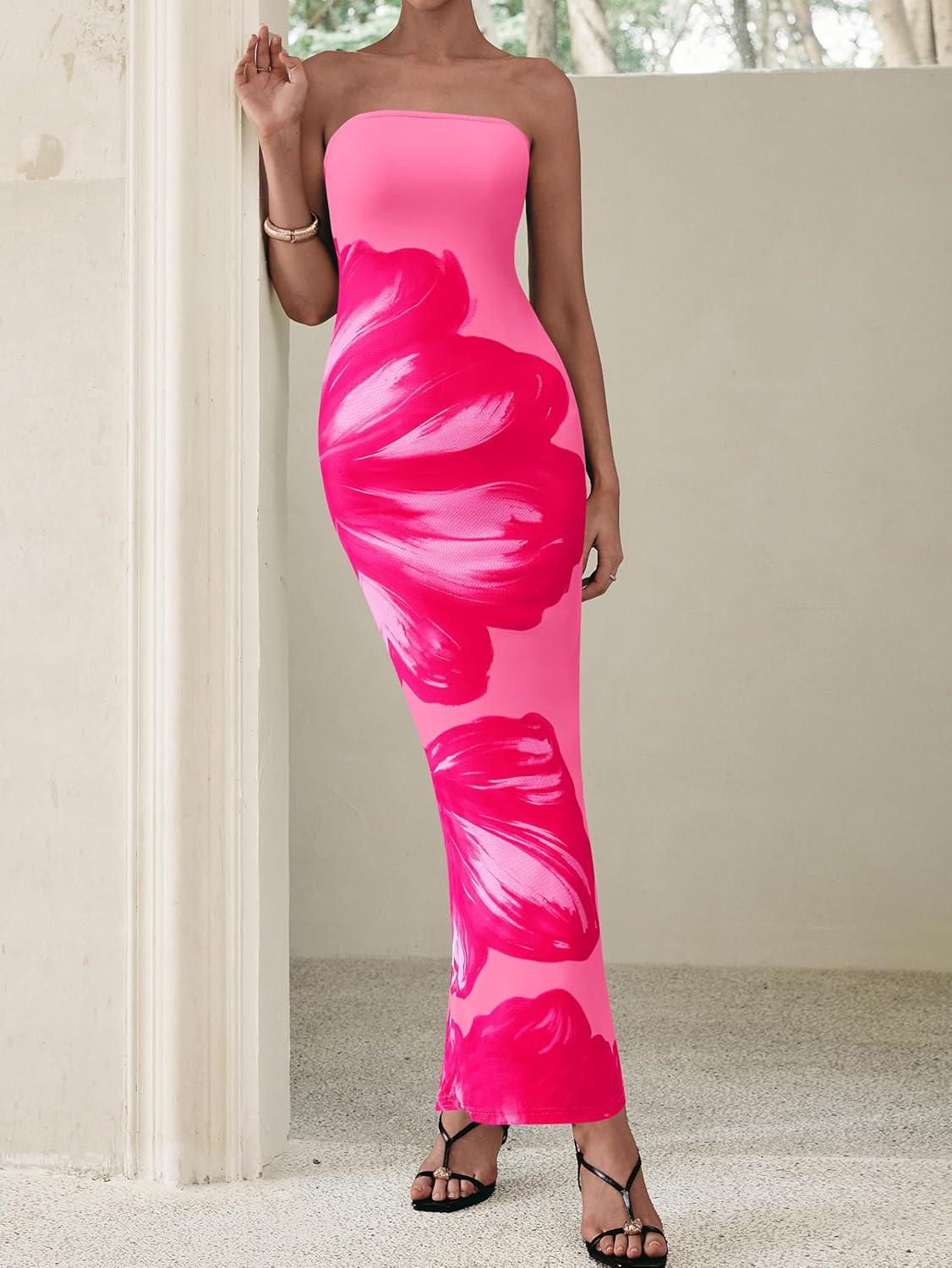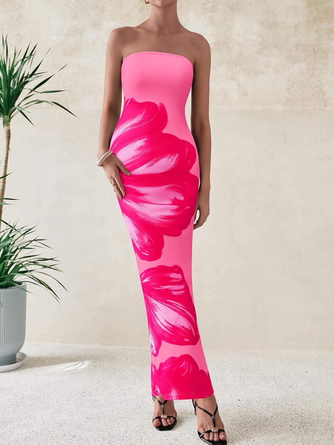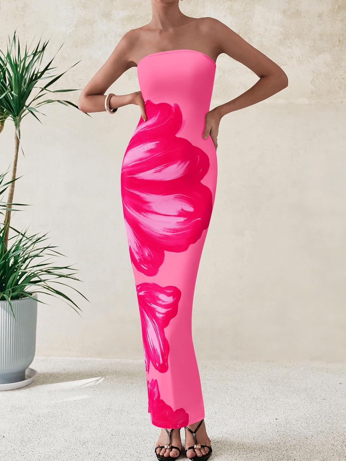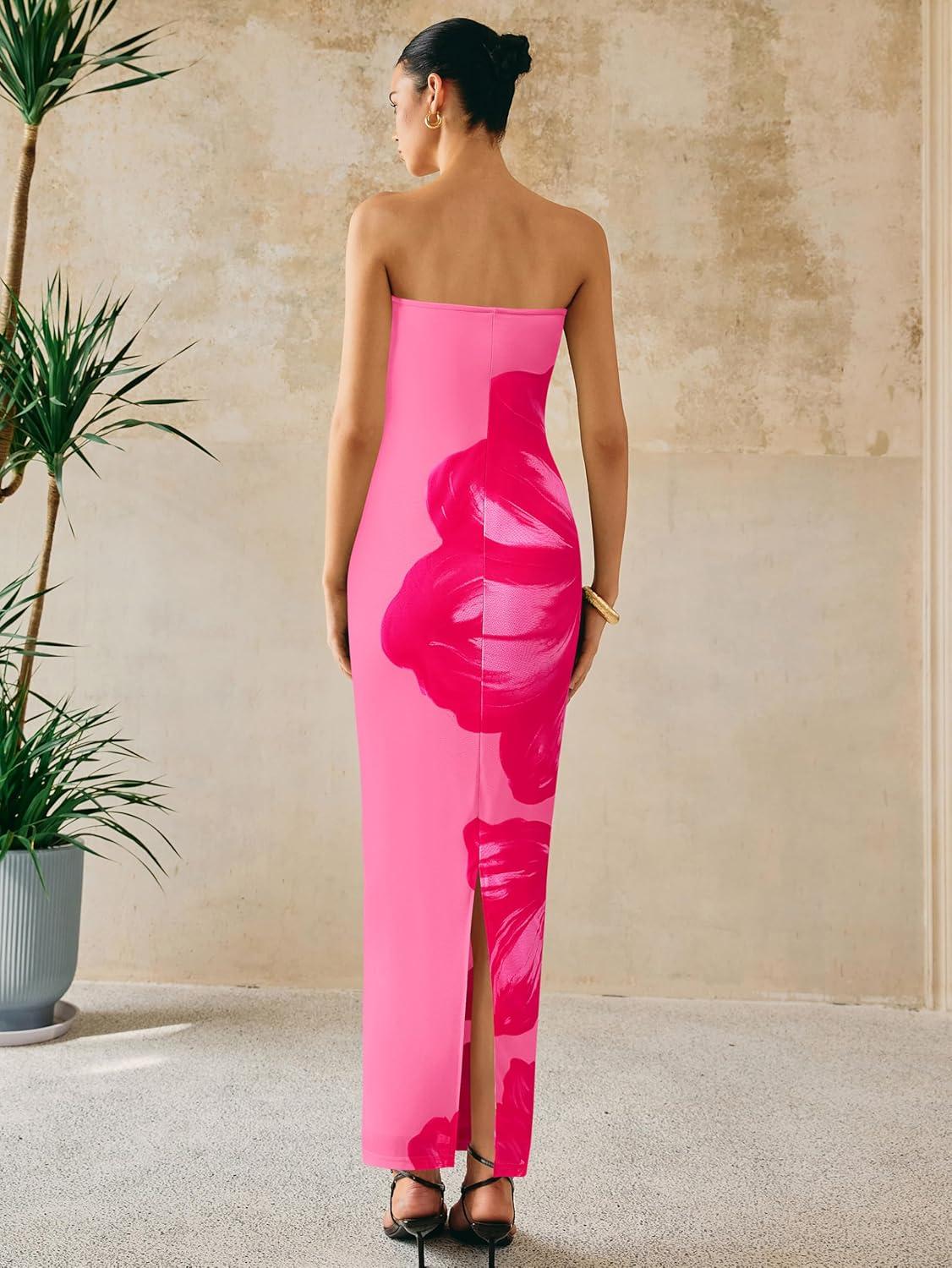 imagePRETTYGARDEN Women Summer Strapless Maxi Dress Bodycon Floral Sexy Long Wedding Guest Dress Formal Tube Mesh Cocktail DressesRed Pink Flower