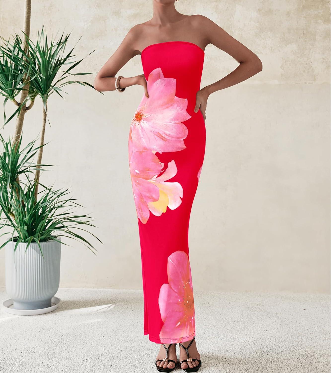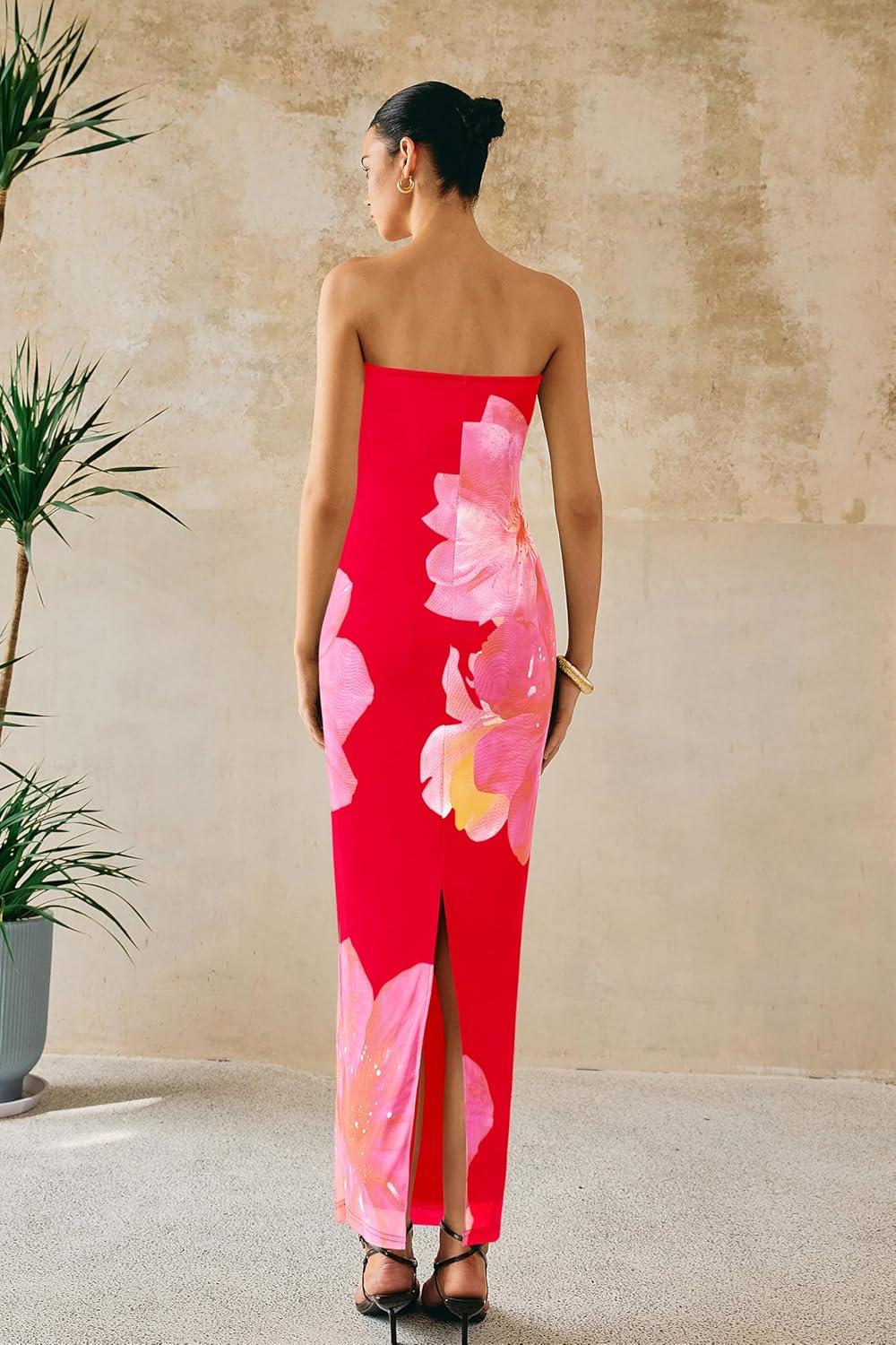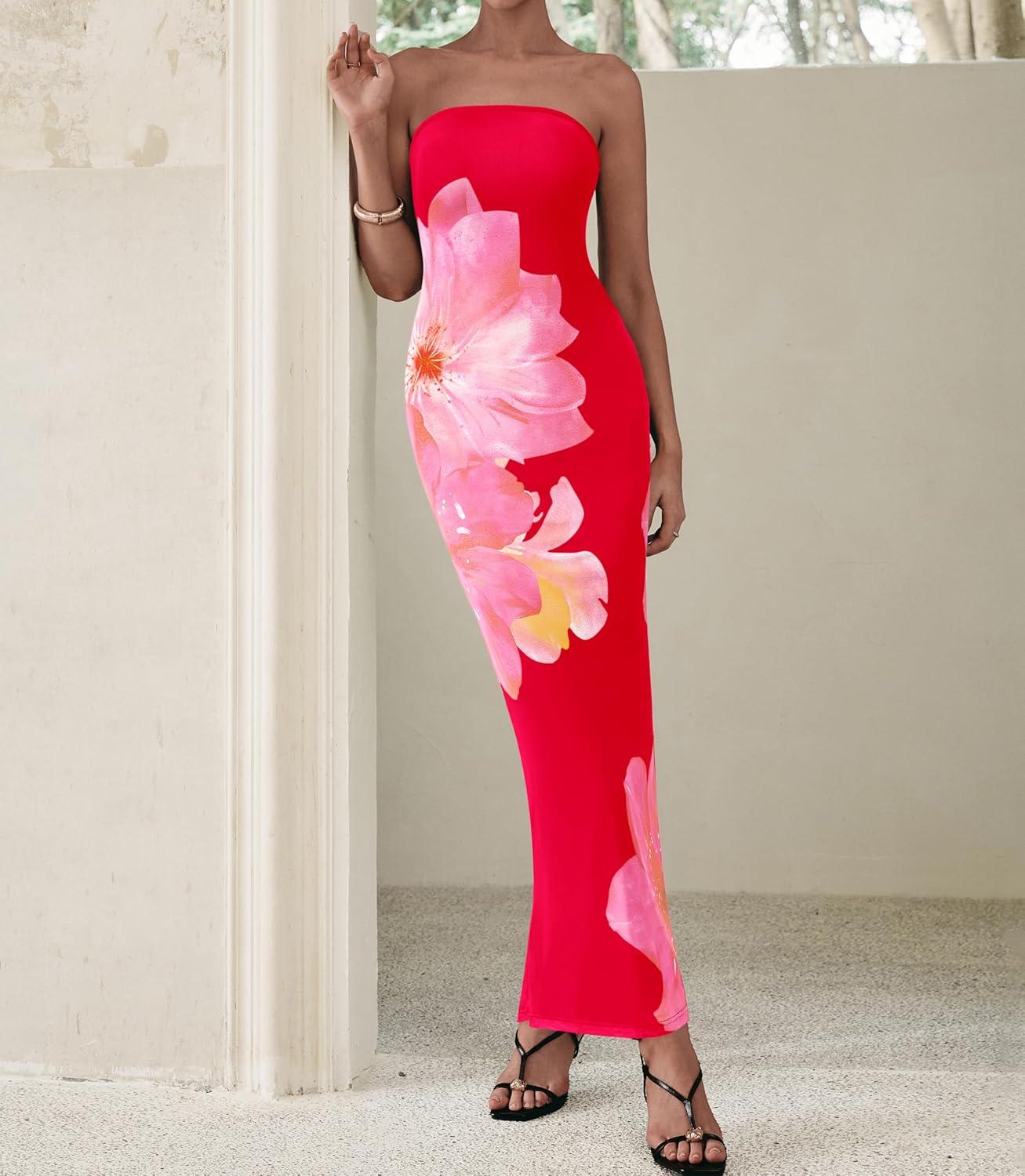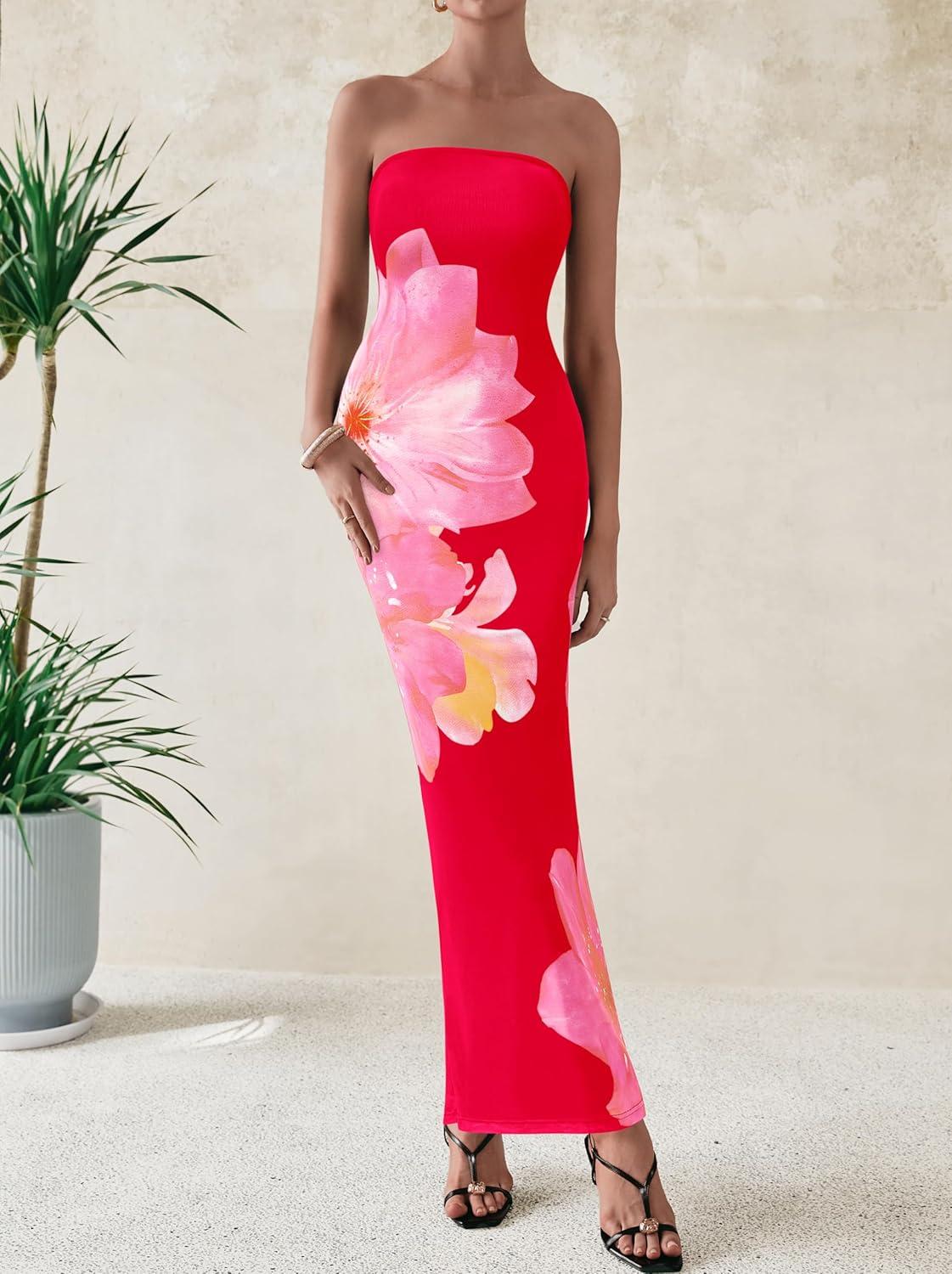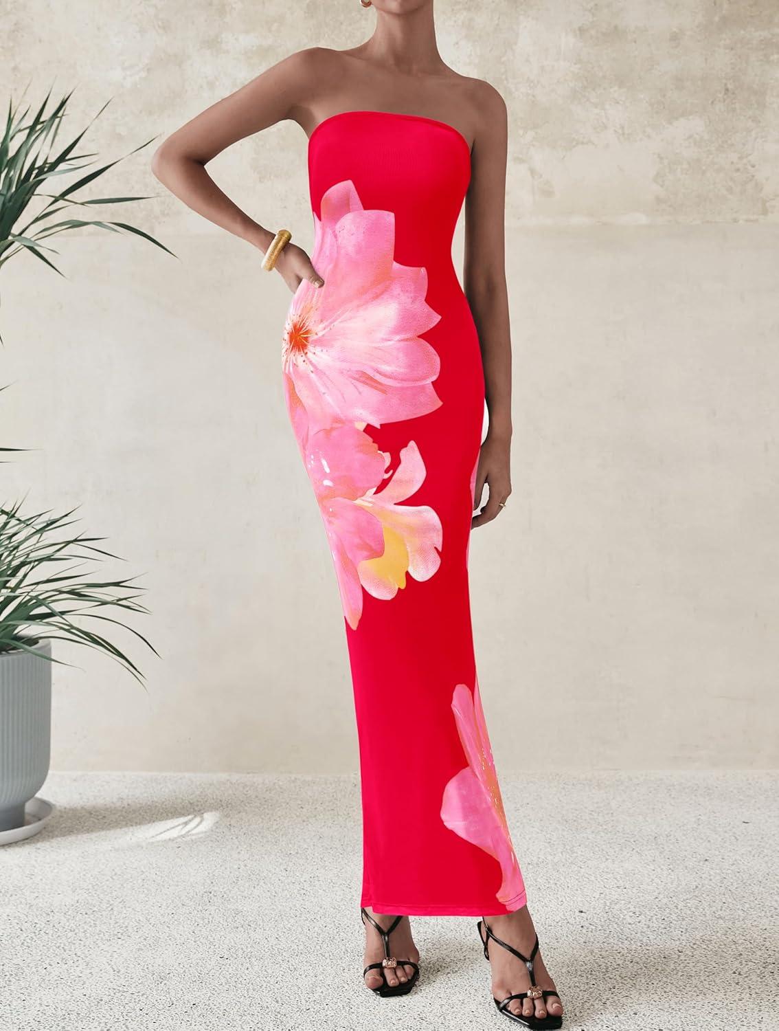 PRETTYGARDEN Women Summer Strapless Maxi Dress Bodycon Floral Sexy Long Wedding Guest Dress Formal Tube Mesh Cocktail Dresses(Red Pink Flower)