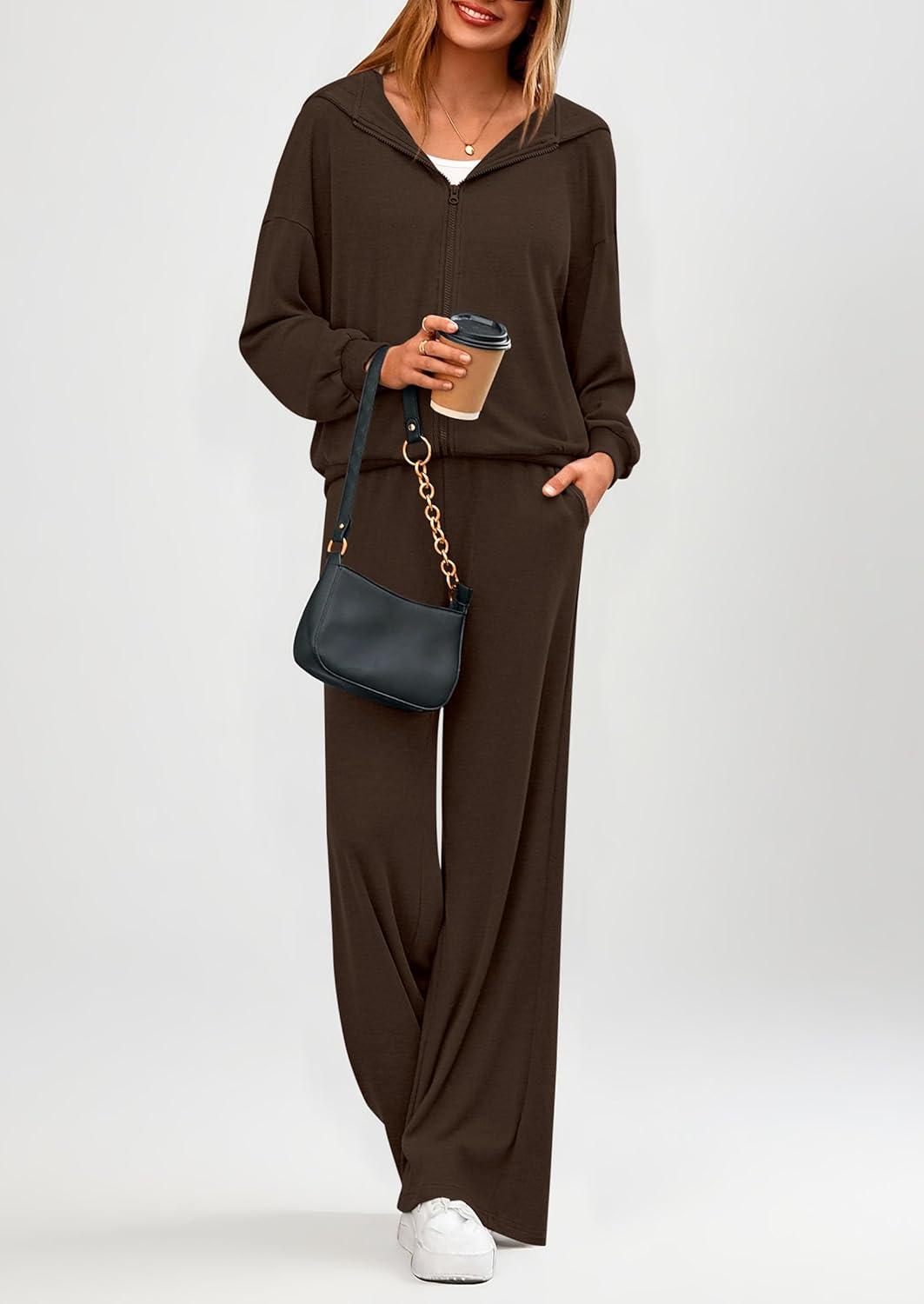 PRETTYGARDEN Women's 2 Piece Fall Lounge Sets 2025 Zip Up Hoodie Wide Leg Pants Tracksuit Matching Travel Outfits Clothes(Brown)