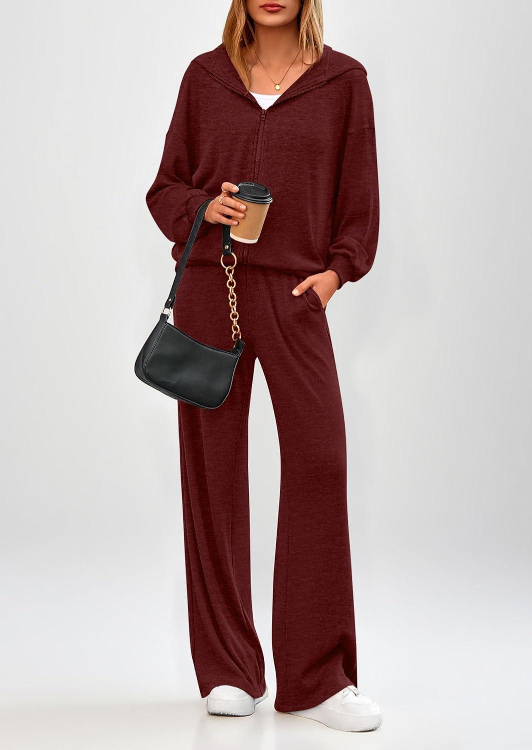 PRETTYGARDEN Women’s 2 Piece Fall Lounge Sets 2025 Zip Up Hoodie Wide Leg Pants Tracksuit Matching Travel Outfits Clothes(Burgundy)