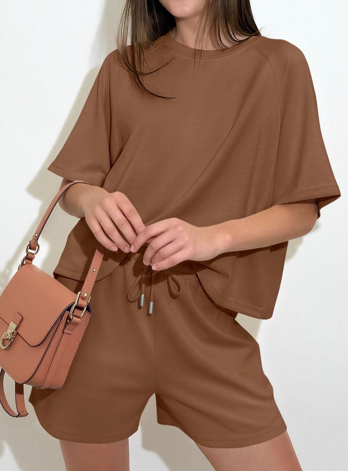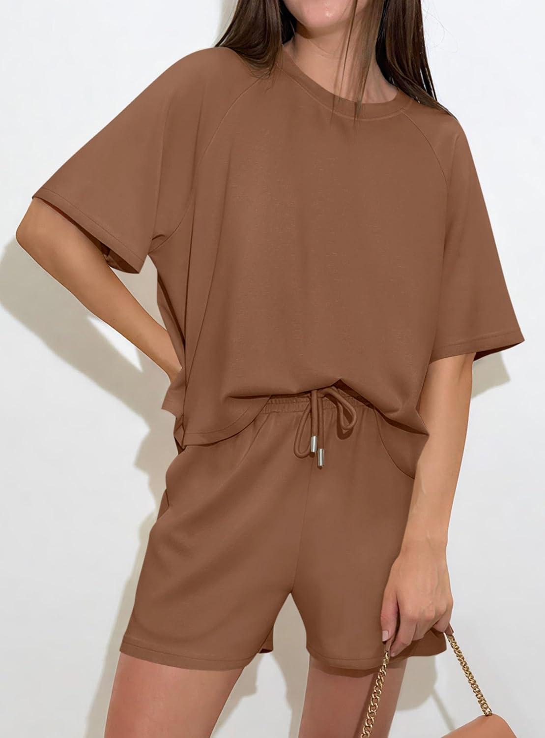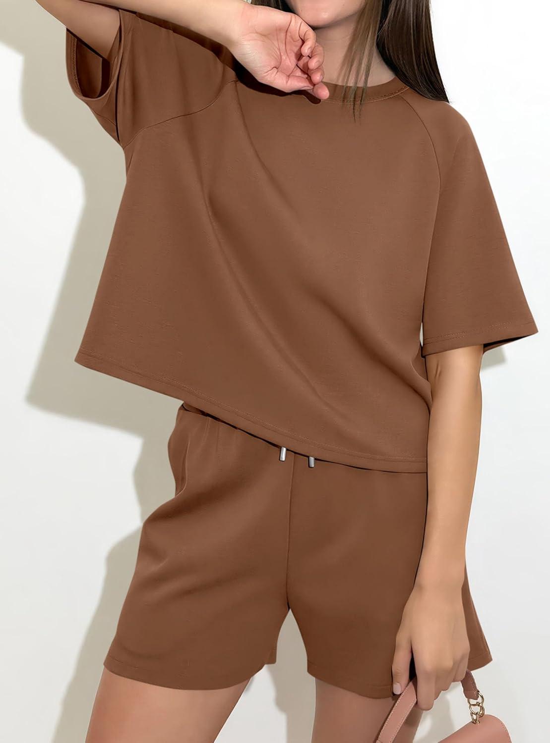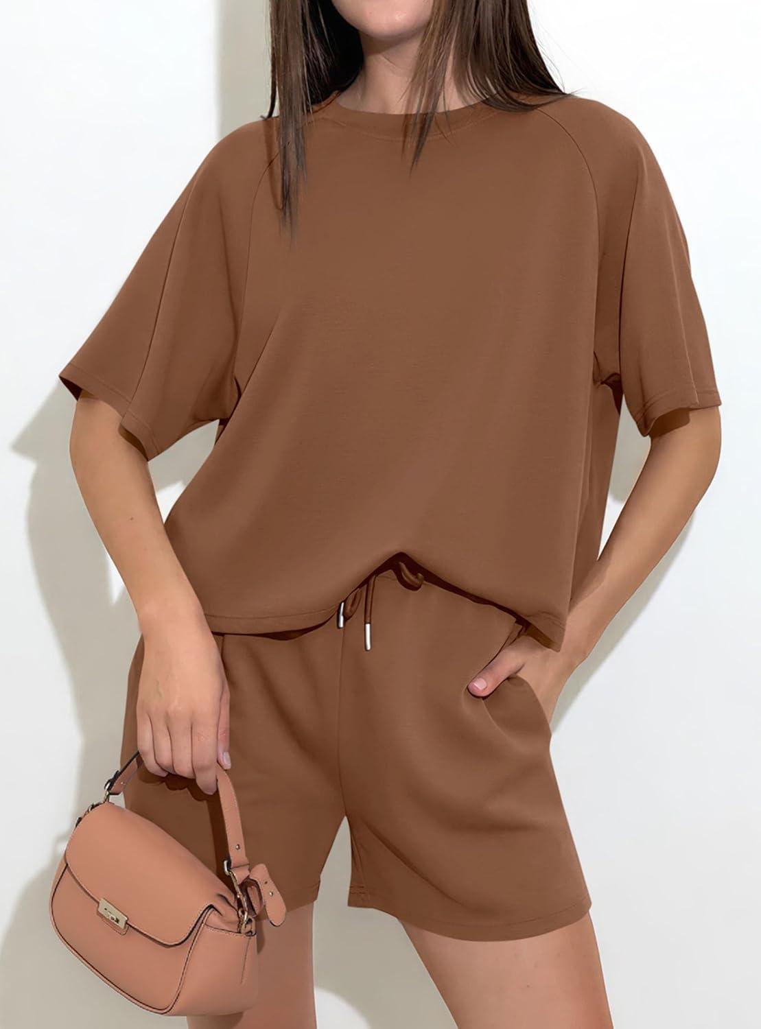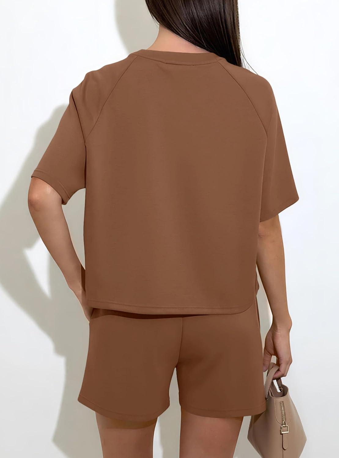 PRETTYGARDEN Women’s 2 Piece Lounge Sets Short Sleeve Shirts Casual Tops Shorts Matching Clothing 2026 Summer Airport Outfits(Brown)