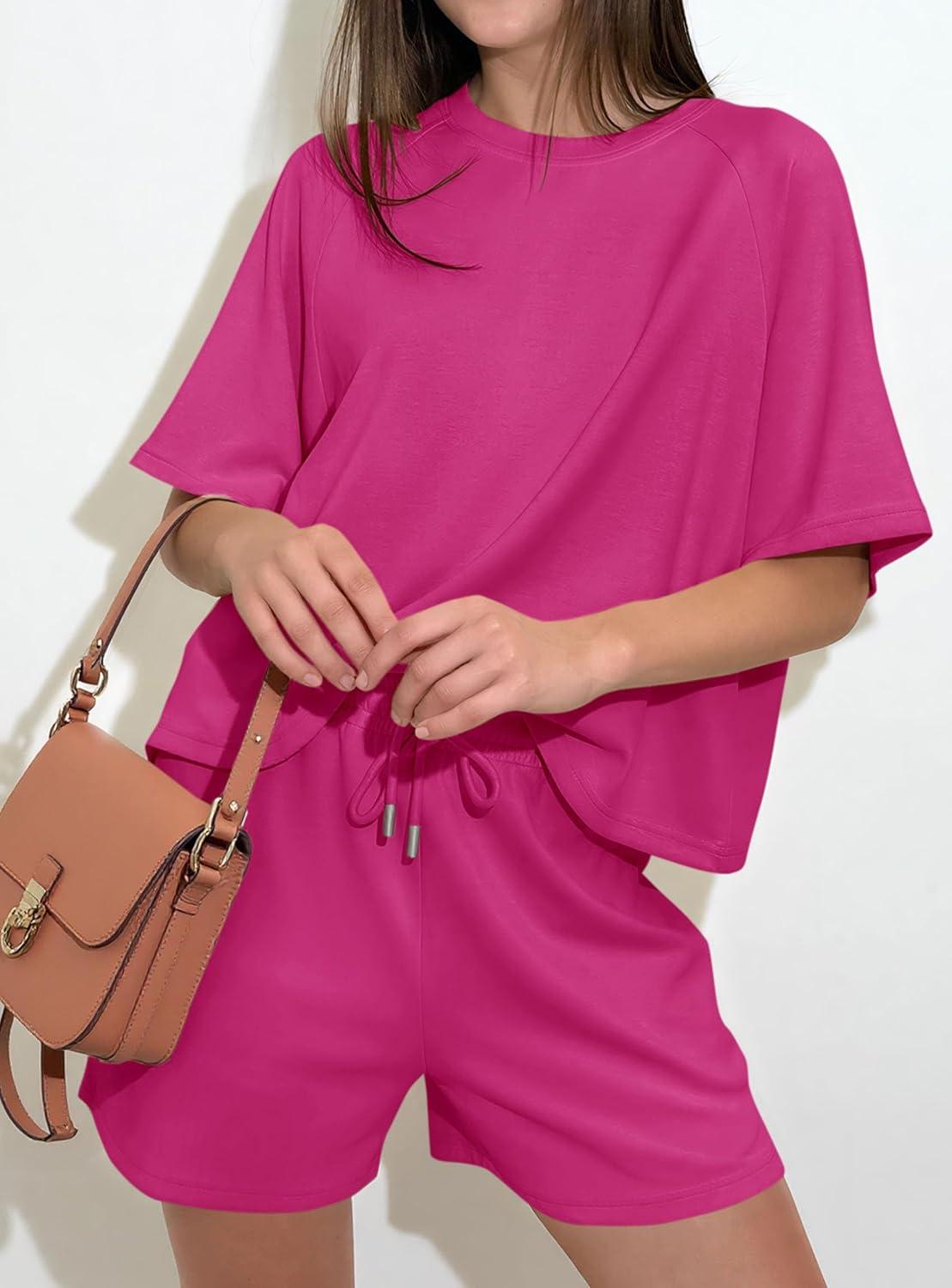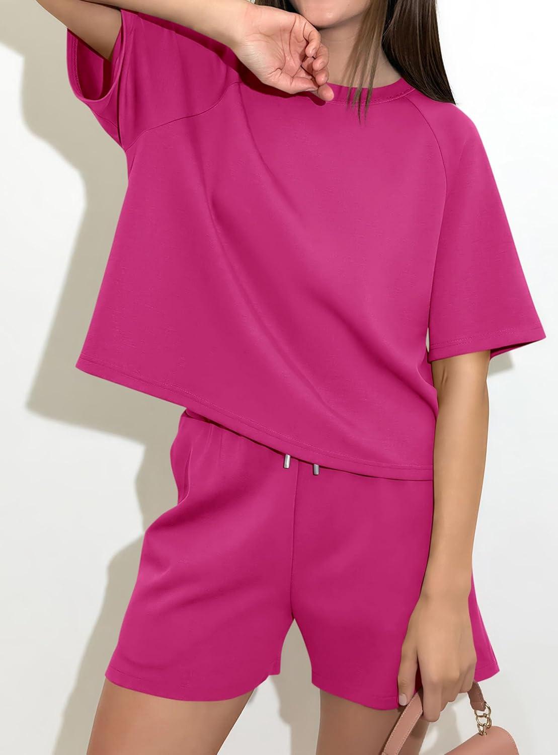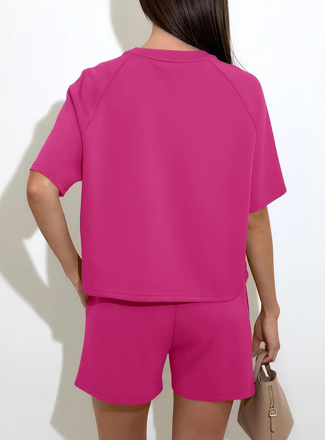 PRETTYGARDEN Women's 2 Piece Lounge Sets Short Sleeve Shirts Casual Tops Shorts Matching Clothing 2026 Summer Airport Outfits(Rose Red)