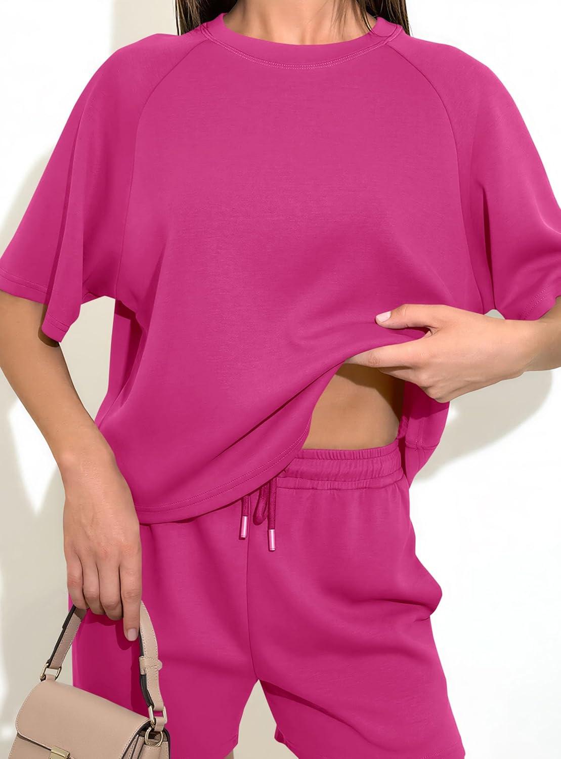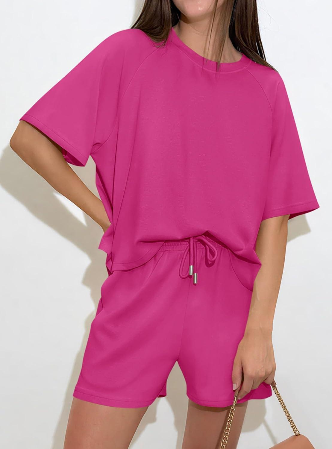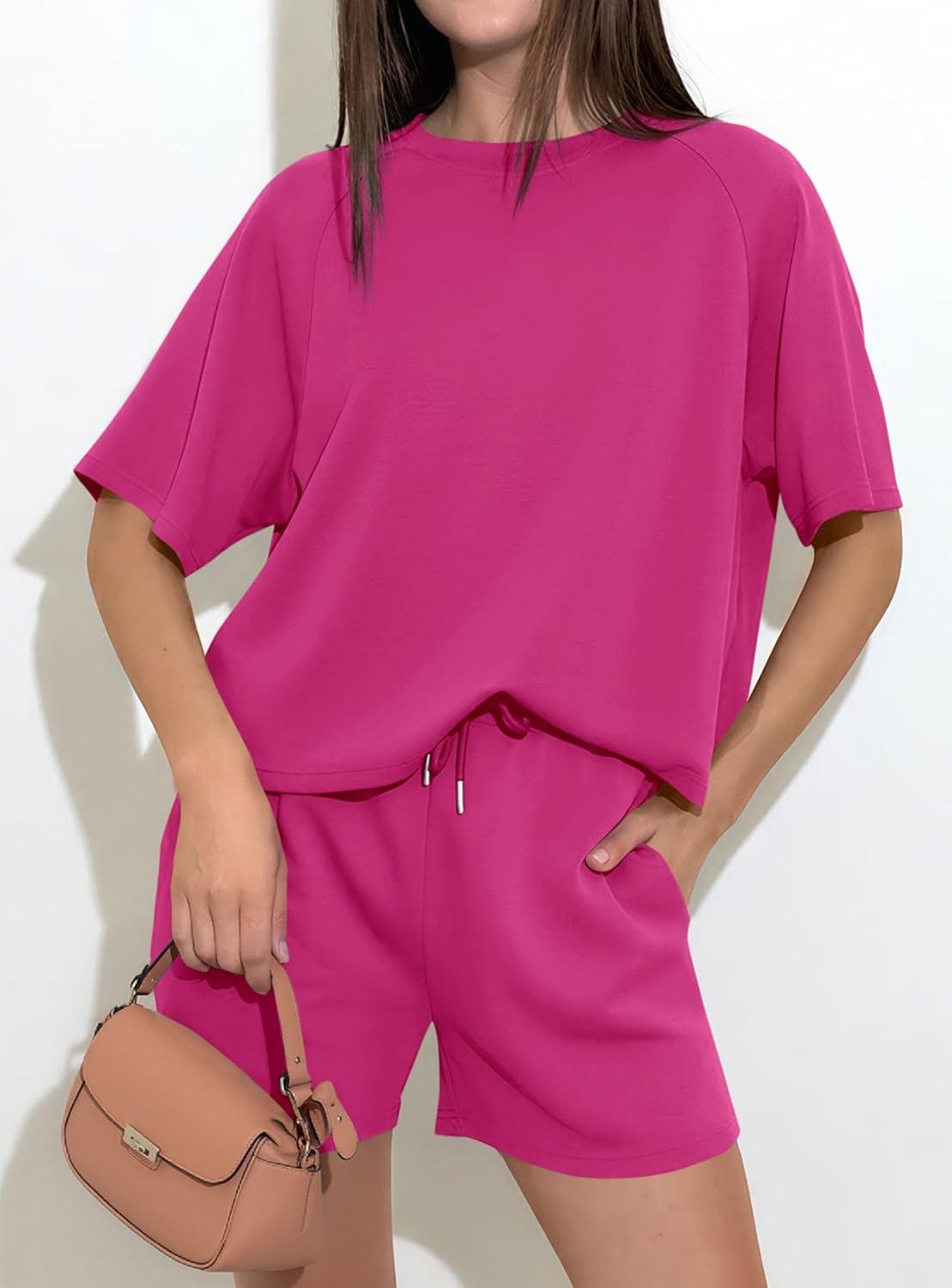 PRETTYGARDEN Women's 2 Piece Lounge Sets Short Sleeve Shirts Casual Tops Shorts Matching Clothing 2026 Summer Airport Outfits(Rose Red)