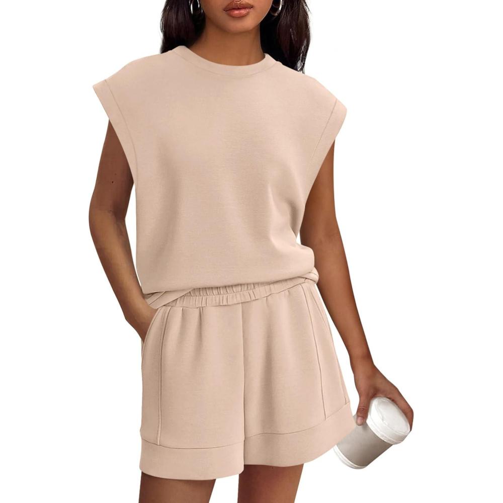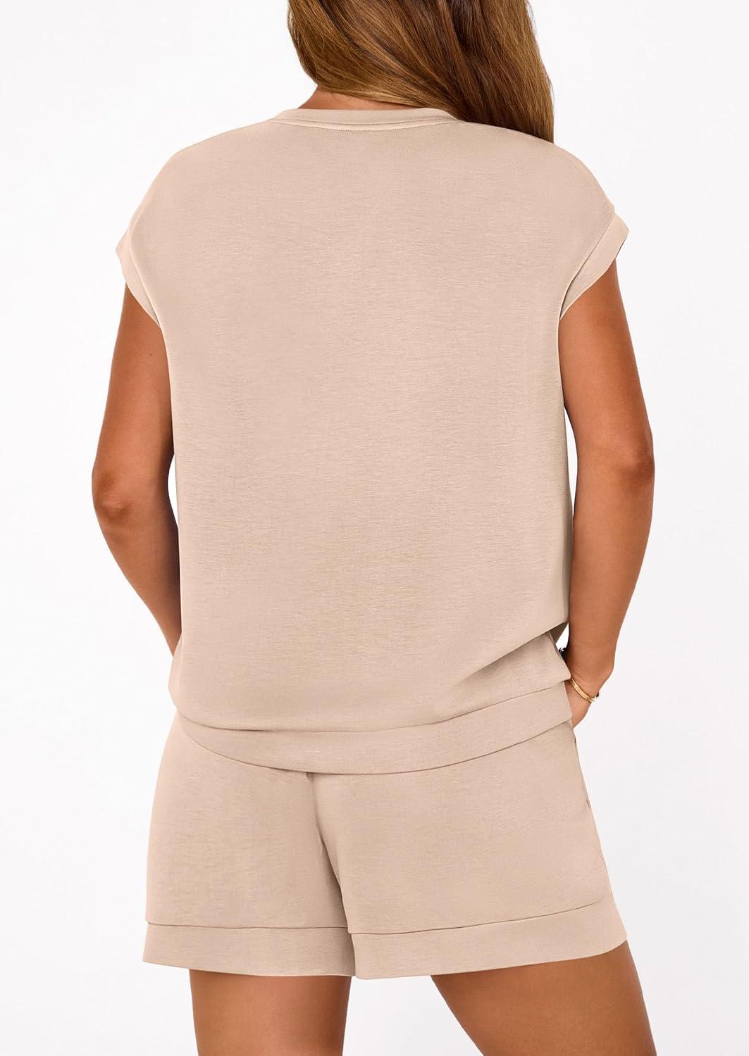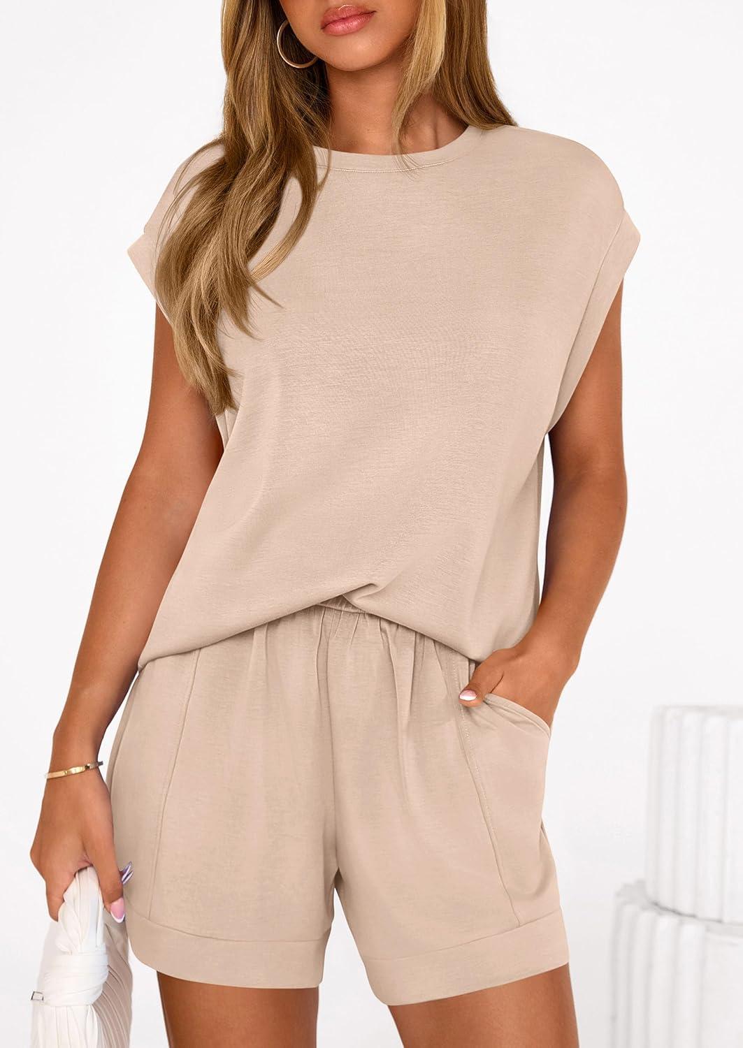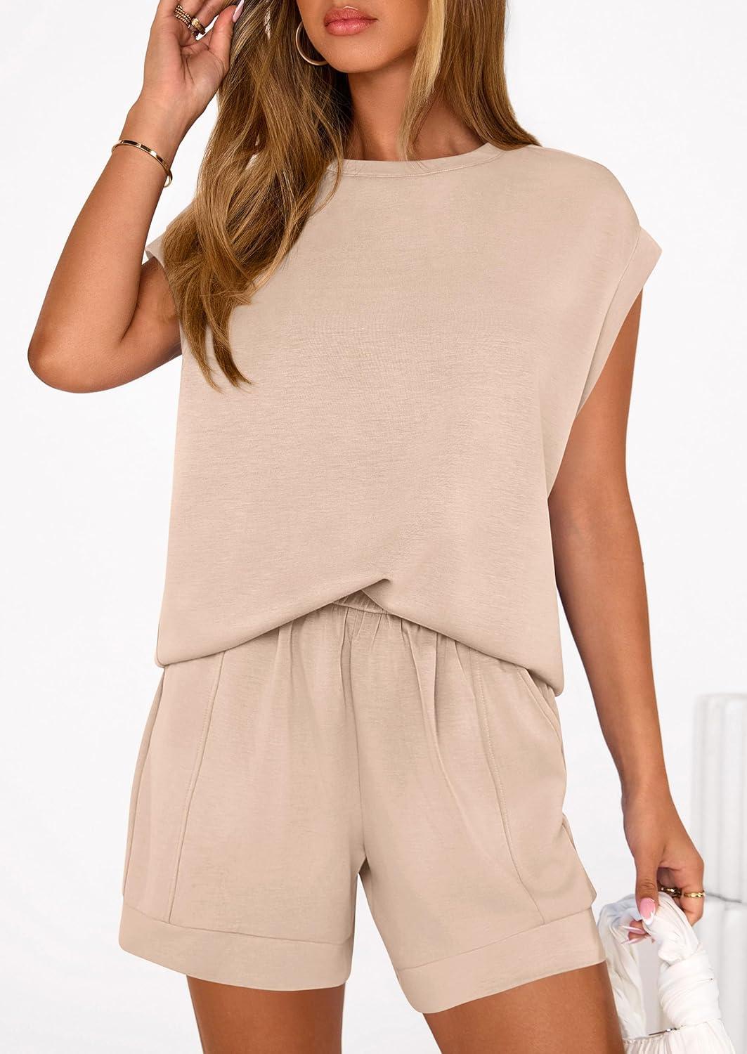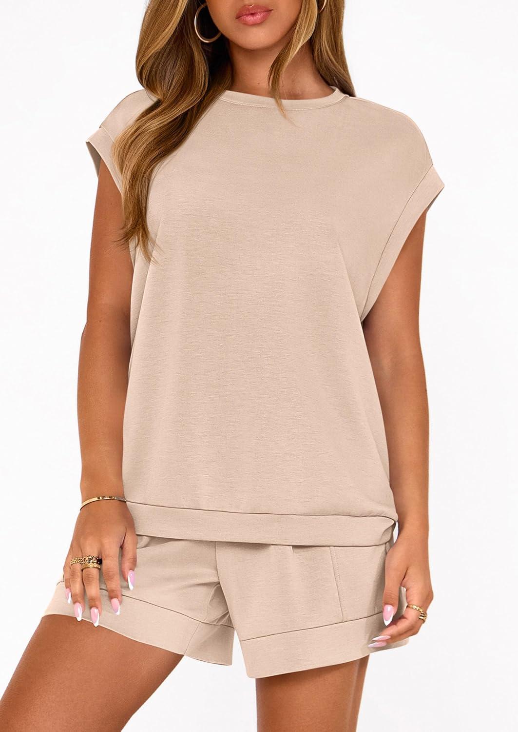 PRETTYGARDEN Women’s 2 Piece Lounge Shorts Sets 2026 Summer Travel Outfits Casual Beach Vacation Clothes Spring Sweatsuits(Beige)