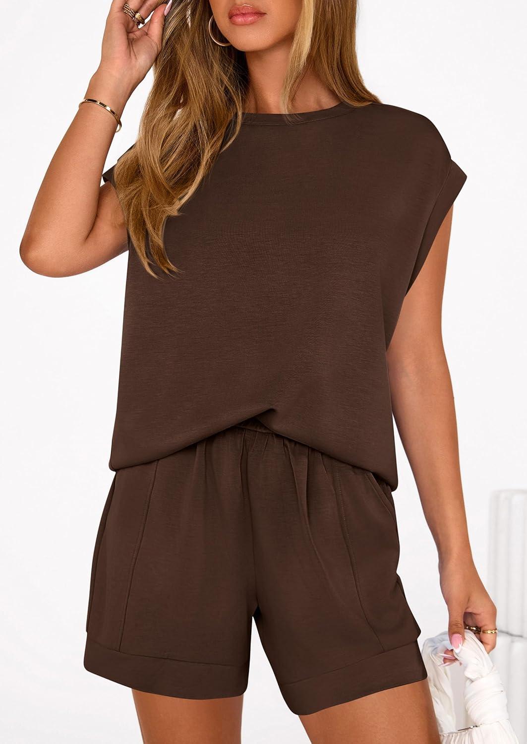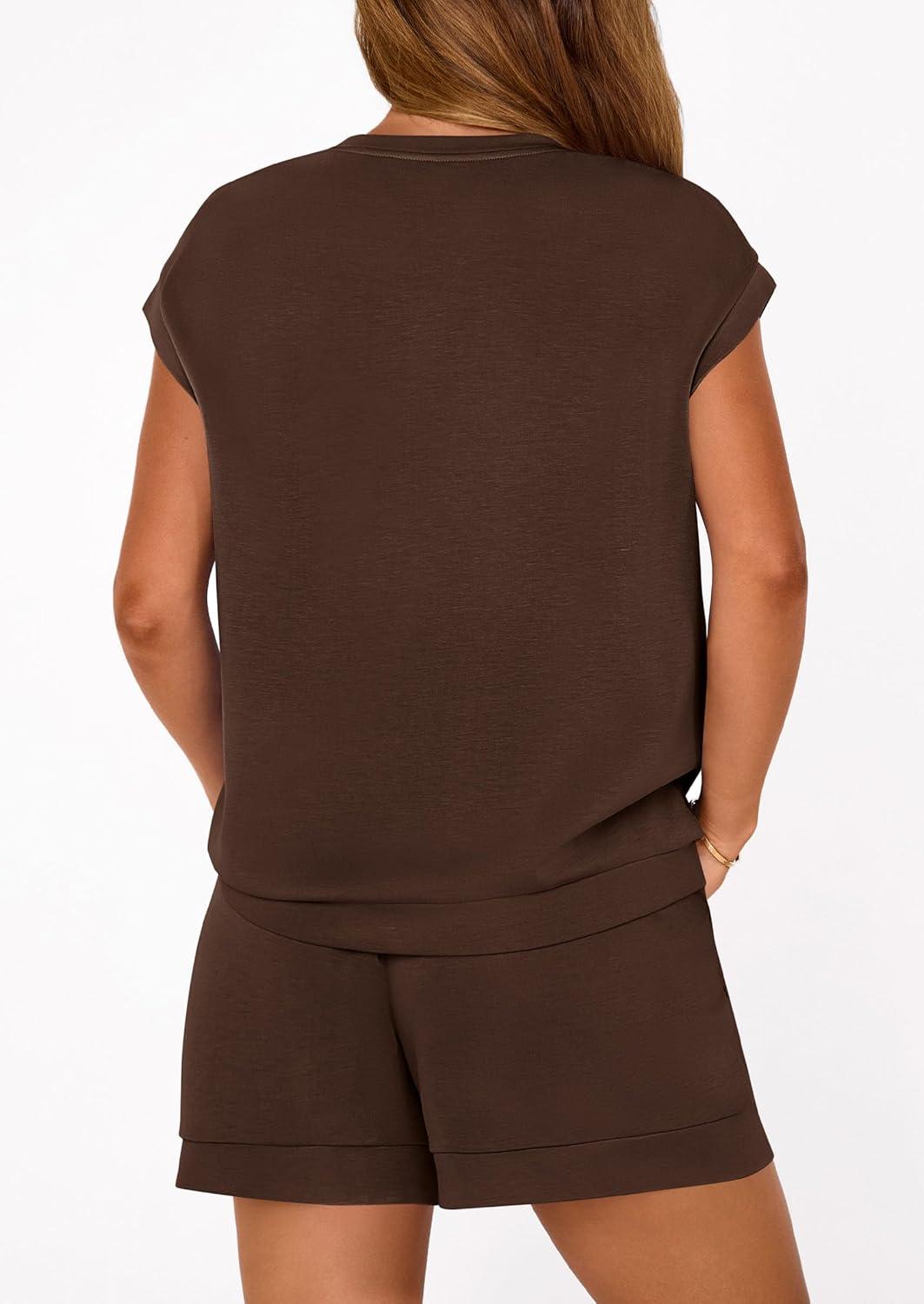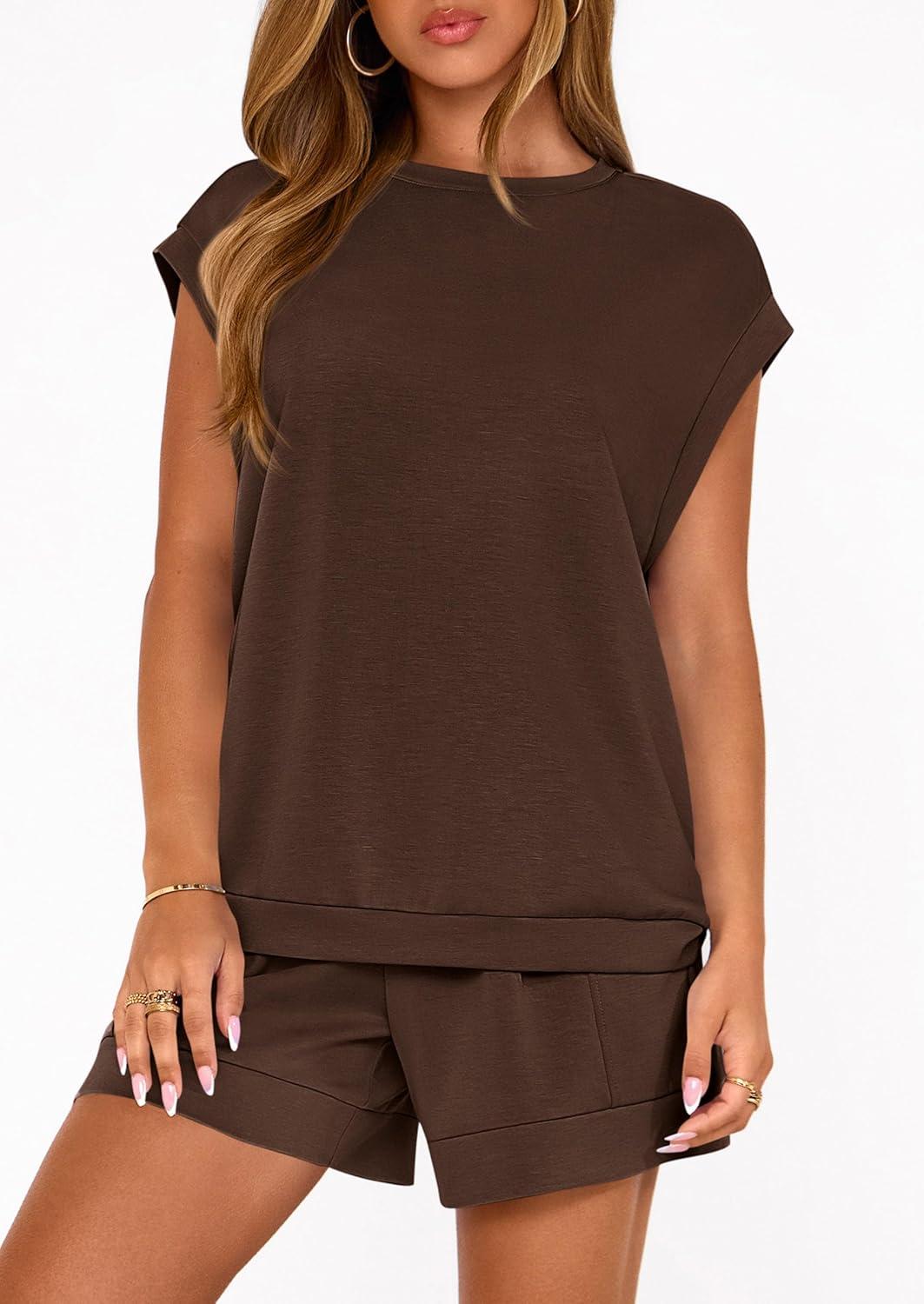 PRETTYGARDEN Women’s 2 Piece Lounge Shorts Sets 2026 Summer Travel Outfits Casual Beach Vacation Clothes Spring Sweatsuits(Brown)