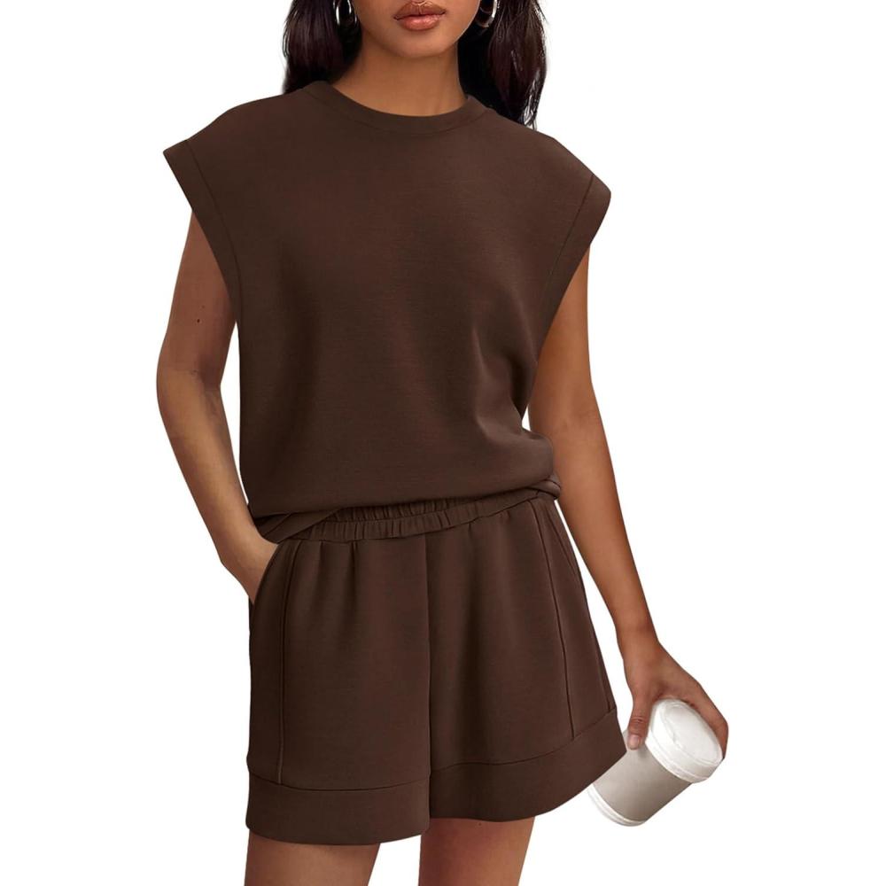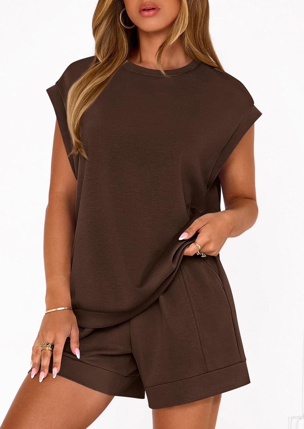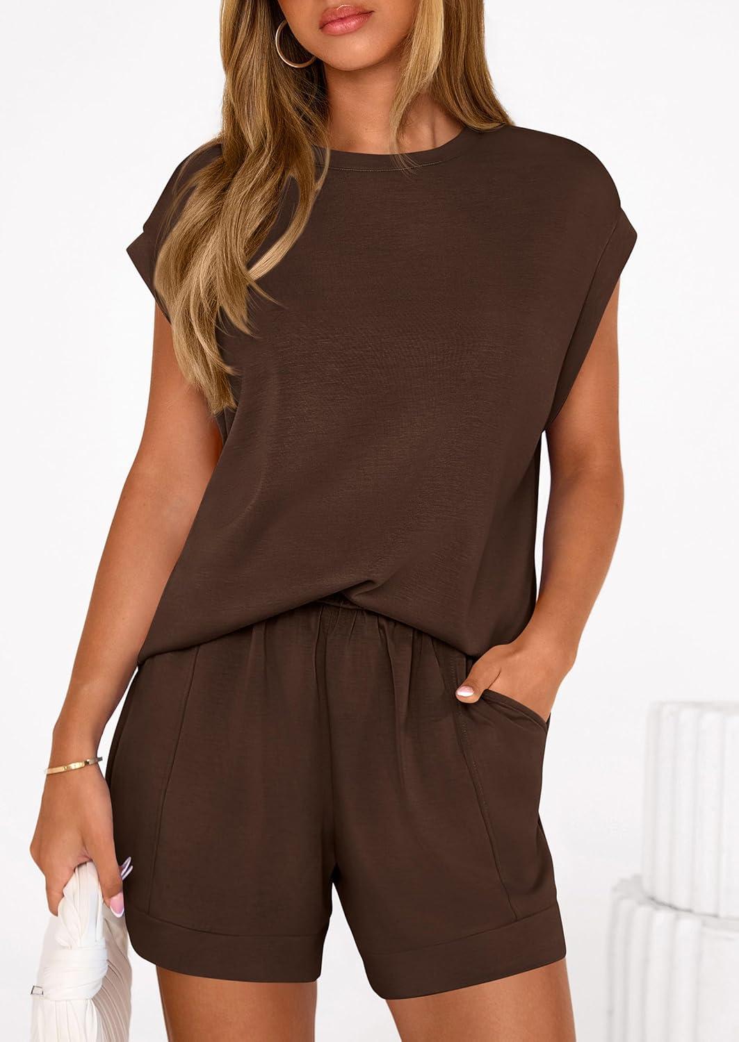 PRETTYGARDEN Women’s 2 Piece Lounge Shorts Sets 2026 Summer Travel Outfits Casual Beach Vacation Clothes Spring Sweatsuits(Brown)