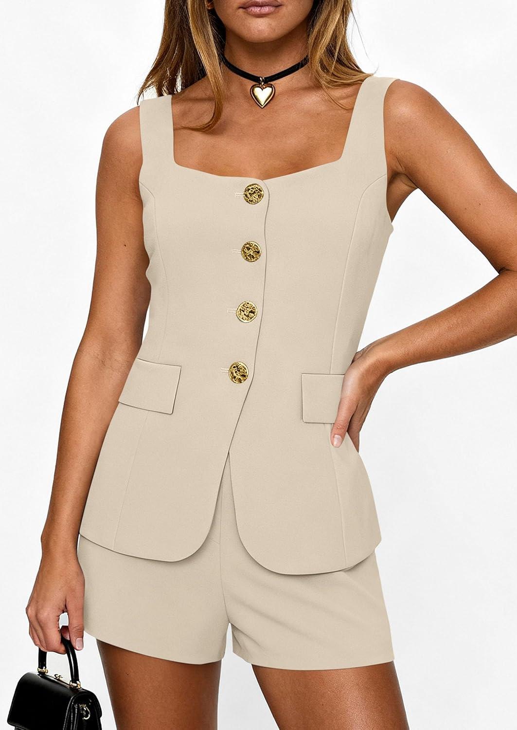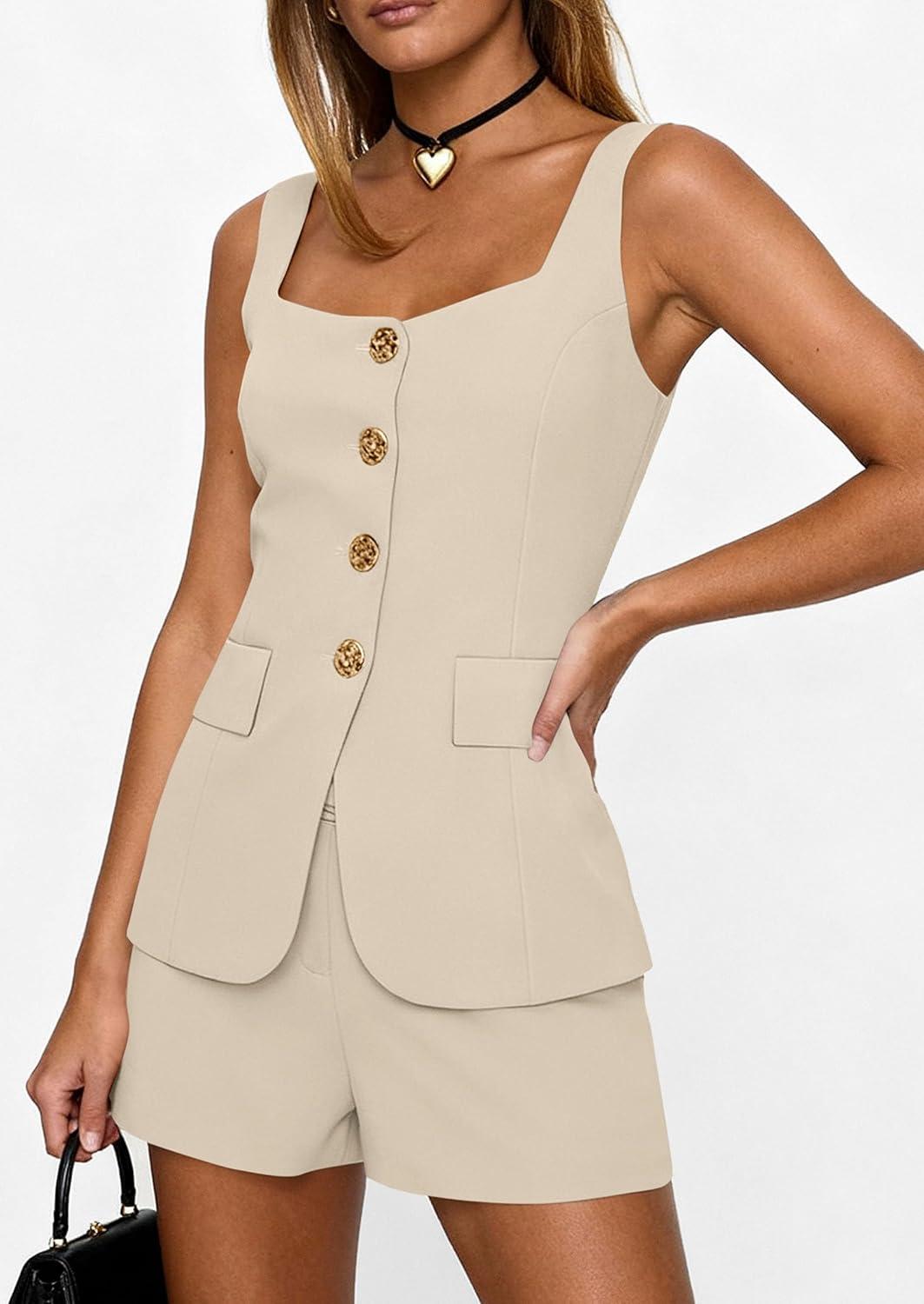 PRETTYGARDEN Womens 2 Piece Matching Sets 2026 Fashion Button Down Suit Vest Tops Shorts Set Spring Business Casual Outfits(Beige)