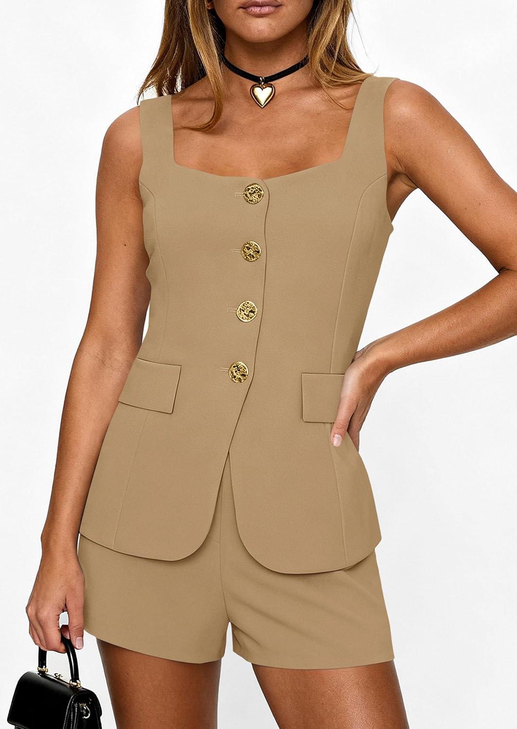 PRETTYGARDEN Womens 2 Piece Matching Sets 2026 Fashion Button Down Suit Vest Tops Shorts Set Spring Business Casual Outfits(Khaki)