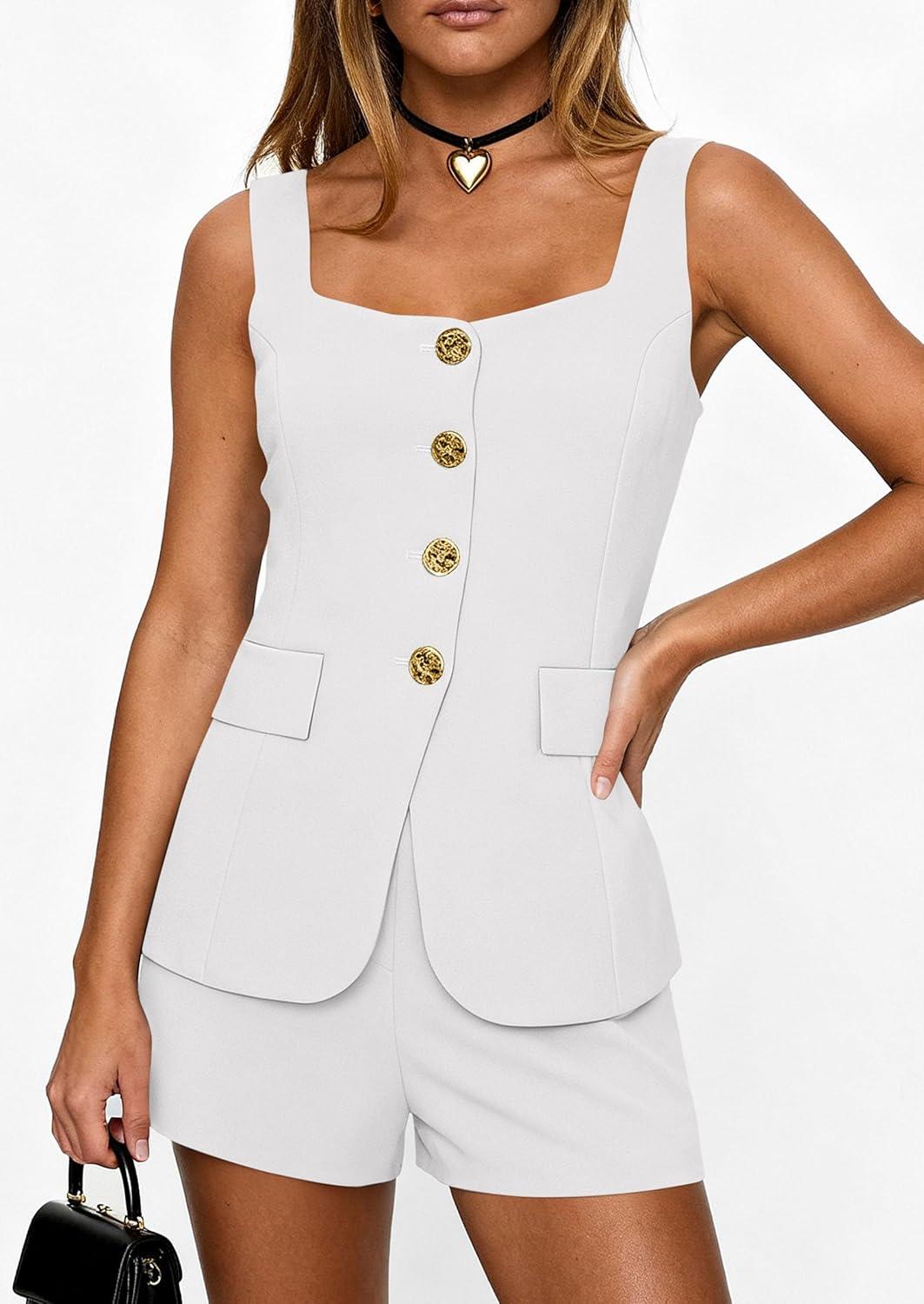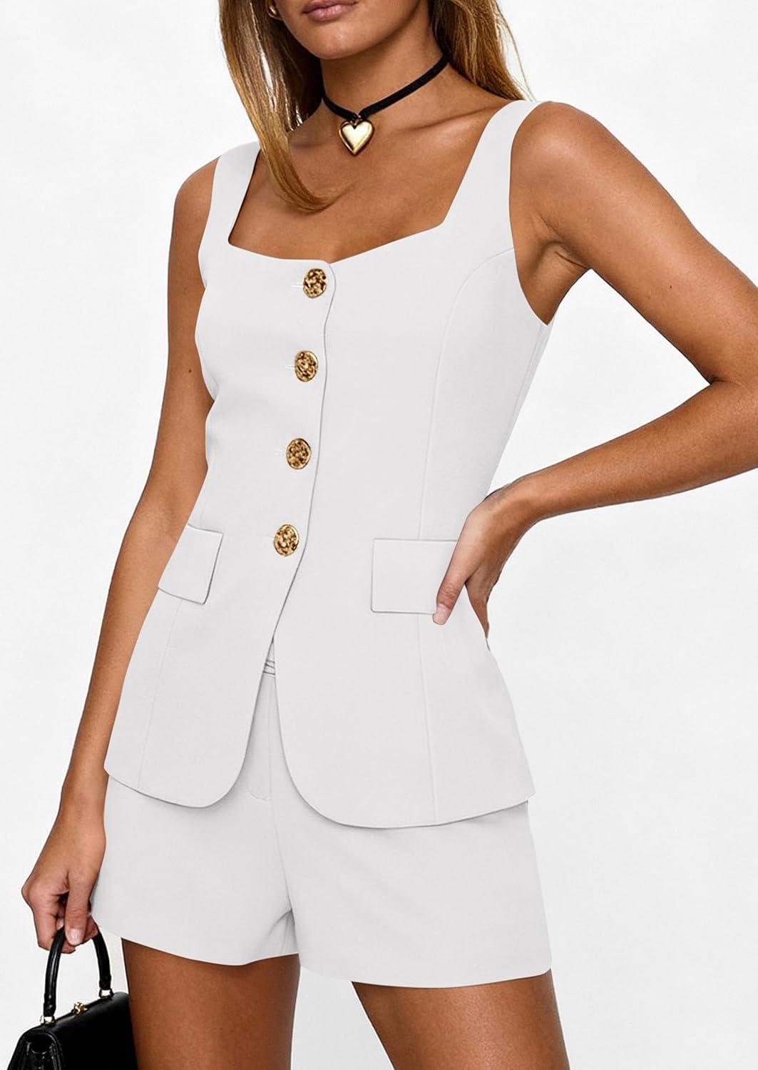 PRETTYGARDEN Womens 2 Piece Matching Sets 2026 Fashion Button Down Suit Vest Tops Shorts Set Spring Business Casual Outfits(White)