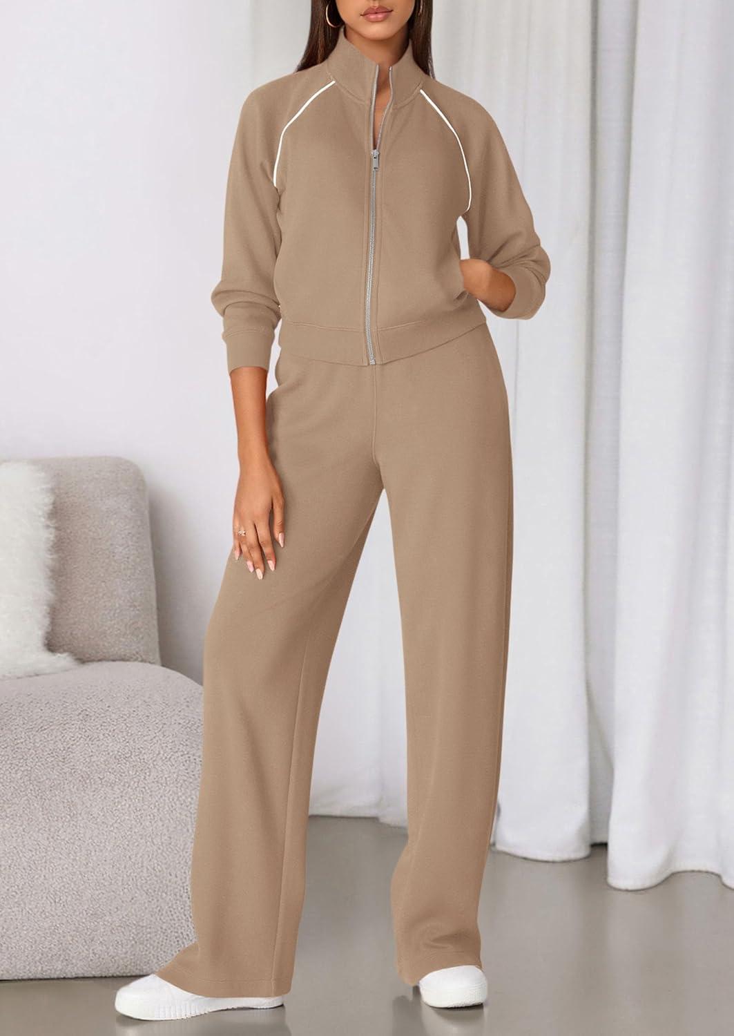 PRETTYGARDEN Womens 2 Piece Outfits Sweatsuits 2025 Fall Full Zip Sweatshirts Workout Pants Matching Lounge Sets Tracksuits(Khaki)