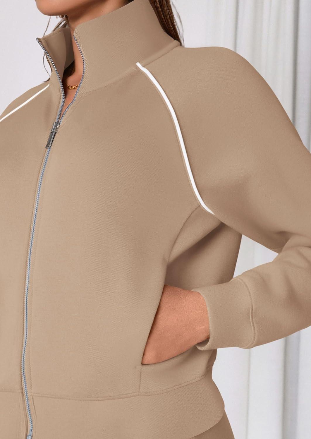 imagePRETTYGARDEN Womens 2 Piece Outfits Sweatsuits 2025 Fall Full Zip Sweatshirts Workout Pants Matching Lounge Sets TracksuitsKhaki
